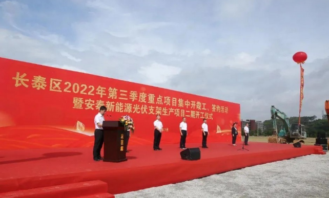 7月4日上午,漳州市長泰區(qū)舉行2022年第三季度重點(diǎn)項(xiàng)目集中開竣工、簽約活動暨安泰新能源光伏支架生產(chǎn)項(xiàng)目二期開工儀式?,F(xiàn)場,漳州市委、長泰區(qū)委等有關(guān)領(lǐng)導(dǎo)一行人參加。安泰新能源董事長黃仕塔受邀出席,并就安泰新能源二期產(chǎn)業(yè)園情況做出匯報(bào)。