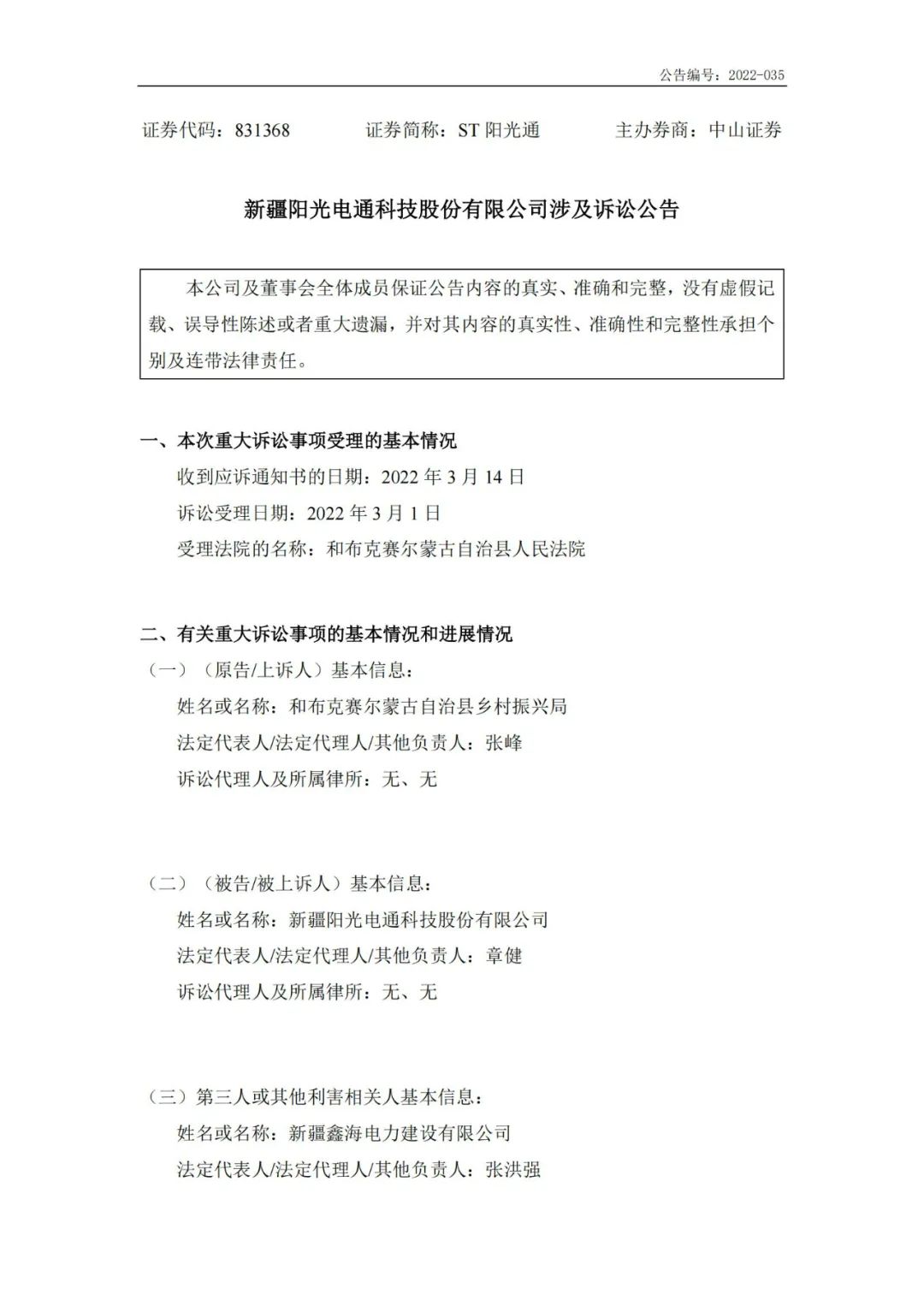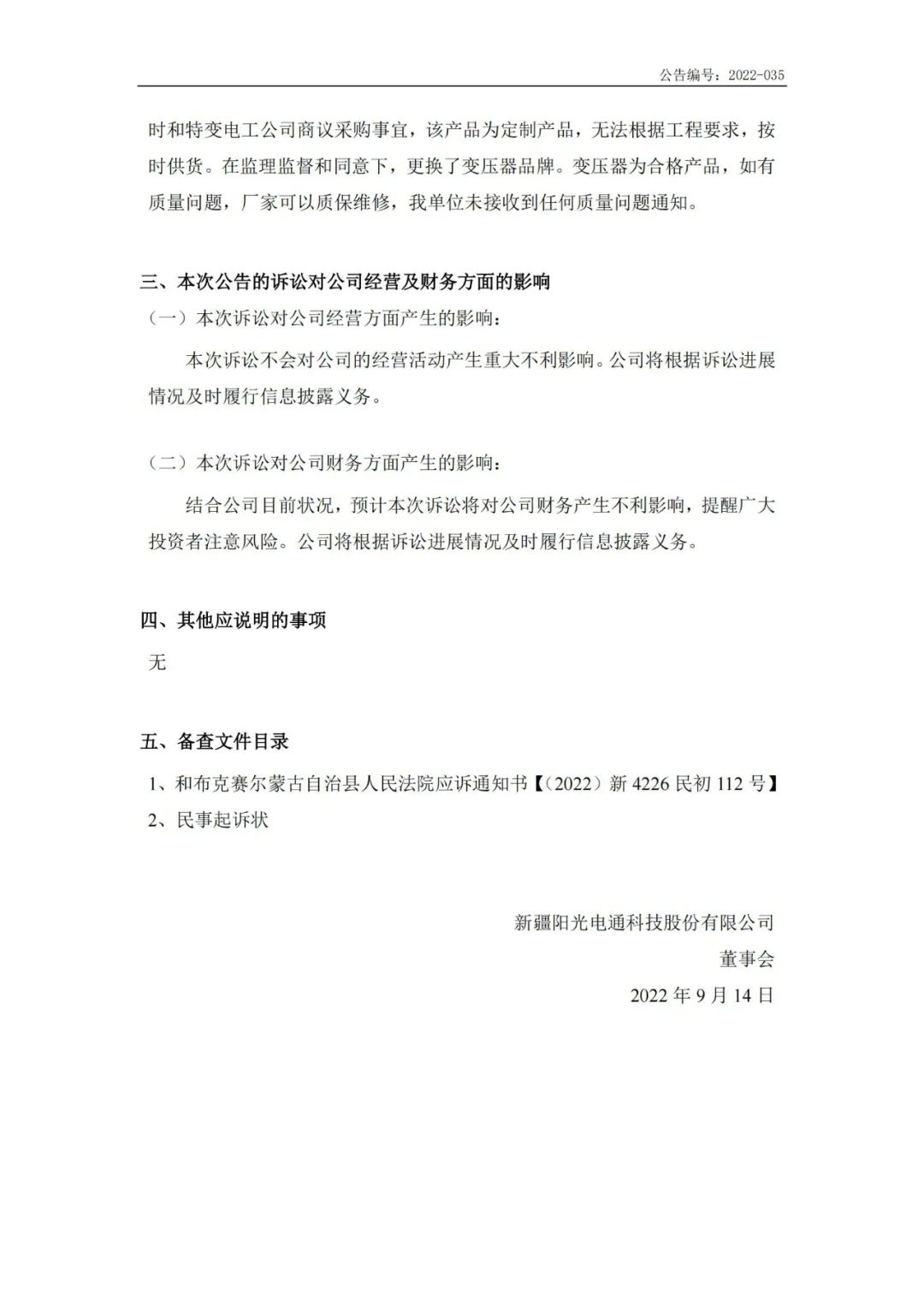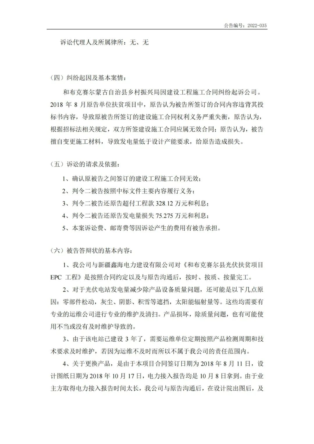 9月14日,新疆陽光電通科技股份有限公司(證券簡稱“ST陽光通”)發(fā)布訴訟公告,該訴訟案件原告為和布克賽爾蒙古自治縣鄉(xiāng)村振興局,被告為ST陽光通,第三人或其他利害相關(guān)人新疆鑫海電力建設(shè)有限公司。 糾紛起因及基本案情: 和布克賽爾蒙古自治縣鄉(xiāng)村振興局因建設(shè)工程施工合同糾紛起訴ST陽光通。 2018年8月原告單位扶貧項(xiàng)目中,原告認(rèn)為被告所簽訂的合同內(nèi)容違背其投標(biāo)書內(nèi)容,導(dǎo)致原被告所簽訂的建設(shè)施工合同權(quán)利義務(wù)嚴(yán)重失衡,原告認(rèn)為,根據(jù)招標(biāo)法相關(guān)規(guī)定,雙方所簽建設(shè)施工合同應(yīng)屬無效合同;原告認(rèn)為,被告擅自變更施工材料,導(dǎo)致發(fā)電量低于設(shè)計(jì)產(chǎn)能要求,給原告造成損失。 訴訟的請求及依據(jù): 1、確認(rèn)原被告之間簽訂的建設(shè)工程施工合同無效; 2、判令二被告按照中標(biāo)文件主要內(nèi)容履行義務(wù); 3、判令二被告還原告超付工程款328.12萬元和利息; 4、判令二被告還原告發(fā)電量損失75.275萬元和利息; 5、本案訴訟費(fèi)、郵寄費(fèi)等因訴訟產(chǎn)生的費(fèi)用有被告承擔(dān)。 被告答辯狀的基本內(nèi)容: 1、我公司與新疆鑫海電力建設(shè)有限公司對《和布克賽爾縣光伏扶貧項(xiàng)目EPC工程》是按照合同約定以及與原告溝通后,按時(shí)、按質(zhì)、按量完工。 2、對于光伏電站發(fā)電量減少除產(chǎn)品設(shè)備質(zhì)量問題,還可能是以下幾點(diǎn)原因: 零部件松動,灰塵、陰影、積雪等遮擋,太陽能輻射量等。這些均需要有專業(yè)的運(yùn)維公司進(jìn)行專業(yè)的維護(hù)及清掃。產(chǎn)品損壞,除質(zhì)量問題,也有可能使用不當(dāng)或沒有及時(shí)維護(hù)導(dǎo)致的。 3、由于該電站已建設(shè)3年了,需要運(yùn)維單位定期按照產(chǎn)品檢測周期和技術(shù)要求及時(shí)維護(hù),若因?yàn)檫\(yùn)維不及時(shí)而所以不屬于我公司的責(zé)任范圍內(nèi)。 4、關(guān)于更換產(chǎn)品,是由于本項(xiàng)目合同簽訂日期為2018年8月11日,設(shè)計(jì)圖紙日期為2018年10月17日,電力接入報(bào)告均是10月8日拿到。由于業(yè)主方取得電力接入報(bào)告時(shí)間太長,我公司與原告溝通后,在設(shè)計(jì)院出圖后,及時(shí)和供應(yīng)商商議采購事宜,該產(chǎn)品為定制產(chǎn)品,無法根據(jù)工程要求,按時(shí)供貨。在監(jiān)理監(jiān)督和同意下,更換了變壓器品牌。變壓器為合格產(chǎn)品,如有質(zhì)量問題,廠家可以質(zhì)保維修,我單位未接收到任何質(zhì)量問題通知。 公告原文如下: