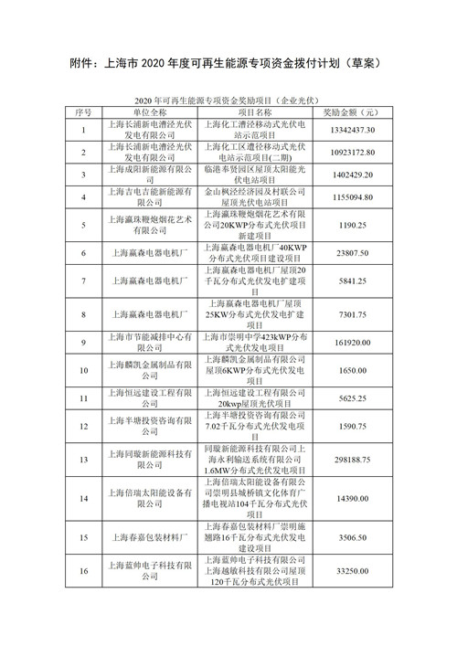 光伏補(bǔ)貼2.14億!上海市公布2020年度可再生能源專項(xiàng)資金撥付計(jì)劃草案2020-12-10 16:42來源:上海發(fā)改委作者:上海發(fā)改委瀏覽數(shù):8次