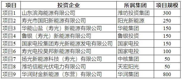此次開工項目總裝機規(guī)模200萬千瓦,項目總投資90余億元,配套建設30萬千瓦/60萬千瓦時儲能電站,通過220千伏特高壓直流輸電工程外送至全省各地,計劃于2023年年底前全部建成投運。下一步,山東將以魯北鹽堿灘涂地千萬千瓦級風光儲一體化基地建設為示范,加速推進“光伏+”基地化、規(guī)?;?shù)字化建設,力爭2025年,山東省可再生能源發(fā)電裝機規(guī)模達到9000萬千瓦。 3、項目的投資企業(yè) 魯北鹽堿灘涂地千萬千瓦風光儲一體化基地共分為9個項目,由華潤集團、濰坊投資集團、陽光電源、國家電投、華能集團等企業(yè)聯(lián)合開發(fā)