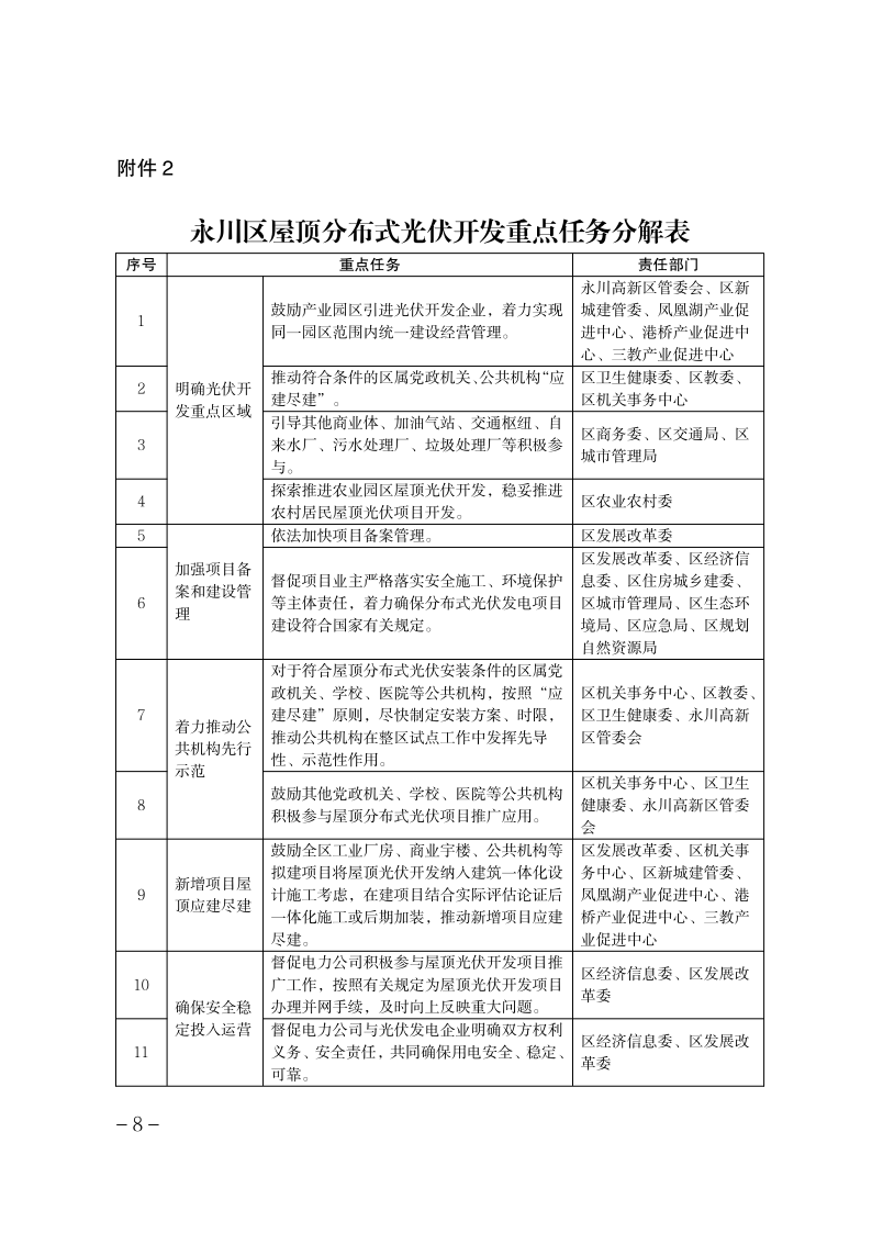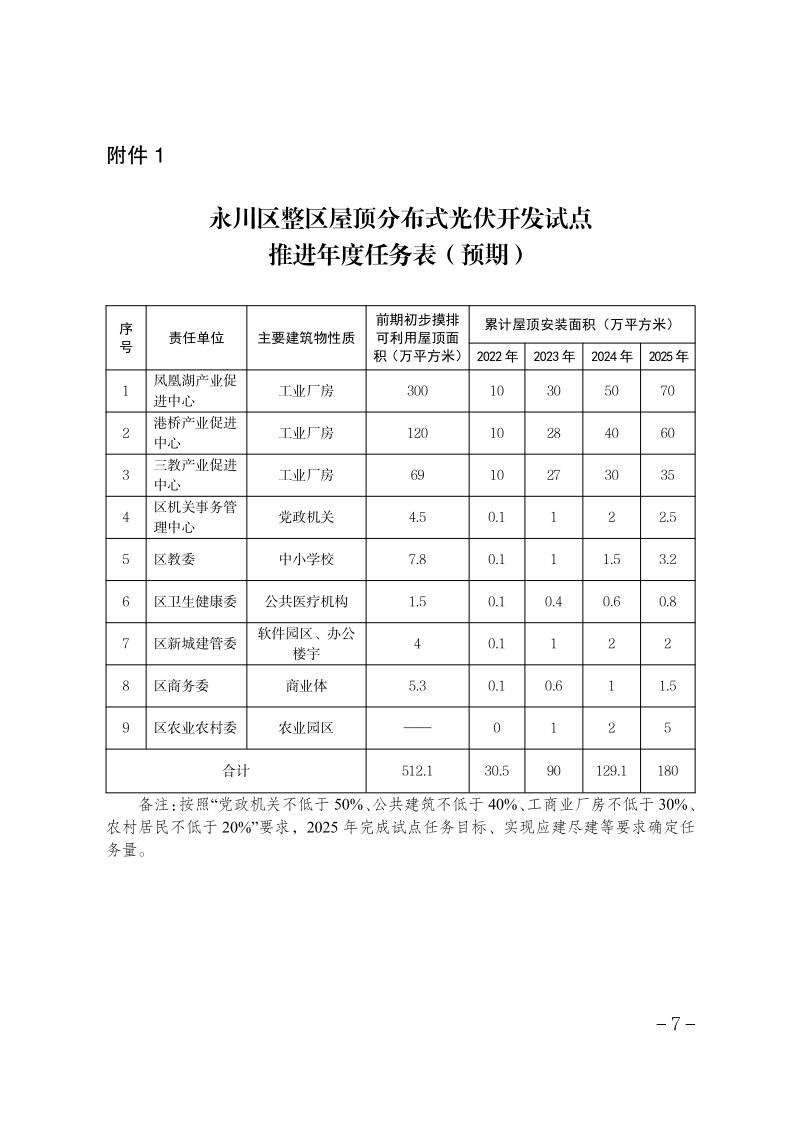 日前,重慶市永川區(qū)人民政府辦公室印發(fā)《永川區(qū)屋頂分布式光伏開發(fā)推進(jìn)方案(試行)》,方案提出到2025年底,全區(qū)安裝屋頂面積180萬(wàn)平方米,總裝機(jī)容量達(dá)21萬(wàn)千瓦,其中可安裝面積中黨政機(jī)關(guān)不低于50%、公共建筑不低于40%、工商業(yè)廠房不低于30%、農(nóng)村不低于20%,鼓勵(lì)有條件的新建項(xiàng)目實(shí)現(xiàn)“應(yīng)建盡建”。 永川區(qū)屋頂分布式光伏開發(fā)推進(jìn)方案(試行) 一、指導(dǎo)思想 深入貫徹黨的十九大和十九屆歷次全會(huì)精神,以習(xí)近平新時(shí)代中國(guó)特色社會(huì)主義思想為指導(dǎo),完整、準(zhǔn)確、全面貫徹新發(fā)展理念,認(rèn)真落實(shí)黨中央、國(guó)務(wù)院、市委市政府關(guān)于碳達(dá)峰、碳中和有關(guān)工作部署,貫徹落實(shí)區(qū)委“2235”總體發(fā)展思路,全面發(fā)掘整區(qū)屋頂分布式光伏開發(fā)發(fā)展?jié)摿?,積極推動(dòng)發(fā)展新能源特色產(chǎn)業(yè),推動(dòng)加快構(gòu)建清潔低碳、安全高效的現(xiàn)代能源體系。 二、工作目標(biāo) 到2025年底,全區(qū)安裝屋頂面積180萬(wàn)平方米,總裝機(jī)容量達(dá)21萬(wàn)千瓦,其中可安裝面積中黨政機(jī)關(guān)不低于50%、公共建筑不低于40%、工商業(yè)廠房不低于30%、農(nóng)村不低于20%,鼓勵(lì)有條件的新建項(xiàng)目實(shí)現(xiàn)“應(yīng)建盡建”。 三、成立整區(qū)屋頂分布式光伏開發(fā)試點(diǎn)工作組 由區(qū)政府主要領(lǐng)導(dǎo)任組長(zhǎng),相關(guān)分管領(lǐng)導(dǎo)任副組長(zhǎng),區(qū)政府辦公室、區(qū)發(fā)展改革委、區(qū)經(jīng)濟(jì)信息委、區(qū)商務(wù)委、區(qū)住房城鄉(xiāng)建委、區(qū)城市管理局、區(qū)教委、區(qū)衛(wèi)生健康委、區(qū)應(yīng)急局、區(qū)生態(tài)環(huán)境局、區(qū)農(nóng)業(yè)農(nóng)村委、區(qū)交通局、區(qū)機(jī)關(guān)事務(wù)中心、區(qū)國(guó)資管理中心、區(qū)規(guī)劃自然資源局、永川高新區(qū)管委會(huì)、區(qū)新城建管委、鳳凰湖產(chǎn)業(yè)促進(jìn)中心、港橋產(chǎn)業(yè)促進(jìn)中心、三教產(chǎn)業(yè)促進(jìn)中心為成員單位。辦公室設(shè)在區(qū)發(fā)展改革委。 四、重點(diǎn)任務(wù) (一)明確光伏開發(fā)重點(diǎn)區(qū)域。全區(qū)開發(fā)區(qū)域劃分為產(chǎn)業(yè)園區(qū)、城市區(qū)、農(nóng)村地區(qū)等三類區(qū)域,以工商業(yè)屋頂為重點(diǎn),以黨政機(jī)關(guān)、公共機(jī)構(gòu)屋頂為示范,以農(nóng)業(yè)園區(qū)為探索。鼓勵(lì)產(chǎn)業(yè)園區(qū)引進(jìn)光伏開發(fā)企業(yè),著力實(shí)現(xiàn)同一園區(qū)范圍內(nèi)統(tǒng)一建設(shè)經(jīng)營(yíng)管理;鼓勵(lì)引進(jìn)企業(yè)參與推動(dòng)符合條件的區(qū)屬黨政機(jī)關(guān)、公共機(jī)構(gòu)“應(yīng)建盡建”,引導(dǎo)其他商業(yè)體、加油氣站、交通樞紐、自來(lái)水廠、污水處理廠、垃圾處理廠等積極參與;探索推進(jìn)農(nóng)業(yè)園區(qū)屋頂光伏開發(fā),穩(wěn)妥推進(jìn)農(nóng)村居民屋頂光伏項(xiàng)目開發(fā)。(責(zé)任單位:區(qū)發(fā)展改革委、區(qū)商務(wù)委、區(qū)城市管理局、區(qū)衛(wèi)生健康委、區(qū)教委、區(qū)農(nóng)業(yè)農(nóng)村委、區(qū)交通局、區(qū)規(guī)劃自然資源局、區(qū)機(jī)關(guān)事務(wù)中心、永川高新區(qū)管委會(huì)、區(qū)新城建管委、鳳凰湖產(chǎn)業(yè)促進(jìn)中心、港橋產(chǎn)業(yè)促進(jìn)中心、三教產(chǎn)業(yè)促進(jìn)中心) (二)加強(qiáng)項(xiàng)目備案和建設(shè)管理。統(tǒng)籌發(fā)展和安全,營(yíng)造良好發(fā)展環(huán)境。依法加快項(xiàng)目備案管理,督促項(xiàng)目業(yè)主嚴(yán)格落實(shí)安全施工、環(huán)境保護(hù)等主體責(zé)任,著力確保分布式光伏發(fā)電項(xiàng)目建設(shè)符合國(guó)家有關(guān)規(guī)定。(責(zé)任單位:區(qū)發(fā)展改革委、區(qū)經(jīng)濟(jì)信息委、區(qū)住房城鄉(xiāng)建委、區(qū)城市管理局、區(qū)生態(tài)環(huán)境局、區(qū)應(yīng)急局、區(qū)規(guī)劃自然資源局) (三)著力推動(dòng)公共機(jī)構(gòu)先行示范。對(duì)于符合屋頂分布式光伏安裝條件的區(qū)屬黨政機(jī)關(guān)、公共機(jī)構(gòu),按照“應(yīng)建盡建”原則,盡快制定安裝方案、時(shí)限,推動(dòng)公共機(jī)構(gòu)在整區(qū)試點(diǎn)工作中發(fā)揮先導(dǎo)性、示范性作用。鼓勵(lì)其他黨政機(jī)關(guān)、學(xué)校、醫(yī)院等公共機(jī)構(gòu)積極參與屋頂分布式光伏項(xiàng)目推廣應(yīng)用。(責(zé)任單位:區(qū)機(jī)關(guān)事務(wù)中心、區(qū)教委、區(qū)衛(wèi)生健康委、永川高新區(qū)管委會(huì)) (四)新增項(xiàng)目屋頂應(yīng)建盡建。鼓勵(lì)全區(qū)工業(yè)廠房、商業(yè)宇樓、公共機(jī)構(gòu)等擬建項(xiàng)目將屋頂光伏開發(fā)納入建筑一體化設(shè)計(jì)施工考慮,在建項(xiàng)目結(jié)合實(shí)際評(píng)估論證后一體化施工或后期加裝,推動(dòng)新增項(xiàng)目應(yīng)建盡建。(責(zé)任單位:區(qū)發(fā)展改革委、區(qū)機(jī)關(guān)事務(wù)中心、區(qū)新城建管委、鳳凰湖產(chǎn)業(yè)促進(jìn)中心