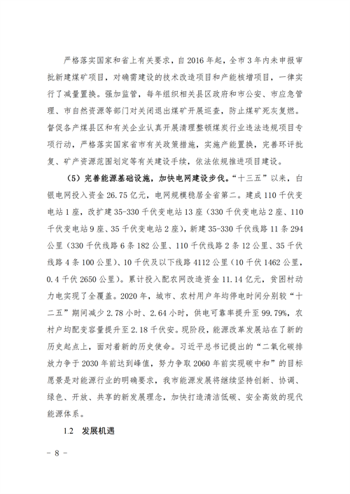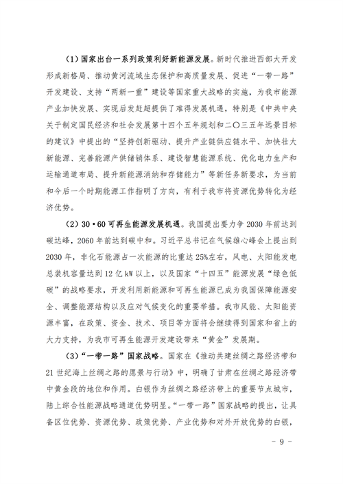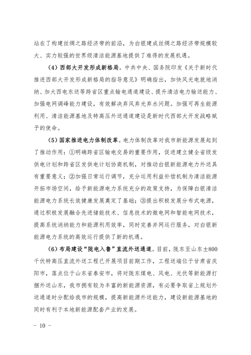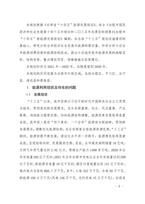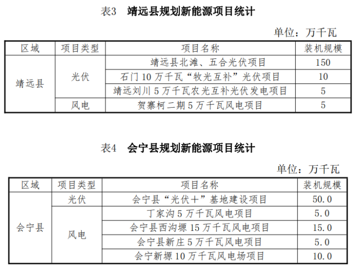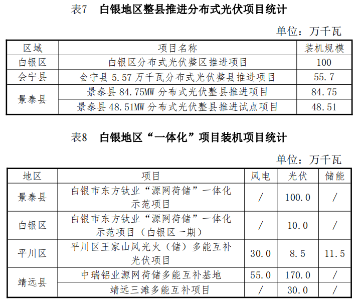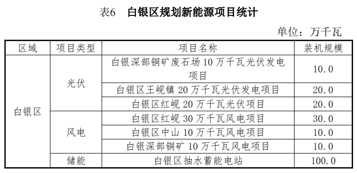 10月23日,甘肅省白銀市人民政府辦公室印發(fā)了《白銀市“十四五”能源發(fā)展規(guī)劃》的通知。規(guī)劃顯示,白銀市“十四五”期間,全市共規(guī)劃新建光伏項目252.5萬千瓦,總投資約99.74億元;新建風(fēng)電項目154萬千瓦,總投資約85.47億元;新建抽水蓄能電站2座,投資約153.2億元;新建儲能調(diào)峰項目裝機容量75萬千瓦,投資約150億元。新能源項目合計488.41億元。 全市將著力打造百萬千瓦級清潔能源基地,到2025年,力爭清潔能源裝機達到800萬千瓦以上。一是根據(jù)甘肅、山東兩省政府《聯(lián)合推進隴東至山東特高壓直流工程戰(zhàn)略合作框架協(xié)議》精神,確保“隴電入魯”特高壓項目順利實施,配套“隴電入魯”新能源規(guī)模450萬千瓦。 二是在此基礎(chǔ)上,繼續(xù)大力發(fā)展多能互補項目,整合白銀市工礦廢棄地及采煤沉陷區(qū)可利用土地和景泰沙漠(戈壁)區(qū)域,開展東方鈦業(yè)多能互補等源網(wǎng)荷儲項目。 三是根據(jù)新能源技術(shù)進步和開發(fā)成本下降情況,在景泰、靖遠、平川等風(fēng)光資源較好區(qū)域積極發(fā)展新能源項目;在會寧革命老區(qū)發(fā)展50萬千瓦風(fēng)電項目;同時鼓勵風(fēng)電企業(yè)對已有風(fēng)場老舊機組實施改造升級,力爭風(fēng)電裝機達到300萬千瓦以上。 在“十四五”規(guī)劃中,白銀市還公布了全市十四五及中長期的新能源規(guī)劃與能源規(guī)劃表。白銀全市共規(guī)劃新建光伏項目1300萬千瓦,總投資約512.3億元;新建風(fēng)電項目221萬千瓦,總投資約122.6億元;新建抽水蓄能電站2座,投資約153.2億元;新建儲能調(diào)峰項目3項,裝機容量611.5萬千瓦,投資約1223.0億元。新能源項目合計2011億元。 根據(jù)白銀地區(qū)能源規(guī)劃表,白銀市計劃在景泰縣、靖遠縣、會寧縣、平川區(qū)以及白銀區(qū)規(guī)劃風(fēng)電220.95萬千瓦,光伏1268萬千瓦,分布式光伏28.896萬千瓦,抽水蓄能200萬千瓦以及儲能611.5萬千瓦。具體規(guī)劃情況以及項目名單如下: