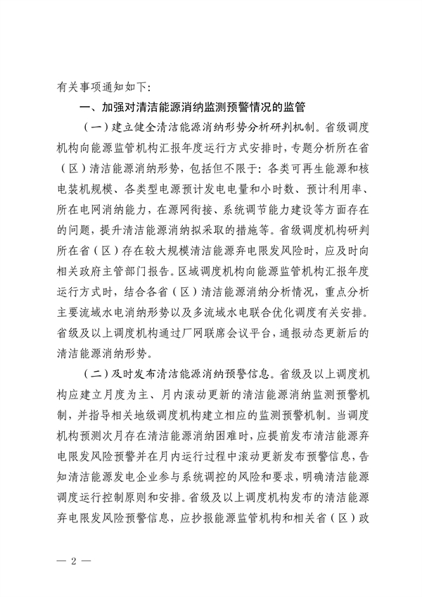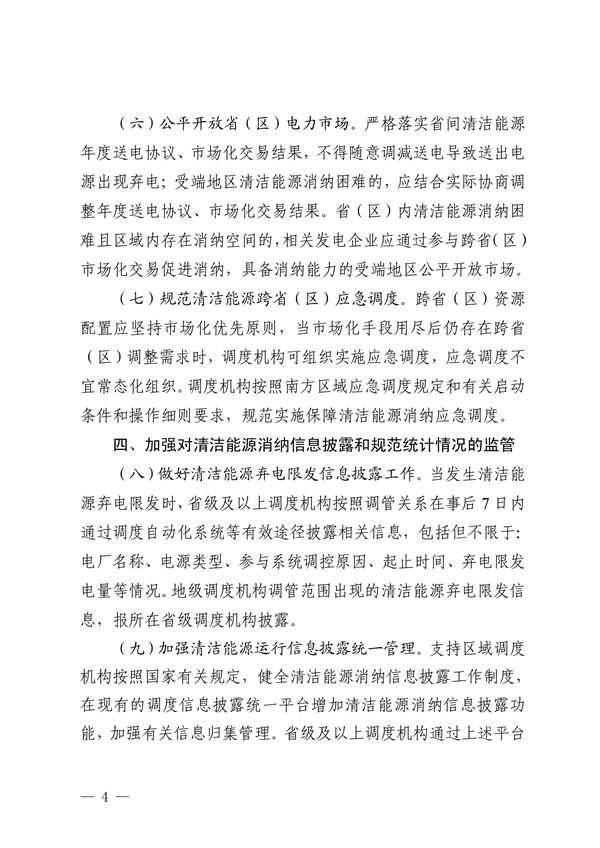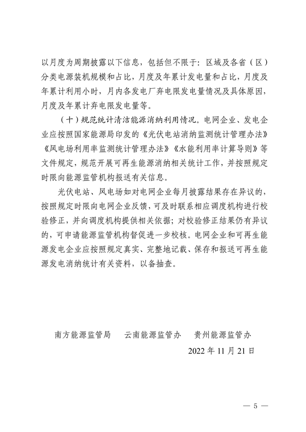 11月22日,南方能監(jiān)局印發(fā)《關(guān)于加強(qiáng)南方區(qū)域清潔能源消納監(jiān)管的通知》。 為建立健全南方區(qū)域清潔能源消納監(jiān)管機(jī)制,根據(jù)《可再生能源法》《電力監(jiān)管條例》等法律法規(guī)和國(guó)家有關(guān)清潔能源消納政策文件要求,結(jié)合2021年清潔能源消納綜合監(jiān)管成果和南方區(qū)域?qū)嶋H,南方能源監(jiān)管局會(huì)同云南、貴州能源監(jiān)管辦印發(fā)了《關(guān)于加強(qiáng)南方區(qū)域清潔能源消納監(jiān)管的通知》,現(xiàn)對(duì)通知內(nèi)容解讀如下: 清潔能源是能源轉(zhuǎn)型發(fā)展的重要力量,提高清潔能源消納水平是貫徹能源生產(chǎn)和消費(fèi)革命戰(zhàn)略,建設(shè)清潔低碳、安全高效的現(xiàn)代能源體系的有力抓手,是實(shí)現(xiàn)“碳達(dá)峰、碳中和”目標(biāo)的必然要求。南方區(qū)域清潔能源消納水平總體較高,但隨著清潔能源裝機(jī)規(guī)模不斷擴(kuò)大,由于電力系統(tǒng)調(diào)節(jié)能力不足、市場(chǎng)機(jī)制不完善等原因,局部地區(qū)、局部時(shí)段清潔能源消納問(wèn)題依然存在。為落實(shí)國(guó)家有關(guān)政策文件精神,我們組織制定了《關(guān)于加強(qiáng)南方區(qū)域清潔能源消納監(jiān)管的通知》,共四個(gè)部分10條。 第一部分是加強(qiáng)對(duì)清潔能源消納監(jiān)測(cè)預(yù)警情況的監(jiān)管。包括建立健全清潔能源消納形勢(shì)分析研判機(jī)制、及時(shí)發(fā)布清潔能源消納預(yù)警信息。要求調(diào)度機(jī)構(gòu)做好清潔能源消納形勢(shì)全面分析匯報(bào)工作,建立清潔能源消納監(jiān)測(cè)預(yù)警機(jī)制,預(yù)測(cè)存在消納困難時(shí),提前發(fā)布棄電限發(fā)風(fēng)險(xiǎn)預(yù)警并滾動(dòng)更新信息,按規(guī)定報(bào)送能源監(jiān)管機(jī)構(gòu)和相關(guān)?。▍^(qū))政府主管部門(mén)。發(fā)電企業(yè)要加強(qiáng)水情和新能源功率預(yù)測(cè)系統(tǒng)運(yùn)行和應(yīng)用,提高準(zhǔn)確性和時(shí)效性。 第二部分是加強(qiáng)對(duì)清潔能源科學(xué)調(diào)度、公平調(diào)度的監(jiān)管。包括合理安排清潔能源消納發(fā)電調(diào)度計(jì)劃、堅(jiān)持清潔能源公平調(diào)度原則、明確特殊運(yùn)行方式期間或緊急情況下清潔能源調(diào)控原則。調(diào)度機(jī)構(gòu)要在保障電網(wǎng)安全和電力可靠供應(yīng)前提下,合理編制清潔能源發(fā)電調(diào)度計(jì)劃并組織實(shí)施,依法依規(guī)公平調(diào)用同類(lèi)型清潔能源機(jī)組,按程序制定特殊運(yùn)行方式期間清潔能源調(diào)控原則,明確各類(lèi)電源發(fā)電次序及清潔能源棄電限發(fā)安排原則。 第三部分是加強(qiáng)對(duì)清潔能源跨省(區(qū))消納情況監(jiān)管。包括公平開(kāi)放省(區(qū))電力市場(chǎng)、規(guī)范清潔能源跨?。▍^(qū))應(yīng)急調(diào)度。要求嚴(yán)格落實(shí)省間清潔能源年度送電協(xié)議、市場(chǎng)化交易結(jié)果,不得隨意調(diào)減送電導(dǎo)致送出電源出現(xiàn)棄電。存在消納困難的,發(fā)電企業(yè)通過(guò)市場(chǎng)化交易促進(jìn)消納。調(diào)度機(jī)構(gòu)要按照南方區(qū)域應(yīng)急調(diào)度規(guī)定的啟動(dòng)條件和操作細(xì)則要求,規(guī)范實(shí)施保障清潔能源消納應(yīng)急調(diào)度。 第四部分是加強(qiáng)對(duì)清潔能源消納信息披露和規(guī)范統(tǒng)計(jì)情況的監(jiān)管。包括做好清潔能源棄電限發(fā)信息披露工作、加強(qiáng)清潔能源運(yùn)行信息披露統(tǒng)一管理、規(guī)范統(tǒng)計(jì)清潔能源消納利用情況。要求調(diào)度機(jī)構(gòu)要健全清潔能源消納信息披露工作制度,以月度為周期披露清潔能源運(yùn)行信息,要在發(fā)生清潔能源棄電限發(fā)后7日內(nèi)通過(guò)調(diào)度自動(dòng)化系統(tǒng)等有效途徑披露相關(guān)信息。電網(wǎng)企業(yè)、發(fā)電企業(yè)應(yīng)按照規(guī)定,規(guī)范開(kāi)展可再生能源消納相關(guān)統(tǒng)計(jì)工作,并按照規(guī)定時(shí)限向能源監(jiān)管機(jī)構(gòu)報(bào)送有關(guān)信息。 詳情如下: