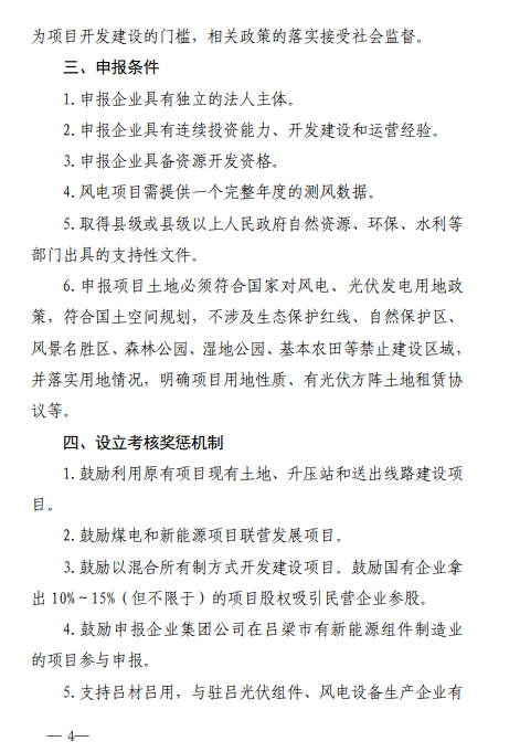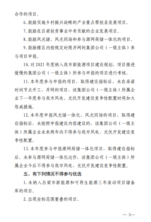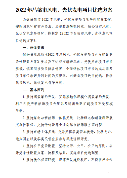 近日,山西省呂梁市能源局發(fā)布《2022年呂梁市風(fēng)電、光伏發(fā)電項(xiàng)目?jī)?yōu)選方案》的通知。方案指出,堅(jiān)持優(yōu)化營(yíng)商環(huán)境,規(guī)范開(kāi)發(fā)建設(shè)秩序,不得將產(chǎn)業(yè)作為項(xiàng)目開(kāi)發(fā)建設(shè)的門(mén)檻,相關(guān)政策的落實(shí)接受社會(huì)監(jiān)督。 原文如下: