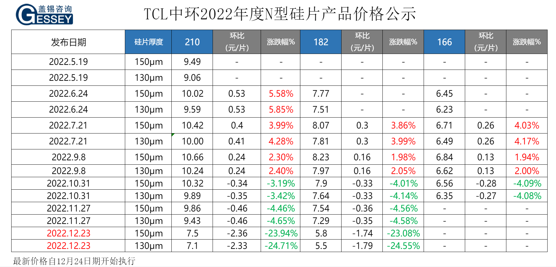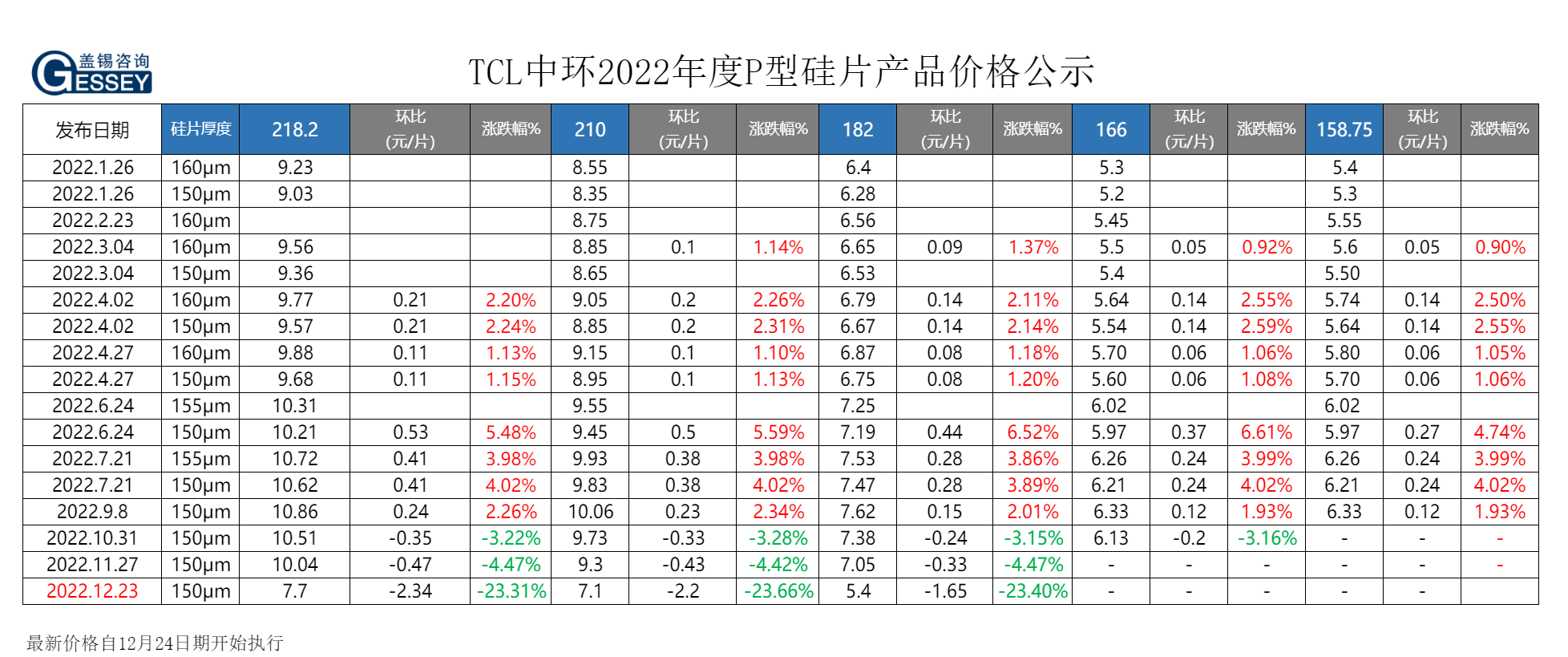 TCL中環(huán)關(guān)于12月23日單晶硅片價(jià)格公示