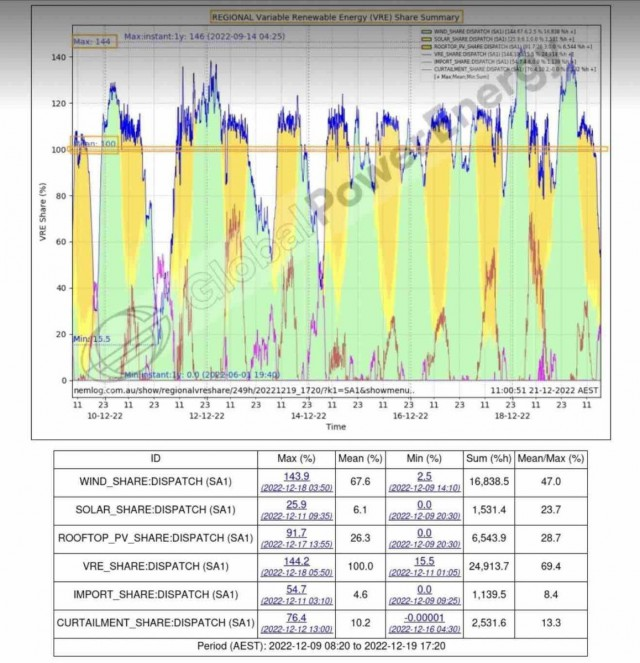 據(jù)外媒報(bào)道,南澳大利亞州剛剛創(chuàng)下了一個(gè)行業(yè)紀(jì)錄一—光伏系統(tǒng)和風(fēng)力發(fā)電設(shè)施的平均發(fā)電量連續(xù)10多天超過(guò)當(dāng)?shù)?00%的電力需求。 而目前世界上沒(méi)有其他這樣大規(guī)模的可再生能源發(fā)電設(shè)施能夠完全滿足電力需求,或者能夠在如此長(zhǎng)的時(shí)間內(nèi)持續(xù)供電。 行業(yè)媒體表示,南澳大利亞州在此之前完成連續(xù)7天的風(fēng)電和光伏系統(tǒng)的電力供應(yīng),其平均發(fā)電量達(dá)到電力需求的104%,這個(gè)結(jié)果更加令人印象深刻。 數(shù)據(jù)提供商GPE NemLog2公司表示,從當(dāng)?shù)貢r(shí)間12月9日08:20到12月19日17:20,風(fēng)力發(fā)電設(shè)施和光伏系統(tǒng)的平均發(fā)電量達(dá)到了當(dāng)?shù)仉娏π枨蟮?00%,其持續(xù)時(shí)間為10天9小時(shí)(共249小時(shí))。 在此期間,屋頂光伏系統(tǒng)發(fā)電量達(dá)到26.3%,并占到大部分的白天發(fā)電量,甚至高達(dá)當(dāng)?shù)匦枨蟮?2%。 在這10天中,發(fā)電量最大的是風(fēng)力發(fā)電設(shè)施,占到67.6%,而大規(guī)模光伏系統(tǒng)的發(fā)電量?jī)H為6.1%。