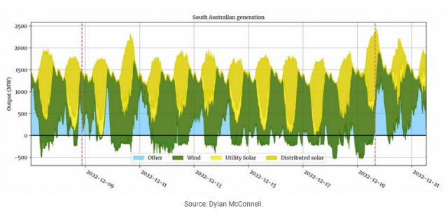 新南威爾士大學(xué)的Dylan McConnell引用OpenNEM的數(shù)據(jù),并提出了另一種觀點(diǎn)。他認(rèn)為,實(shí)現(xiàn)100%可再生能源發(fā)電的時(shí)間為10天18小時(shí)45分鐘,這段時(shí)間的平均價(jià)格為-3.26美元/MWh。 McConnell認(rèn)為,削減的風(fēng)力發(fā)電量相當(dāng)于發(fā)電潛力的10%,而削減大規(guī)模光伏發(fā)電量相當(dāng)于發(fā)電潛力的35%。 造成這一現(xiàn)象的主要原因是需求緊縮,尤其是在中午時(shí)分,屋頂光伏成為焦點(diǎn),其發(fā)電量占電力需求的92%,導(dǎo)致價(jià)格為負(fù)。一些風(fēng)力發(fā)電場(chǎng)和光伏發(fā)電場(chǎng)在電價(jià)降至零以下時(shí)被迫關(guān)閉。 南澳大利亞州目前還沒(méi)有足夠的儲(chǔ)能系統(tǒng)來(lái)存儲(chǔ)過(guò)剩的電力,但至少可以部分解決這一問(wèn)題,因?yàn)橹辽僖贐lyth、Bungama和TailemBend部署三個(gè)大型電池儲(chǔ)能系統(tǒng),而且還要部署更多的儲(chǔ)能系統(tǒng),同時(shí)還要連接新南威爾士州的電網(wǎng)。 風(fēng)力發(fā)電設(shè)施和光伏系統(tǒng)的多余電力也可以被綠色氫氣電解槽采用——這既可以吸收剩余的電力,也可以為大型氫氣發(fā)電廠供電,以便在可再生能源發(fā)電量不足的時(shí)候?yàn)殡娋W(wǎng)提供綠色電力。 目前還有很多大規(guī)模的風(fēng)力發(fā)電設(shè)施和光伏系統(tǒng)正在并網(wǎng),以增加更多的容量,其中包括Goyder South能源樞紐。 在由風(fēng)力發(fā)電設(shè)施和光伏系統(tǒng)的平均發(fā)電量100%供電的10天期間,南澳大利亞州還運(yùn)營(yíng)一些天然氣發(fā)電設(shè)施,這并不是為了滿足電力需求,而是為了提高電力系統(tǒng)強(qiáng)度和提供其他重要的電網(wǎng)服務(wù)。 在幾年后,當(dāng)南澳大利亞州建成通往新南威爾士州的電力線路,以及部署更多模擬燃煤發(fā)電、天然氣發(fā)電和水力發(fā)電特性的“電網(wǎng)形成”的電池儲(chǔ)能系統(tǒng)時(shí),天然氣發(fā)電可能會(huì)變得多余。 人們還將看到一個(gè)更顯著的里程碑:吉瓦規(guī)模的電網(wǎng)在一段時(shí)間內(nèi)僅靠風(fēng)力發(fā)電和光伏發(fā)電系統(tǒng)的電力運(yùn)行,可以不采用化石燃料發(fā)電設(shè)施的電力。
