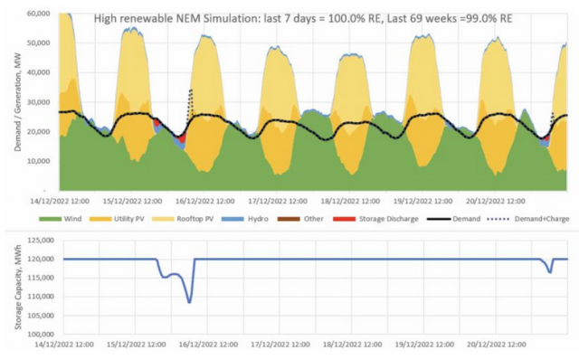 與此同時(shí),能源專(zhuān)家David Osmond模擬了澳大利亞可再生能源每周發(fā)電的潛力,認(rèn)為澳大利亞只需部署少量電池儲(chǔ)能系統(tǒng)。 他說(shuō),“創(chuàng)紀(jì)錄的光伏和風(fēng)力發(fā)電量,導(dǎo)致發(fā)電量過(guò)剩,而且在一周內(nèi)幾乎不需要采用儲(chǔ)能系統(tǒng)存儲(chǔ)電力?!彼a(bǔ)充說(shuō),這意味著電網(wǎng)可以100%使用可再生能源的電力,而在過(guò)去69周內(nèi),這一比例達(dá)到了99%。