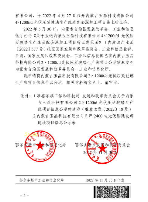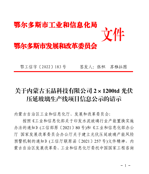 1月6日,內(nèi)蒙古自治區(qū)工業(yè)和信息化廳發(fā)布關(guān)于內(nèi)蒙古玉晶科技有限公司日產(chǎn)2400噸光伏壓延玻璃建設項目信息的公示,原文如下: 根據(jù)《工業(yè)和信息化部關(guān)于印發(fā)水泥玻璃行業(yè)產(chǎn)能置換實施辦法的通知》(工信部原〔2021〕80號)等文件精神,結(jié)合聽證意見以及工業(yè)和信息化部、國家發(fā)改委預警意見,現(xiàn)將內(nèi)蒙古玉晶科技有限公司日產(chǎn)2400噸光伏壓延玻璃建設項目信息予以公示,公示期自公示之日起10個工作日,歡迎社會公眾進行監(jiān)督。 自治區(qū)工信廳電話:0471-4826506 自治區(qū)發(fā)展和改革委電話:0471-6659365 附件:1.內(nèi)蒙古玉晶科技有限公司日產(chǎn)2400噸光伏壓延玻璃建設項目信息公示表 2.關(guān)于內(nèi)蒙古玉晶玻璃科技有限公司2×1200td光伏壓延玻璃生產(chǎn)線項目信息公示的請示(鄂工信字〔2022〕183號) 內(nèi)蒙古自治區(qū)工業(yè)和信息化廳 內(nèi)蒙古自治區(qū)發(fā)展和改革委員會 2023年1月5日