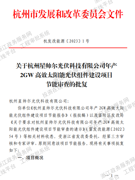 1月11日,浙江杭州市發(fā)改委關于杭州星帥爾光伏科技有限公司年產(chǎn)2GW高效太陽能光伏組件建設項目節(jié)能審查的批復,經(jīng)第三方審核和專家評審,原則同意該項目節(jié)能報告。批復文件附后。 原文如下: 關于杭州星帥爾光伏科技有限公司年產(chǎn)2GW高效太陽能光伏組件建設項目節(jié)能審查的批復 杭州星帥爾光伏科技有限公司: 你單位《杭州星帥爾光伏科技有限公司年產(chǎn)2GW高效太陽能光伏組件建設項目節(jié)能報告》(報批稿)以及富陽區(qū)發(fā)改局《關于要求對杭州星帥爾光伏科技有限公司年產(chǎn)2GW高效太陽能光伏組件建設項目節(jié)能審查的請示》(富發(fā)改能源〔2022〕54號)等相關材料收悉。受浙江省發(fā)改委委托,經(jīng)第三方審核和專家評審,原則同意該項目節(jié)能報告。批復文件附后。 附件:關于杭州星帥爾光伏科技有限公司年產(chǎn)2GW高效太陽能光伏組件建設項目節(jié)能審查的批復 杭州市發(fā)展和改革委員會 2023年1月11日