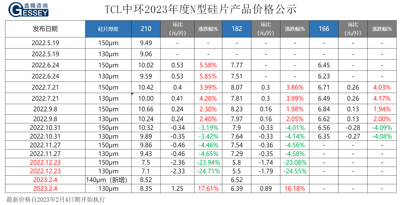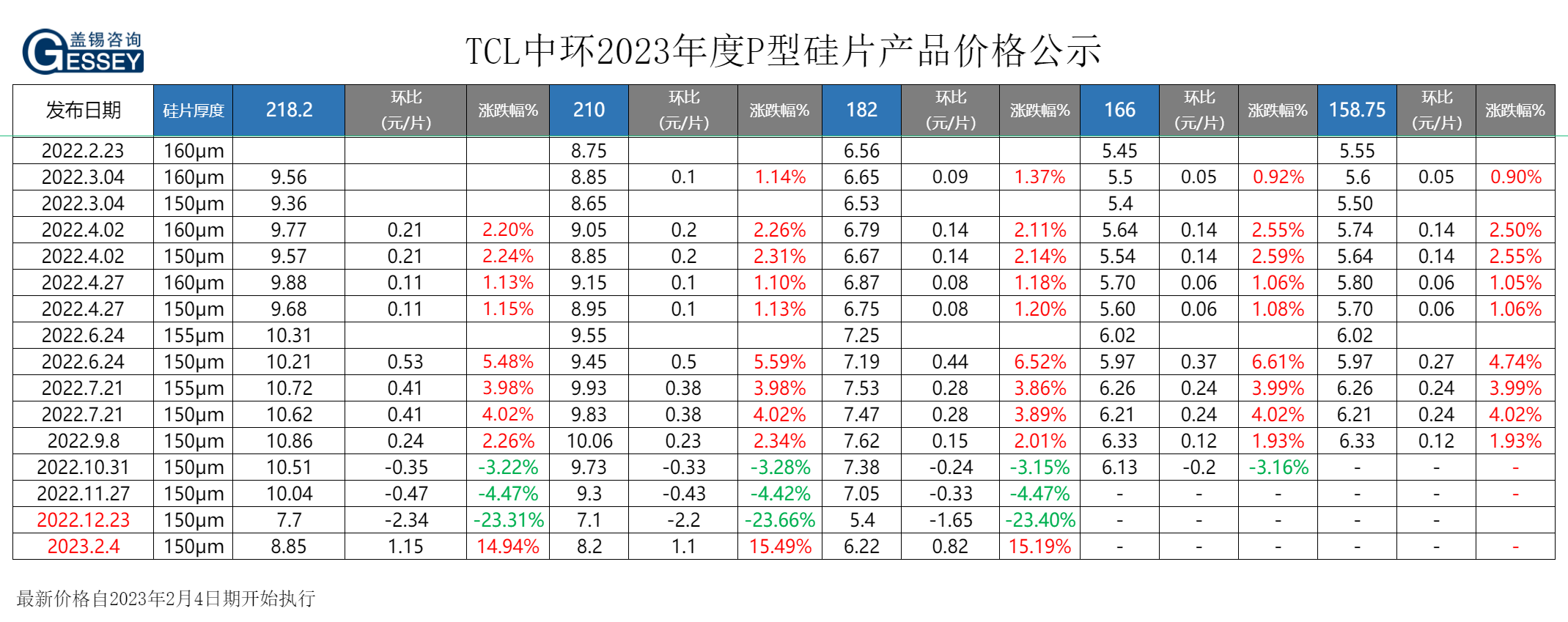TCL中環(huán)關于2023年2月4日單晶硅片價格公示