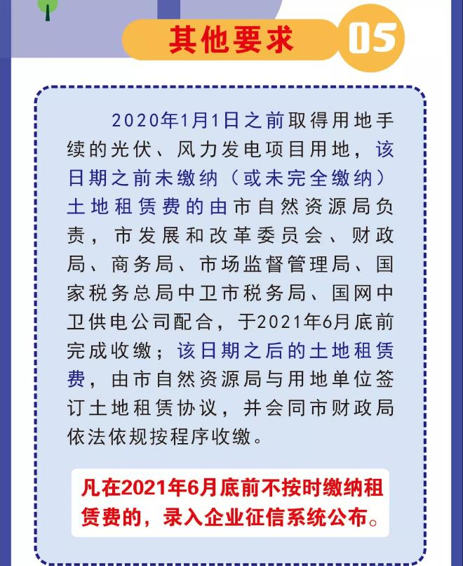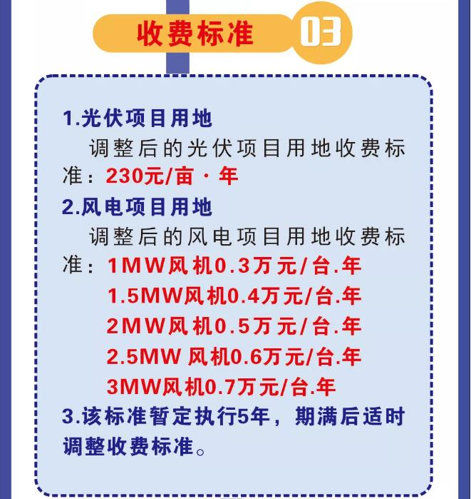 2021年1月7日,寧夏中衛(wèi)市人民政府辦公室發(fā)布《關于調整新能源光伏、風力發(fā)電項目用地租賃費收費標準的通知》,文件規(guī)定收取范圍為沙坡頭區(qū)轄區(qū)內新能源光伏發(fā)電項目的電池組件、列陣占地(永久性建設用地除外)以及風力發(fā)電項目風機基站用地。調整后的光伏項目用地收費標準:230元/畝·年。該標準暫定執(zhí)行5年,期滿后適時調整收費標準。 收費期限:2020年1月1日前取得用地手續(xù)的光伏、風力發(fā)電項目,土地租賃費到期未繳納(或未完全繳納),該日期之前的使用年期按原收費標準一次性收取租賃費;該日期之后的使用年期按新標準收取租賃費。2020年1月1日之后取得用地手續(xù)的光伏、風力發(fā)電項目土地租賃費按新標準實施,每3年收取一次租賃費。 全文如下: 市人民政府 關于調整新能源光伏、風力發(fā)電項目用地租賃費收費標準的通知 衛(wèi)政規(guī)發(fā)〔2021〕1號 各縣(區(qū))人民政府(管委會),市政府各部門、直屬機構: 為規(guī)范新能源產業(yè)用地行為,確保全市新能源產業(yè)健康發(fā)展,決定對我市沙坡頭區(qū)新能源光伏、風力發(fā)電項目土地租賃費收費標準進行調整?,F(xiàn)將有關事宜通知如下: 一、收取范圍 沙坡頭區(qū)轄區(qū)內新能源光伏發(fā)電項目的電池組件、列陣占地(永久性建設用地除外)以及風力發(fā)電項目風機基站用地。 二、收費標準 (一)光伏項目用地。 調整后的光伏項目用地收費標準:230元/畝·年。 (二)風電項目用地。 調整后的風電項目用地收費標準:1MW風機0.3萬元/臺.年,1.5MW風機0.4萬元/臺.年,2MW風機0.5萬元/臺.年,2.5MW風機0.6萬元/臺.年,3MW風機0.7萬元/臺.年。 (三)該標準暫定執(zhí)行5年,期滿后適時調整收費標準。 三、收費期限 2020年1月1日前取得用地手續(xù)的光伏、風力發(fā)電項目,土地租賃費到期未繳納(或未完全繳納),該日期之前的使用年期按原收費標準一次性收取租賃費;該日期之后的使用年期按新標準收取租賃費。2020年1月1日之后取得用地手續(xù)的光伏、風力發(fā)電項目土地租賃費按新標準實施,每3年收取一次租賃費。 四、其他要求 (一)2020年1月1日之前取得用地手續(xù)的光伏、風力發(fā)電項目用地,該日期之前未繳納(或未完全繳納)土地租賃費的,由市自然資源局負責,市發(fā)展和改革委員會、財政局、商務局、市場監(jiān)督管理局、國家稅務總局中衛(wèi)市稅務局、國網中衛(wèi)供電公司配合,于2021年6月底前完成收繳;該日期之后的土地租賃費,由市自然資源局與用地單位簽訂土地租賃協(xié)議,并會同市財政局依法依規(guī)按程序收繳。凡在2021年6月底前不按時繳納租賃費的,錄入企業(yè)征信系統(tǒng)公布。 (二)2020年1月1日之后取得用地手續(xù)的光伏發(fā)電項目用地,市自然資源局按照《建設項目用地預審與選址意見書》確定的用地范圍(除去永久性建設用地),核定電池組件和列陣用地面積,與用地單位簽訂土地租賃協(xié)議,待用地單位向市財政繳清土地租賃費后,市自然資源局依法辦理用地手續(xù);2020年1月1日之后取得用地手續(xù)的風電項目,市自然資源局根據市發(fā)展和改革委員會核準的發(fā)電機組容量與用地單位簽訂土地租賃協(xié)議,待用地單位向市財政繳清土地租賃費后,市自然資源局依法依規(guī)按程序辦理用地手續(xù)。 (三)該通知自發(fā)布之日起施行,中寧縣、海原縣可參照本標準執(zhí)行。市人民政府《關于新能源光伏、風力發(fā)電項目用地收取租賃費的通知》(衛(wèi)政發(fā)〔2014〕183號)同時廢止。 (四)本通知由市自然資源局負責解釋。 中衛(wèi)市人民政府 2021年1月7日 (此件公開發(fā)布)