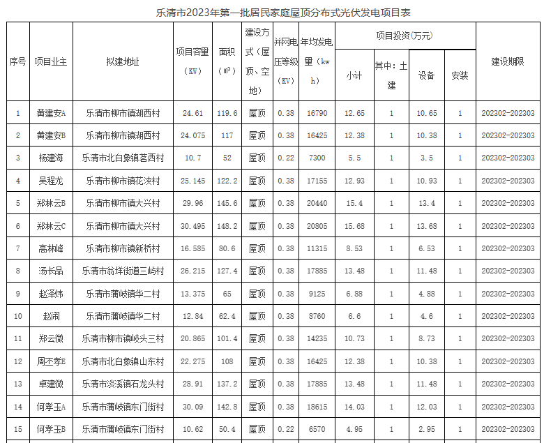 2月20日,浙江關于樂清市2023年第一批居民家庭屋頂分布式光伏發(fā)電項目備案的通知印發(fā),本批次共有居民家庭屋頂分布式光伏發(fā)電項目34個,總裝機容量624.28kWp,年平均發(fā)電量452400kWh。 原文如下: 關于樂清市2023年第一批居民家庭屋頂分布式光伏發(fā)電項目備案的通知 國網浙江樂清市供電公司: 貴公司報送的樂清市居民家庭屋頂分布式光伏發(fā)電項目備案申請材料已收悉,根據(jù)《浙江省光伏發(fā)電項目管理暫行辦法》(浙發(fā)改能源〔2014〕450號)《樂清市人民政府關于扶持分布式光伏發(fā)電的若干意見》(樂政發(fā)〔2014〕29號),現(xiàn)予以集中備案,并就備案有關事項通知如下: 一、本批次共有居民家庭屋頂分布式光伏發(fā)電項目34個,總裝機容量624.28kWp,年平均發(fā)電量452400kWh。項目情況詳見附表。 二、本備案通知書有效期一年,自備案之日起計;有效期內未開工建設的,貴公司應在備案通知書有效期滿30日前向我局申請延期。逾期不報,備案通知書自動失效。 三、已備案項目發(fā)生變更的,應辦理相應的變更手續(xù)。 四、居民家庭屋頂分布式光伏發(fā)電項目屬自然人項目,我局委托貴公司組織驗收。 五、本備案通知書不可作為項目所依托的建筑物符合城鄉(xiāng)、土地等相關規(guī)劃的認定依據(jù)。 附件:樂清市2023年第一批居民家庭屋頂分布式光伏發(fā)電項目表 樂清市發(fā)展和改革局 2023年2月15日