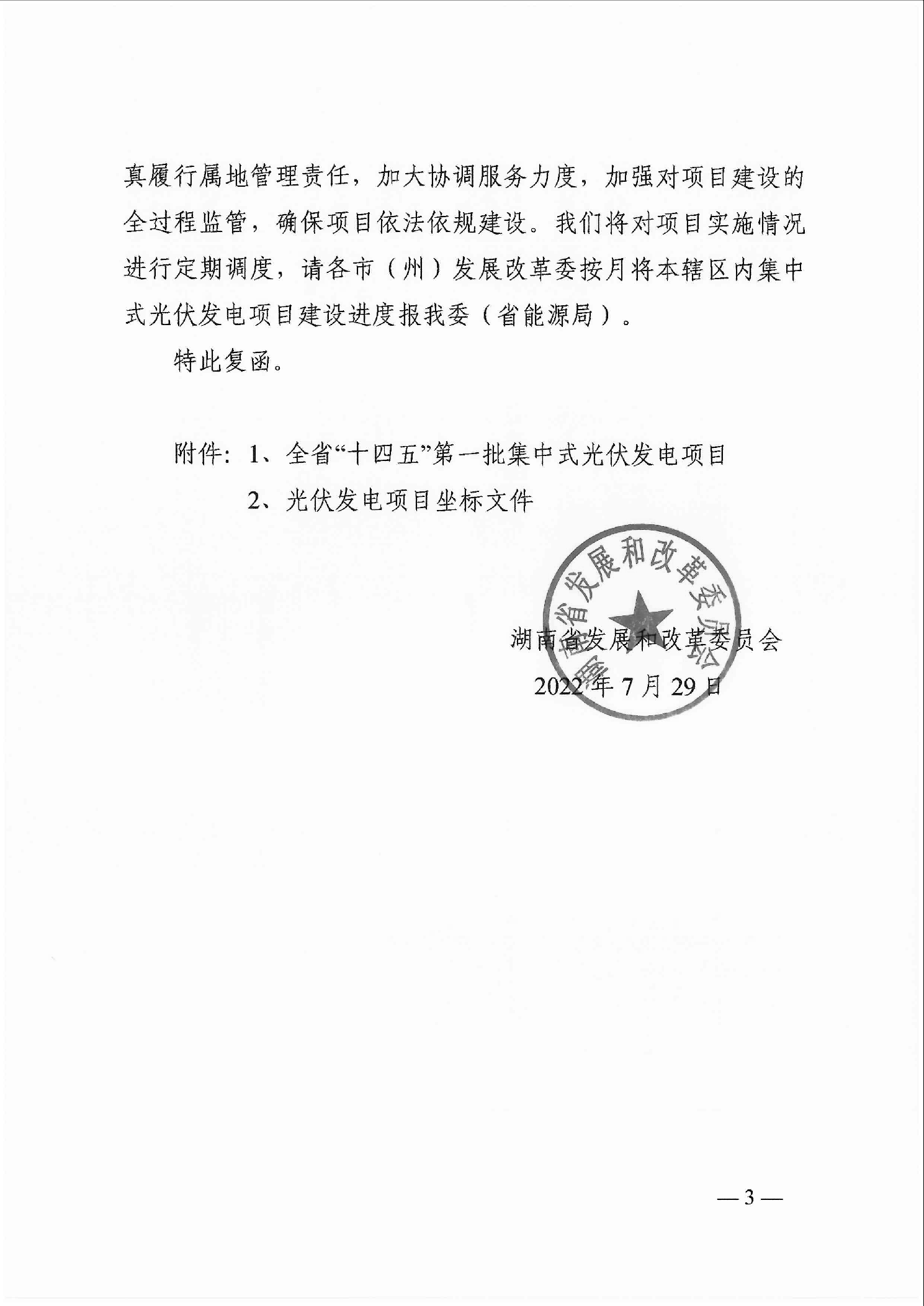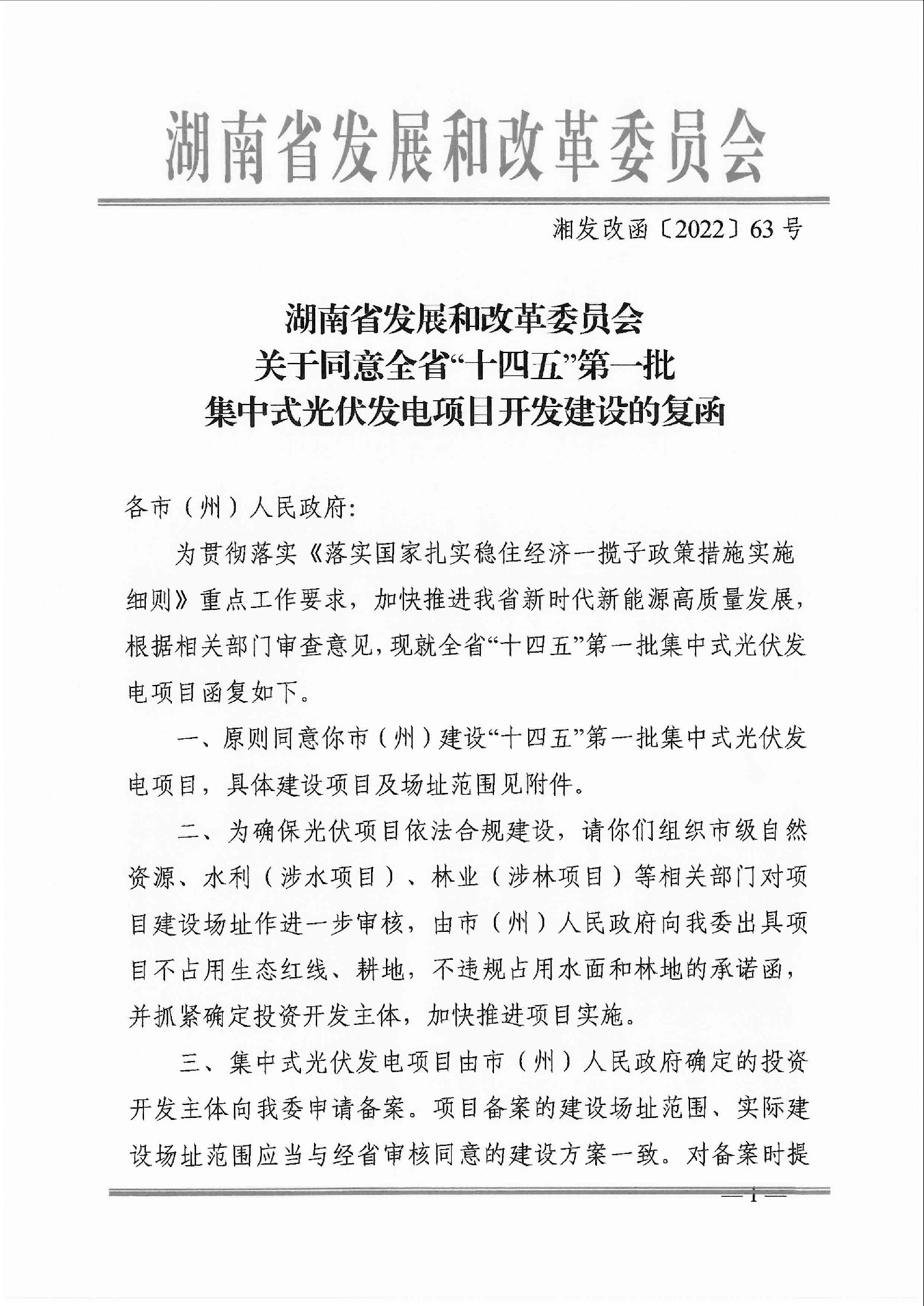 湖南省發(fā)展和改革委員會關(guān)于同意全省“十四五”第一批集中式光伏發(fā)電項目開發(fā)建設(shè)的復函2023-03-10 15:30來源:gessey瀏覽數(shù):331次