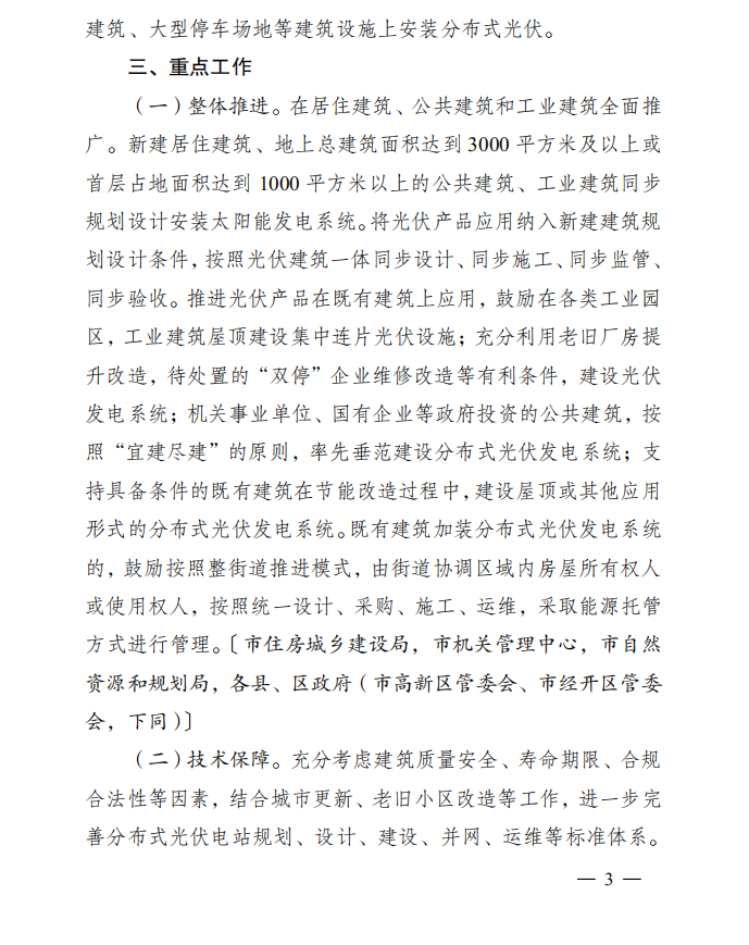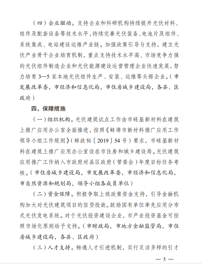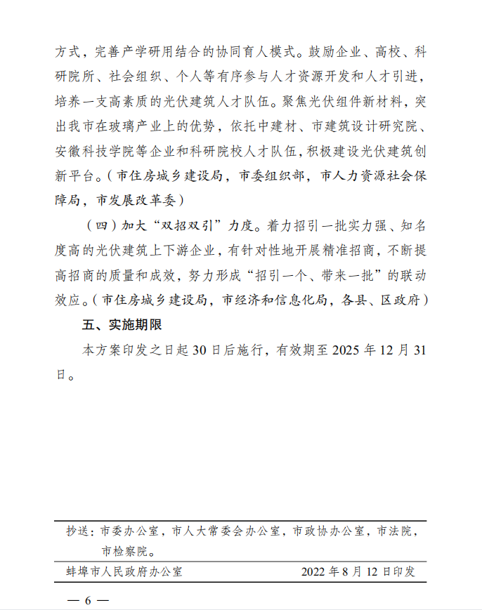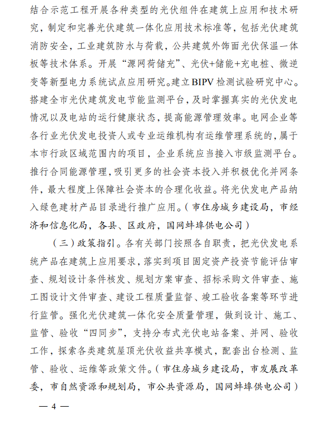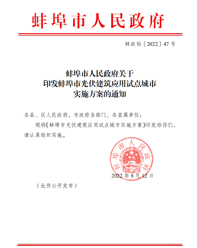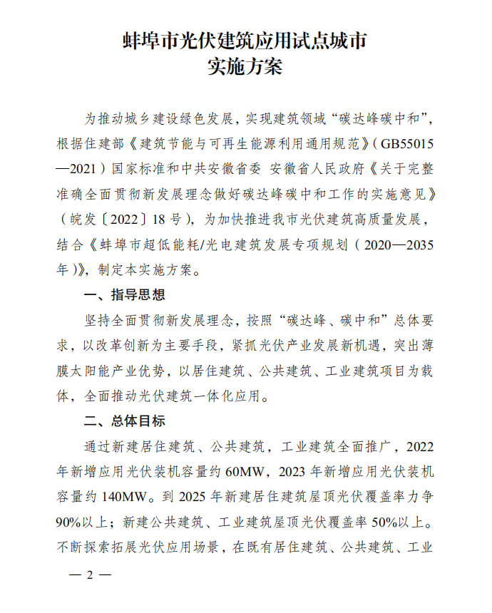 3月16日,安徽省蚌埠市人民政府發(fā)布蚌埠市住房和城鄉(xiāng)建設(shè)局黨組成員、副局長丁寒關(guān)于對《蚌埠市光伏建筑應(yīng)用試點(diǎn)城市實(shí)施方案》的解讀。 解讀如下: 問:什么叫光伏建筑? 答:光伏建筑,全稱是光伏建筑一體化,是將太陽能光伏發(fā)電系統(tǒng)與建筑有機(jī)結(jié)合,為建筑提供清潔電力。根據(jù)應(yīng)用形式不同分為建材型,即光伏電池與建材完全融合,如光伏瓦、光伏屋頂、光電玻璃。構(gòu)件型,即將光伏發(fā)電系統(tǒng)與建筑遮陽、防雨等建筑構(gòu)件結(jié)合,如光伏車棚、光伏遮陽板等。安裝型,即在建筑屋面或者墻面安裝太陽能光伏組件,這是目前最常見的應(yīng)用形式。 問:光伏建筑是否有資金獎勵? 答:有的。首先按照二星級標(biāo)準(zhǔn)設(shè)計(jì)的達(dá)到一定規(guī)模的綠色建筑,以及裝配率達(dá)到50%以上的裝配式建筑,可申報(bào)省級示范項(xiàng)目,并可獲得一定數(shù)額的獎補(bǔ)資金。目前我市正值光伏建筑試點(diǎn)期,應(yīng)用效果好的BIPV、儲能等項(xiàng)目可申報(bào)示范項(xiàng)目,經(jīng)評審獲評的示范項(xiàng)目,給予一定數(shù)額的獎補(bǔ)資金。 問:光伏建筑應(yīng)用試點(diǎn)城市開展情況如何? 答:我市前期開展了大量探索實(shí)踐工作,2019年7月市政府成立蚌埠市新材料推廣應(yīng)用工作領(lǐng)導(dǎo)小組,其中硅基新材料在建筑上推廣應(yīng)用辦公室,設(shè)在蚌埠市住房和城鄉(xiāng)建設(shè)局,以薄膜太陽能發(fā)電產(chǎn)品應(yīng)用為主推方向。 一是試點(diǎn)先行。我市前期試點(diǎn)大量項(xiàng)目并取得良好的經(jīng)濟(jì)和社會效益,如市體育中心、文化館、8.5代TFT-LCD玻璃基板光伏建筑一體化項(xiàng)目等新建建筑。此外還有曹山工業(yè)設(shè)計(jì)小鎮(zhèn)、市政府綜合樓、皖北國土交易中心辦公樓等既有建筑項(xiàng)目,成功試點(diǎn)應(yīng)用薄膜太陽能發(fā)電系統(tǒng),并實(shí)現(xiàn)網(wǎng)發(fā)電,另有大量在建建筑項(xiàng)目設(shè)計(jì)應(yīng)用了薄膜太陽能發(fā)電系統(tǒng)產(chǎn)品。 二是堅(jiān)持規(guī)劃引領(lǐng)。率先編制并發(fā)布了《蚌埠市超低能耗/光電建筑發(fā)展專項(xiàng)規(guī)劃(2020-2035年)》。通過本規(guī)劃的編制和實(shí)施,可以實(shí)現(xiàn)超低能耗/光電建筑及相關(guān)領(lǐng)域綠色發(fā)展,帶動薄膜太陽能發(fā)電等可再生能源相關(guān)產(chǎn)業(yè)發(fā)展。 三是強(qiáng)化政策扶持。2022年8月,蚌埠市政府印發(fā)《蚌埠市光伏建筑應(yīng)用試點(diǎn)城市實(shí)施方案》,以居住建筑、公共建筑、工業(yè)建筑項(xiàng)目為載體,全面推動光伏建筑一體化應(yīng)用。 四是完善標(biāo)準(zhǔn)體系。編制完成并發(fā)布實(shí)施《薄膜太陽能發(fā)電系統(tǒng)與建筑一體化技術(shù)規(guī)程》(蚌埠市地方標(biāo)準(zhǔn)),是國內(nèi)第一個發(fā)布實(shí)施的地市,對建筑工程規(guī)劃設(shè)計(jì)、施工安裝、驗(yàn)收運(yùn)維薄膜太陽能發(fā)電系統(tǒng)進(jìn)行了規(guī)范。2021年1月,完成《薄膜太陽能發(fā)電系統(tǒng)與建筑一體化構(gòu)造圖集》。2022年8月,由中建材玻璃院牽頭編制的安徽省團(tuán)標(biāo)《薄膜太陽能光伏與建筑一體化技術(shù)規(guī)程》已發(fā)布。 五是促進(jìn)產(chǎn)業(yè)發(fā)展。目前我市基本形成光伏建筑“材料-生產(chǎn)-安裝-運(yùn)維”的全產(chǎn)業(yè)鏈發(fā)展,探索出城市建設(shè)低碳發(fā)展新路徑。 政策全文如下: