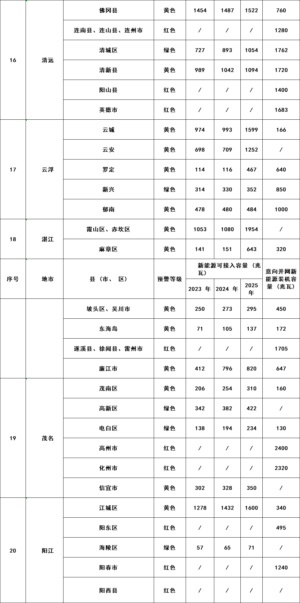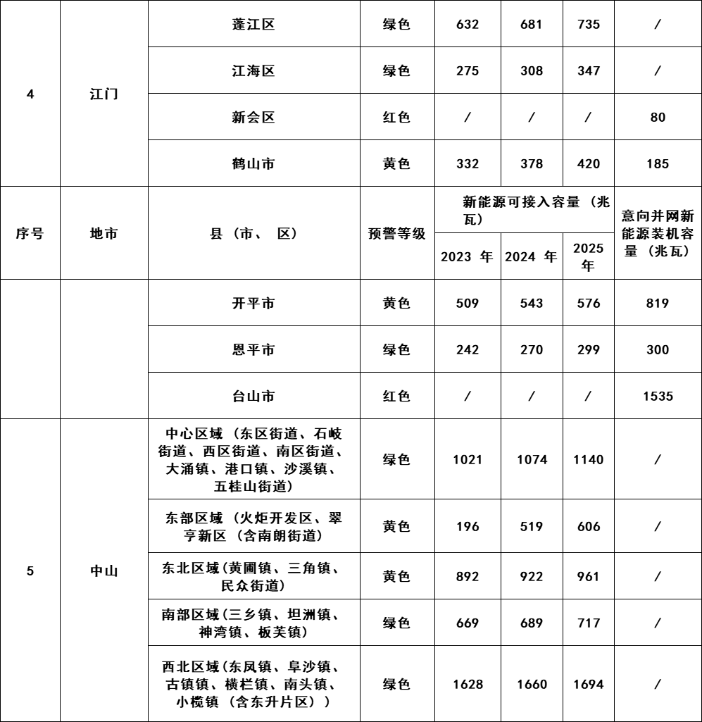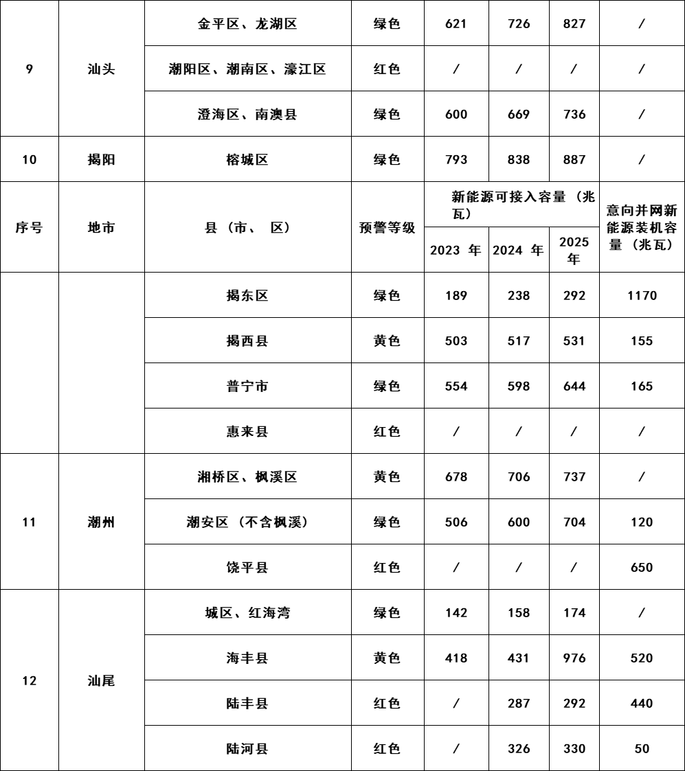 注: 1.考慮全省新能源在建項目后,新能源接入預(yù)警等級分為 “綠色、黃色、紅色”3 種顏色標(biāo)識: 綠色區(qū)域,表示本地消納裕度充足, “可接入容量”為以就地消納主、不考慮外送情況下測算結(jié)果,鼓勵新能源優(yōu)先在此區(qū)域開發(fā); 黃色區(qū)域,表示新能源無法在本地消納, “可接入容量”為考慮外送通道約束情況下測算結(jié)果,建議提前與電網(wǎng)公司溝通具體消納條件; 紅色區(qū)域,表示新能源無法在本地消納,且外送通道已基本滿載,建議集中式新能源項目待消納條件改善后安排新增建設(shè)計劃。 2.各縣域范圍新能源可接入容量預(yù)測評估結(jié)果, 受區(qū)域內(nèi)負(fù)荷變化情況等因素影響,存在一定的不確定性,上述分析結(jié)果僅供新能源業(yè)主參考,不作為新能源接入并網(wǎng)保證或承諾。