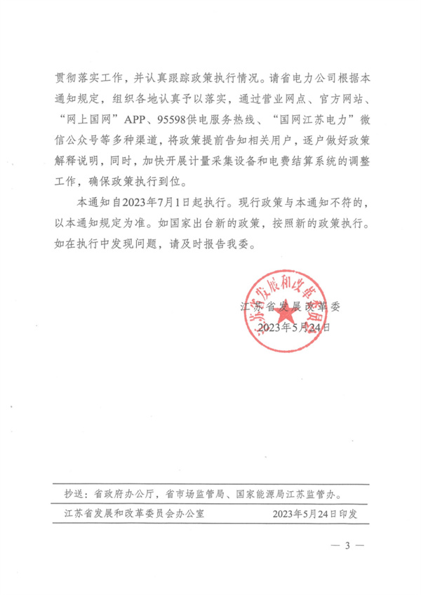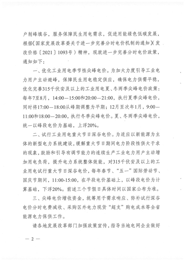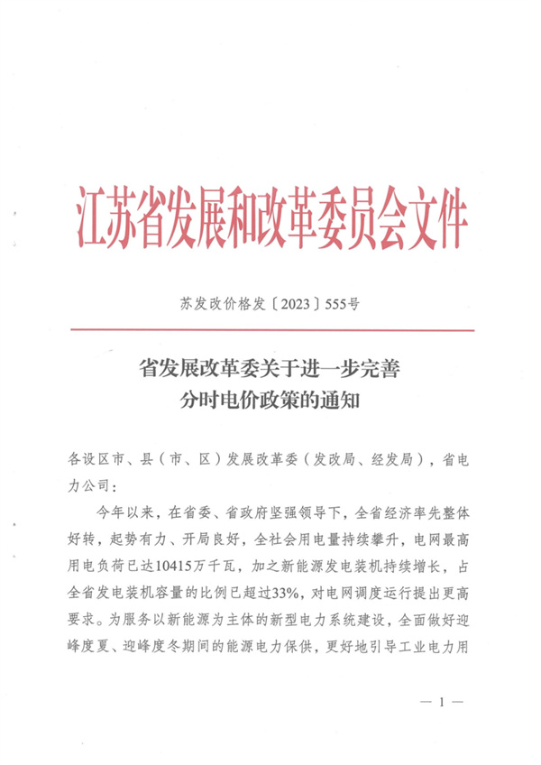 5月24日,江蘇省發(fā)改委發(fā)布關(guān)于進(jìn)一步完善分時(shí)電價(jià)政策的通知,其中提出,全面做好迎峰度夏、迎峰度冬期間的能源電力保供,更好地引導(dǎo)工業(yè)電力用戶削峰填谷,服務(wù)保障民生用電需求,促進(jìn)用能綠色低碳發(fā)展,現(xiàn)進(jìn)一步完善分時(shí)電價(jià)政策,具體內(nèi)容如下: 一、優(yōu)化工業(yè)用電季節(jié)性尖峰電價(jià)。為加大力度引導(dǎo)工業(yè)電力用戶主動(dòng)避峰,保障民生用電穩(wěn)定供應(yīng),確保電力供需平穩(wěn),優(yōu)化完善315千伏安及以上的工業(yè)用電夏、冬兩季尖峰電價(jià)政策:每年7至8月,14:00-15:00和20:00-21:00,執(zhí)行夏季尖峰電價(jià),同時(shí)將17:00-18:00從峰期調(diào)整為平期;12月至次年1月,9:00-11:00和18:00-20:00,執(zhí)行冬季尖峰電價(jià)。夏、冬兩季尖峰電價(jià),統(tǒng)一以峰段電價(jià)為基礎(chǔ),上浮20%。 二、試行工業(yè)用電重大節(jié)日深谷電價(jià)。為適應(yīng)以新能源為主體的新型電力系統(tǒng)建設(shè),緩解重大節(jié)日期間電力階段性供大于求的現(xiàn)象,鼓勵(lì)和引導(dǎo)有調(diào)節(jié)能力的連續(xù)生產(chǎn)工業(yè)電力用戶主動(dòng)增加用電負(fù)荷,提升電力系統(tǒng)整體效能,對(duì)315千伏安及以上的工業(yè)用電試行重大節(jié)日深谷電價(jià),每年春節(jié)、“五一”國(guó)際勞動(dòng)節(jié)、國(guó)慶節(jié)期間,11:00-15:00,在平段電價(jià)基礎(chǔ)上,以峰段電價(jià)為計(jì)算基礎(chǔ),下浮20%。前述三個(gè)節(jié)假日具體時(shí)間以國(guó)家公布為準(zhǔn)。 三、尖峰電價(jià)增收資金,統(tǒng)籌用于需求響應(yīng)、彌補(bǔ)試行深谷電價(jià)分時(shí)電費(fèi)減收、采購(gòu)區(qū)外電力現(xiàn)貨“超支”購(gòu)電成本等全省能源電力保供工作。請(qǐng)各地發(fā)展改革部門加強(qiáng)政策宣傳,指導(dǎo)當(dāng)?shù)仉娋W(wǎng)企業(yè)做好貫徹落實(shí)工作,并認(rèn)真跟蹤政策執(zhí)行情況。本通知自2023年7月1日起執(zhí)行。現(xiàn)行政策與本通知不符的,以本通知規(guī)定為準(zhǔn)。如國(guó)家出臺(tái)新的政策,按照新的政策執(zhí)行。 全文如下: