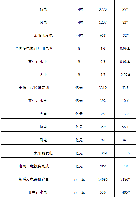 注:1.全社會用電量為全口徑數(shù)據(jù),全國供電量為調(diào)度口徑數(shù)據(jù)。2.“同比增長”列中,標(biāo)*的指標(biāo)為絕對量;標(biāo)▲的指標(biāo)為百分點(diǎn)。