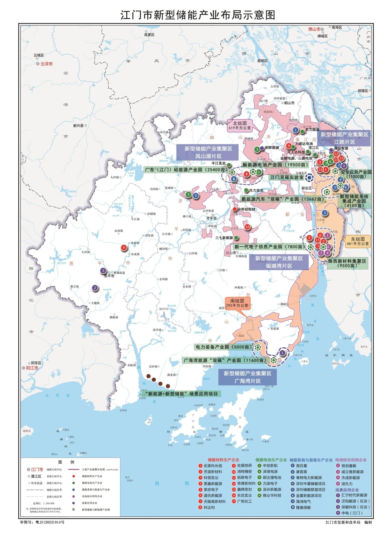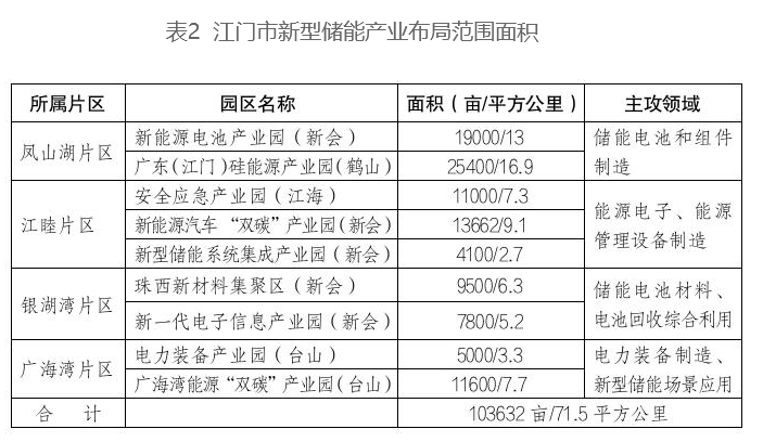 二、發(fā)展布局 根據(jù)我市產(chǎn)業(yè)發(fā)展基礎(chǔ)、資源配套條件及環(huán)境承載能力,精準(zhǔn)定位細(xì)分領(lǐng)域,統(tǒng)籌構(gòu)建新型儲能產(chǎn)業(yè)“一基地四片區(qū)”的發(fā)展格局。 ——“一基地”:根據(jù)省在新型儲能產(chǎn)業(yè)發(fā)展方面賦予江門建設(shè)儲能電池產(chǎn)業(yè)集聚區(qū)、正極材料集聚區(qū)、電池回收利用產(chǎn)業(yè)集聚區(qū)等功能定位,依托現(xiàn)有產(chǎn)業(yè)基礎(chǔ)和龍頭骨干企業(yè),串聯(lián)電池制造、電池材料、系統(tǒng)集成、回收利用、儲能應(yīng)用等全產(chǎn)業(yè)鏈,壯大江門儲能電池制造規(guī)模,加快拓展建設(shè)儲能應(yīng)用示范項(xiàng)目,在全市范圍內(nèi)全力打造省新型儲能產(chǎn)業(yè)基地。 ——“四片區(qū)”:總面積超70平方公里,主要包括鳳山湖、江睦、銀湖灣、廣海灣四個相對集中的片區(qū)。其中,鳳山湖片區(qū)面積約30平方公里,包括新能源電池產(chǎn)業(yè)園、廣東(江門)硅能源產(chǎn)業(yè)園,重點(diǎn)建設(shè)儲能電池和電池組件生產(chǎn)基地。江睦片區(qū)面積19.1平方公里,包括安全應(yīng)急產(chǎn)業(yè)園、新能源汽車“雙碳”產(chǎn)業(yè)園、新型儲能系統(tǒng)集成產(chǎn)業(yè)園,重點(diǎn)招引一批能源電子及能源管理設(shè)備制造項(xiàng)目,打造新型儲能系統(tǒng)集成集聚區(qū)。銀湖灣片區(qū)面積11.5平方公里,包括珠西新材料集聚區(qū)、新一代電子信息產(chǎn)業(yè)園,依托已布局多家電池材料和電池回收企業(yè),重點(diǎn)建設(shè)新型儲能電池材料生產(chǎn)和電池回收資源循環(huán)綜合利用基地。廣海灣片區(qū)面積11平方公里,包括電力裝備產(chǎn)業(yè)園、廣海灣能源“雙碳”產(chǎn)業(yè)園,重點(diǎn)建設(shè)電力裝備制造和新型儲能場景應(yīng)用基地。