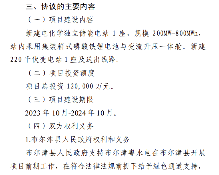 10月12日,廣東水電二局股份有限公司(以下簡(jiǎn)稱“粵水電”)全資孫公司布爾津縣粵水電能源有限公司,與布爾津縣人民政府簽訂《布爾津縣粵水電能源有限公司項(xiàng)目投資協(xié)議》。 布爾津粵水電擬在布爾津縣新建電化學(xué)獨(dú)立儲(chǔ)能電站1座,規(guī)模200MW-800MWh,站內(nèi)采用集裝箱式磷酸鐵鋰電池與變流升壓一體艙,新建220千伏變電站1座及送出線路。項(xiàng)目總投資12億元。布爾津縣電化學(xué)200MW/800MWh獨(dú)立儲(chǔ)能電站項(xiàng)目,已取得新疆維吾爾自治區(qū)伊犁哈薩克自治州阿勒泰地區(qū)發(fā)展和改革委員會(huì)備案 , 項(xiàng)目代碼為:2309-654321-60-01-992098。