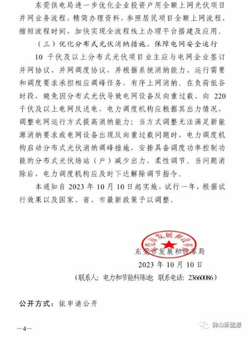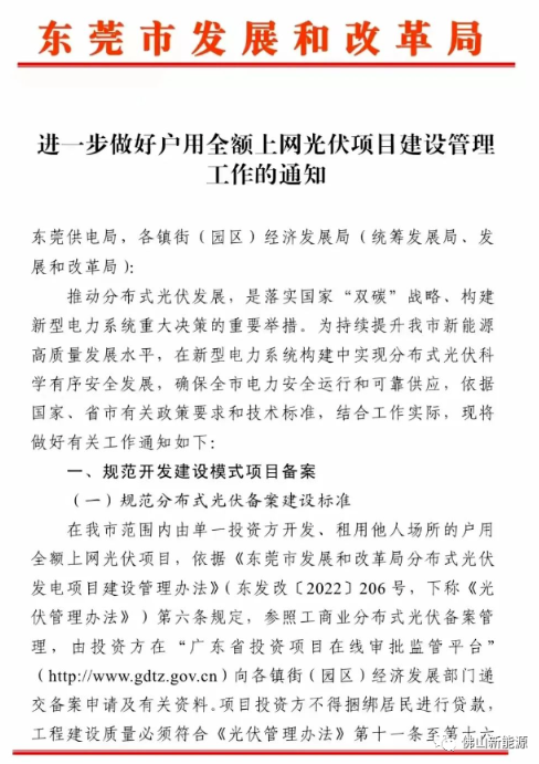 近日,東莞市發(fā)展和改革局下發(fā)了關于《進一步做好戶用全額上網(wǎng)光伏項日建設管理工作的通知》。 通知中提到在東莞市范圍內(nèi)由單一投資方開發(fā)、租用他人場所的戶用全額上網(wǎng)光伏項目,依據(jù)《東莞市發(fā)展和改革局分布式光伏發(fā)電項目建設管理辦法》( 東發(fā)改[2022]206 號,下稱《光伏管理辦法》)第六條規(guī)定,參照工商業(yè)分布式光伏備案管理。項目投資方不得捆綁居民進行貸款。 分布式光伏接入遵循就地接入和消納原則,在滿足供電安全及系統(tǒng)調(diào)峰的條件下,避免向 220 千伏及以上電網(wǎng)反送電,且各級電網(wǎng)設備反向不重過載。加快電網(wǎng)設備改造力度及時滿足分布式光伏接入要求。 原文如下: