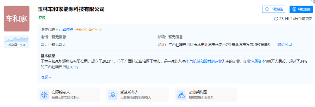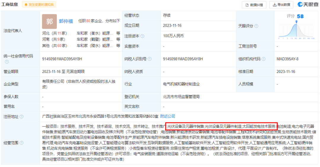 11月16日,玉林車和家能源科技有限公司成立,法定代表人為郭仲福,注冊(cè)資本100萬人民幣,經(jīng)營范圍含光伏設(shè)備及元器件制造、電池銷售、新能源原動(dòng)設(shè)備銷售、新能源汽車電附件銷售、新興能源技術(shù)研發(fā)、人工智能基礎(chǔ)軟件開發(fā)、人工智能應(yīng)用軟件開發(fā)等。 據(jù)股東信息顯示,該公司由理想汽車旗下北京車和家能源服務(wù)有限公司全資持股。