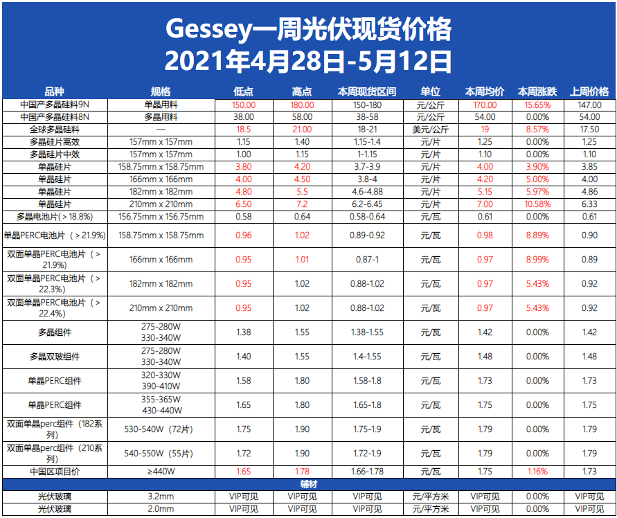 一周光伏產(chǎn)業(yè)鏈行情價(jià)格(2021年4月29日-5月12日)2021-05-12 19:24瀏覽數(shù):609次
