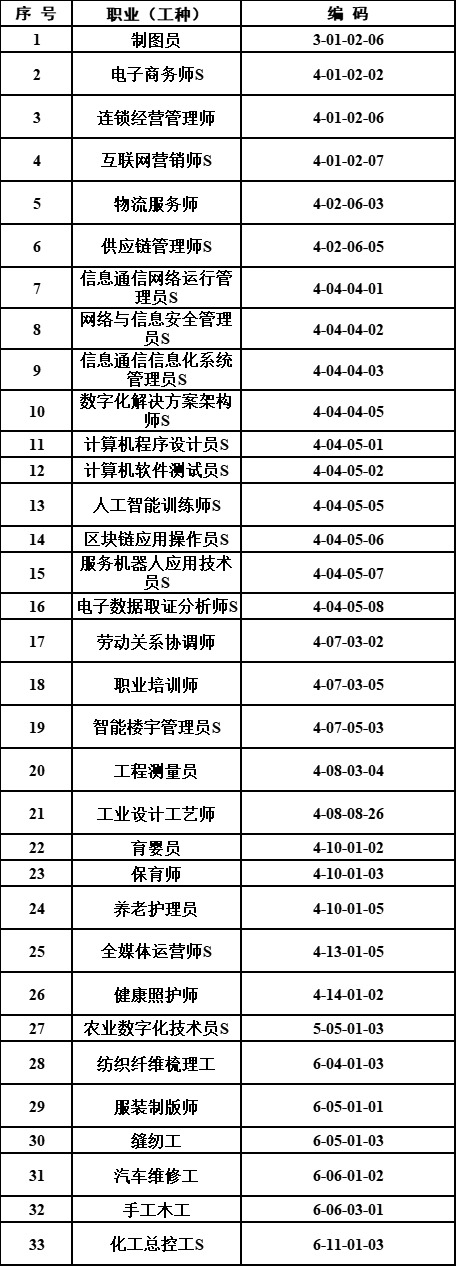備注:職業(yè)(工種)和編碼按照2022版《中華人民共和國職業(yè)分類大典》制定,S表示數(shù)字職業(yè),L表示綠色職業(yè)。