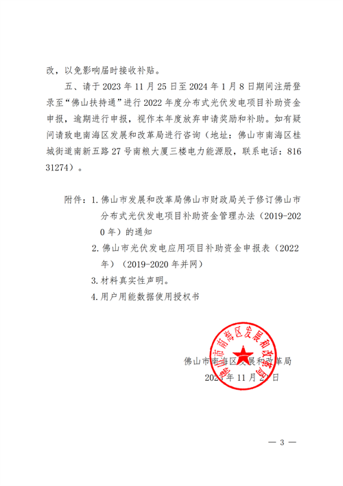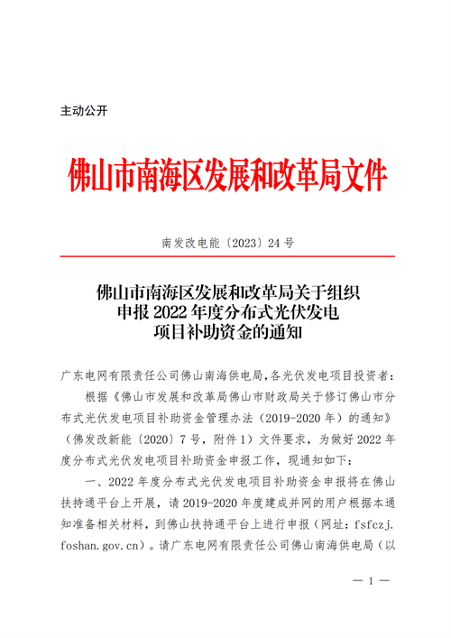 12月1日,佛山市南海區(qū)發(fā)改委發(fā)布于組織申報(bào)2022年度分布式光伏發(fā)電項(xiàng)目補(bǔ)助資金的通知,通知指出,補(bǔ)助標(biāo)準(zhǔn)為分布式光伏發(fā)電項(xiàng)目按實(shí)際發(fā)電量補(bǔ)助 0.3 元/千瓦時(shí) (其中市級(jí)補(bǔ)助 0.06 元/千瓦時(shí)、區(qū)級(jí)補(bǔ)助 0.24 元/千瓦時(shí) ),自項(xiàng)目建成的次月 1日起計(jì)算補(bǔ)助金額,連續(xù)補(bǔ)助3年。 原文見下:
