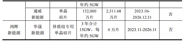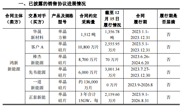 相關(guān)情況說明 1、華晟新材料合同履行良好,預(yù)計(jì)截至合同履行期滿,華晟新材料合同實(shí)際采購量約為合同約定總采購量的95%; 2、因客戶A的N型產(chǎn)線量產(chǎn)時(shí)間延期,因此采購相應(yīng)順延,雙方目前合作關(guān)系良好,并正就后續(xù)繼續(xù)履約和合作事宜展開積極協(xié)商,公司將持續(xù)密切跟蹤后續(xù)進(jìn)展情況; 3、棒杰新能源投產(chǎn)時(shí)間延期,產(chǎn)線正在調(diào)試中,調(diào)試完畢后將加速執(zhí)行,預(yù)計(jì)加速執(zhí)行期將主要集中在2024年上半年,公司將持續(xù)跟進(jìn)合同履行情況; 4、受先韋能源采購需求及鴻新新能源供應(yīng)計(jì)劃影響,預(yù)計(jì)截至合同履行期滿,先韋能源合同實(shí)際采購量約為合同約定總采購量的60%; 5、一道新能源、正泰新能及通威新能源簽署的硅片銷售合同均為3年期長單,鴻新新能源高效N型單晶硅棒、硅片項(xiàng)目共規(guī)劃20GW硅棒和14GW切片,目前一期4GW硅棒和4GW切片已投產(chǎn),計(jì)劃 2024 年第一季度陸續(xù)完成二期 960 臺單晶爐的安裝與調(diào)試工作,經(jīng)歷產(chǎn)能爬坡期后,產(chǎn)能將逐步釋放,上述長單將陸續(xù)交付; 6、鴻暉新能源年產(chǎn)10GW異質(zhì)結(jié)電池專用單晶硅片項(xiàng)目一期5GW已于近日正式投產(chǎn),投產(chǎn)后經(jīng)歷設(shè)備調(diào)試、量產(chǎn)爬坡,預(yù)計(jì)2024年3月達(dá)產(chǎn),與華晟新能源的合同將根據(jù)產(chǎn)能爬坡情況逐步履行。