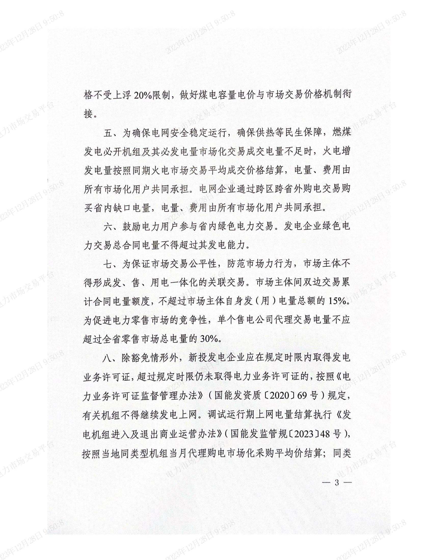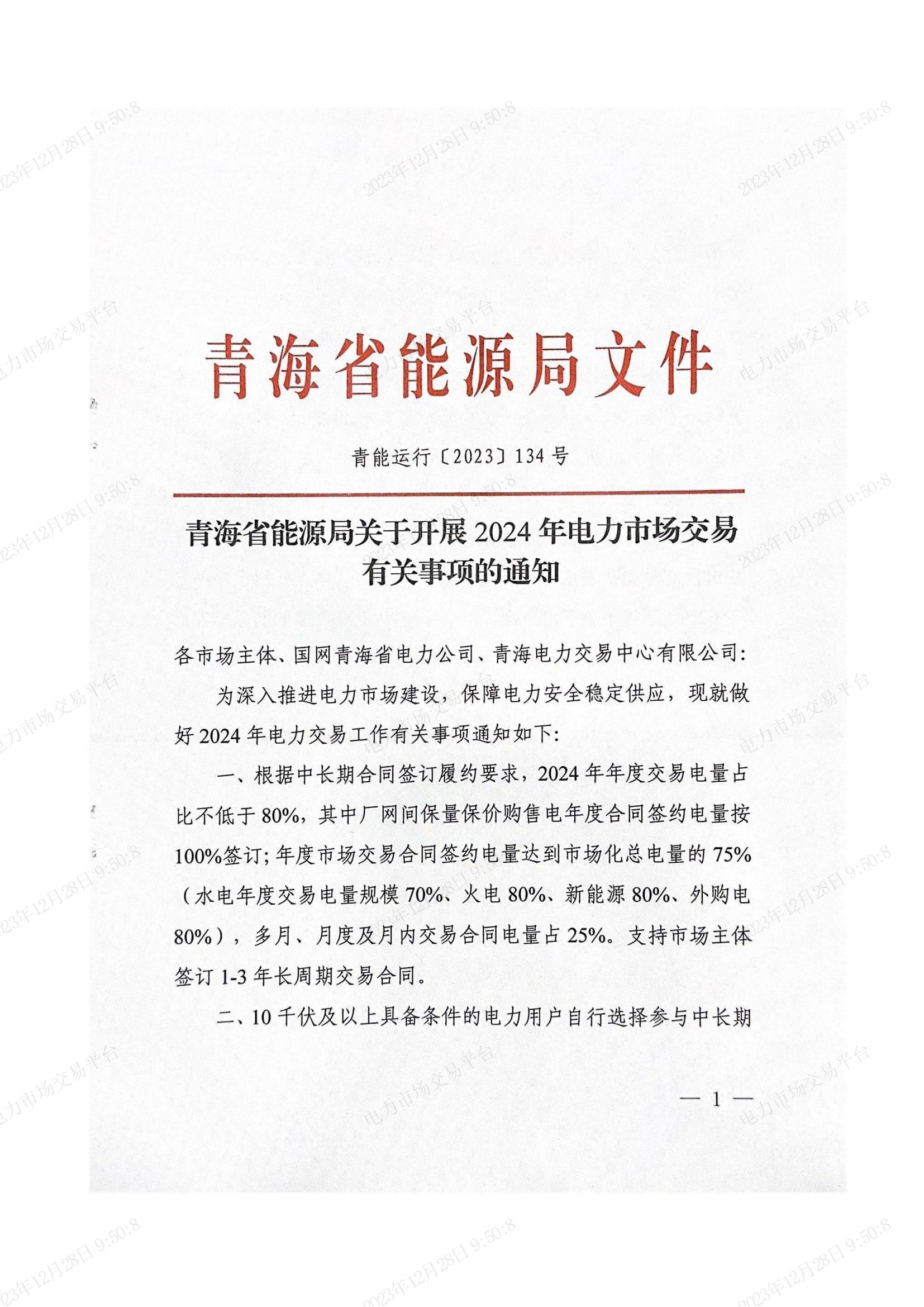 日前,青海省能源局發(fā)布了關于開展2024 年電力市場交易有關事項的通知,其中提出,根據中長期合同簽訂履約要求,2024年年度交易電量占比不低于80%,其中廠網間保量保價購售電年度合同簽約電量按100%簽訂;年度市場交易合同簽約電量達到市場化總電量的75%(水電年度交易電量規(guī)模 70%、火電 80%、新能源80%、外購電80%),多月、月度及月內交易合同電量占25%。支持市場主體簽訂1-3年長周期交易合同。 做好分時段交易機制與峰谷分時電價政策銜接,中長期分時段交易光伏發(fā)電峰、谷電價在平電價的基礎上分別上浮不低于63%、下浮不低于20%形成(儲能電站充電、綠電制氫等能量轉換對應交易電量下浮不低于 65%);其他電源峰、谷電價在平電價的基礎上分別上浮不低于63%、下浮不低于65%形成。 詳情如下: