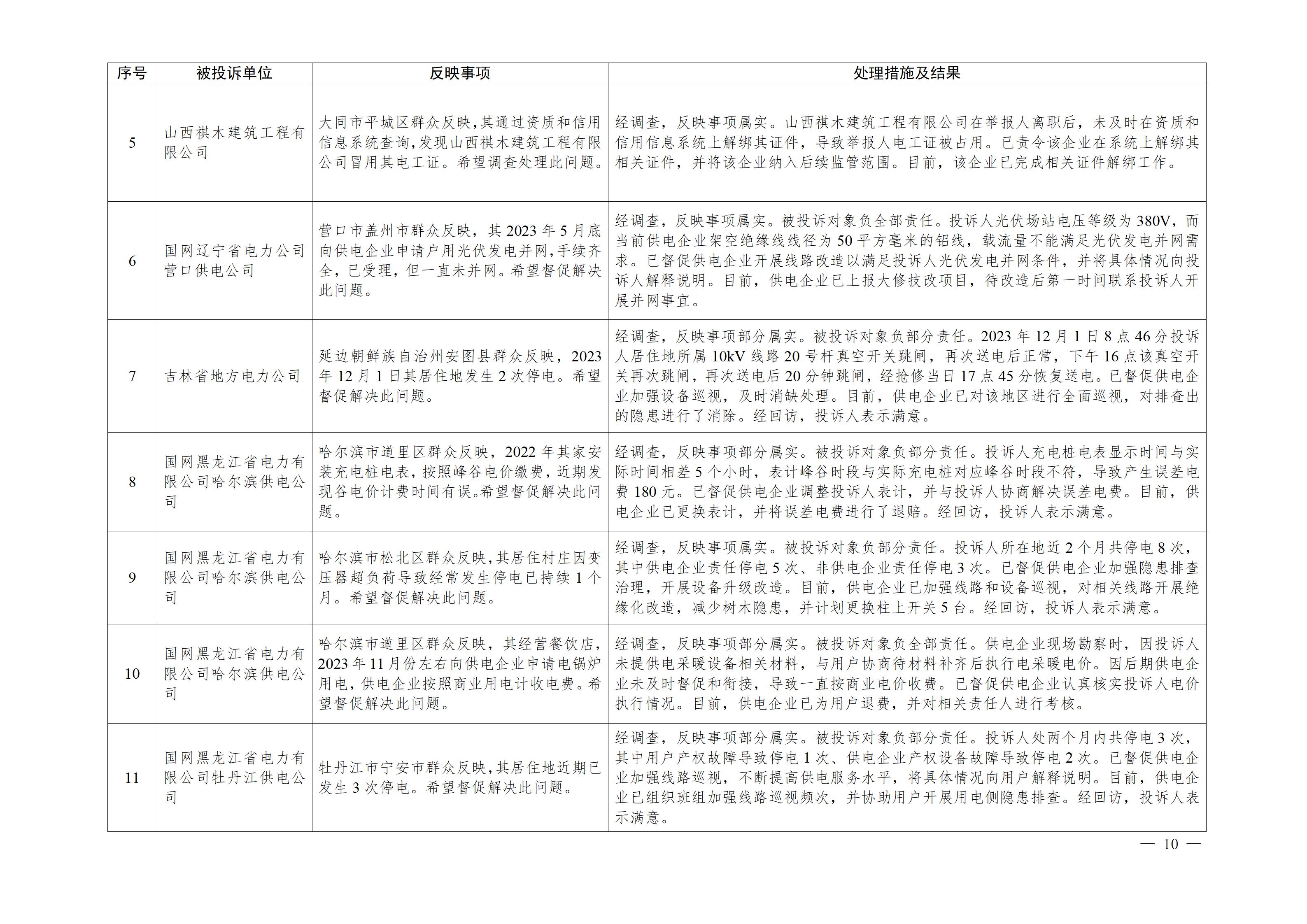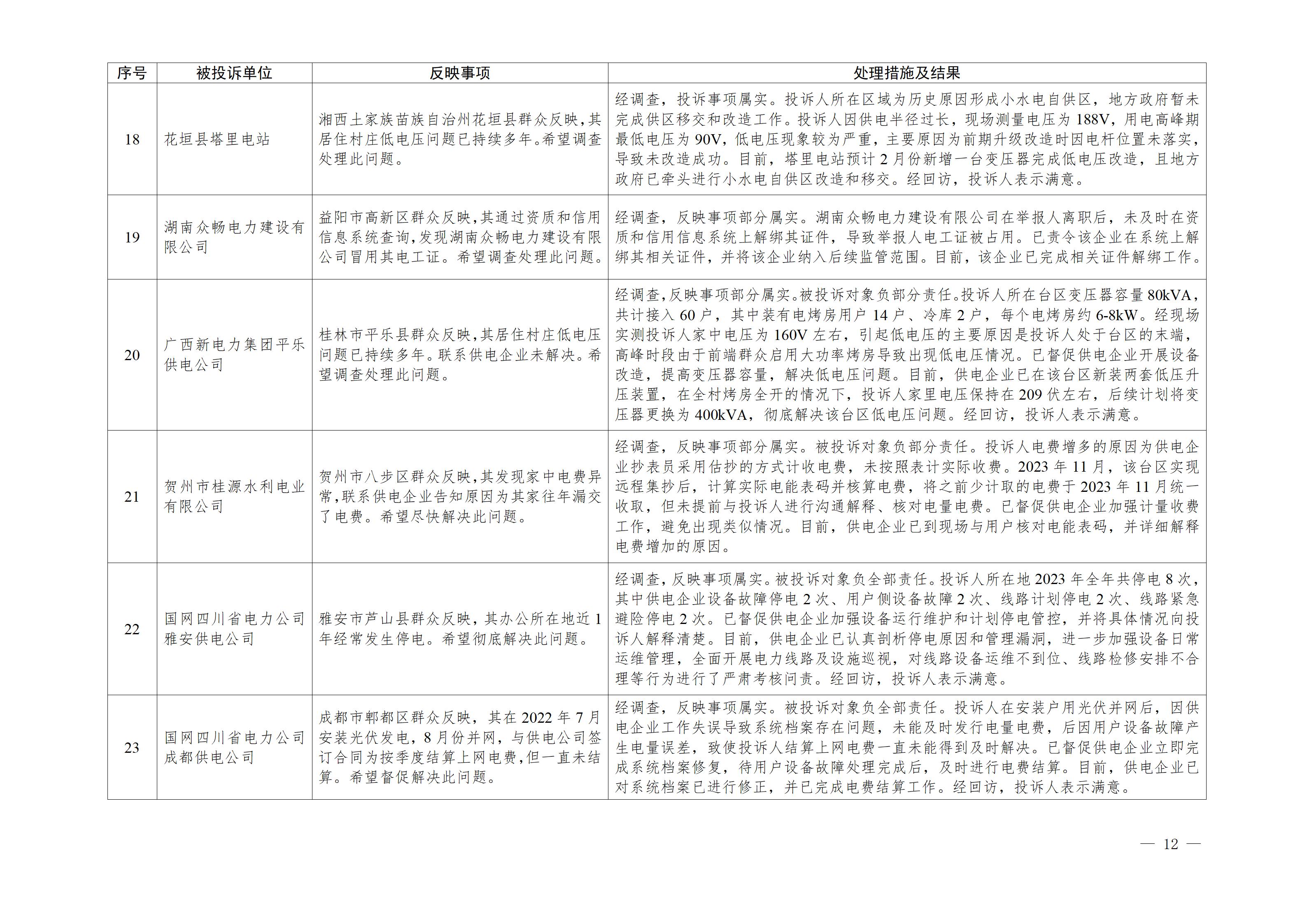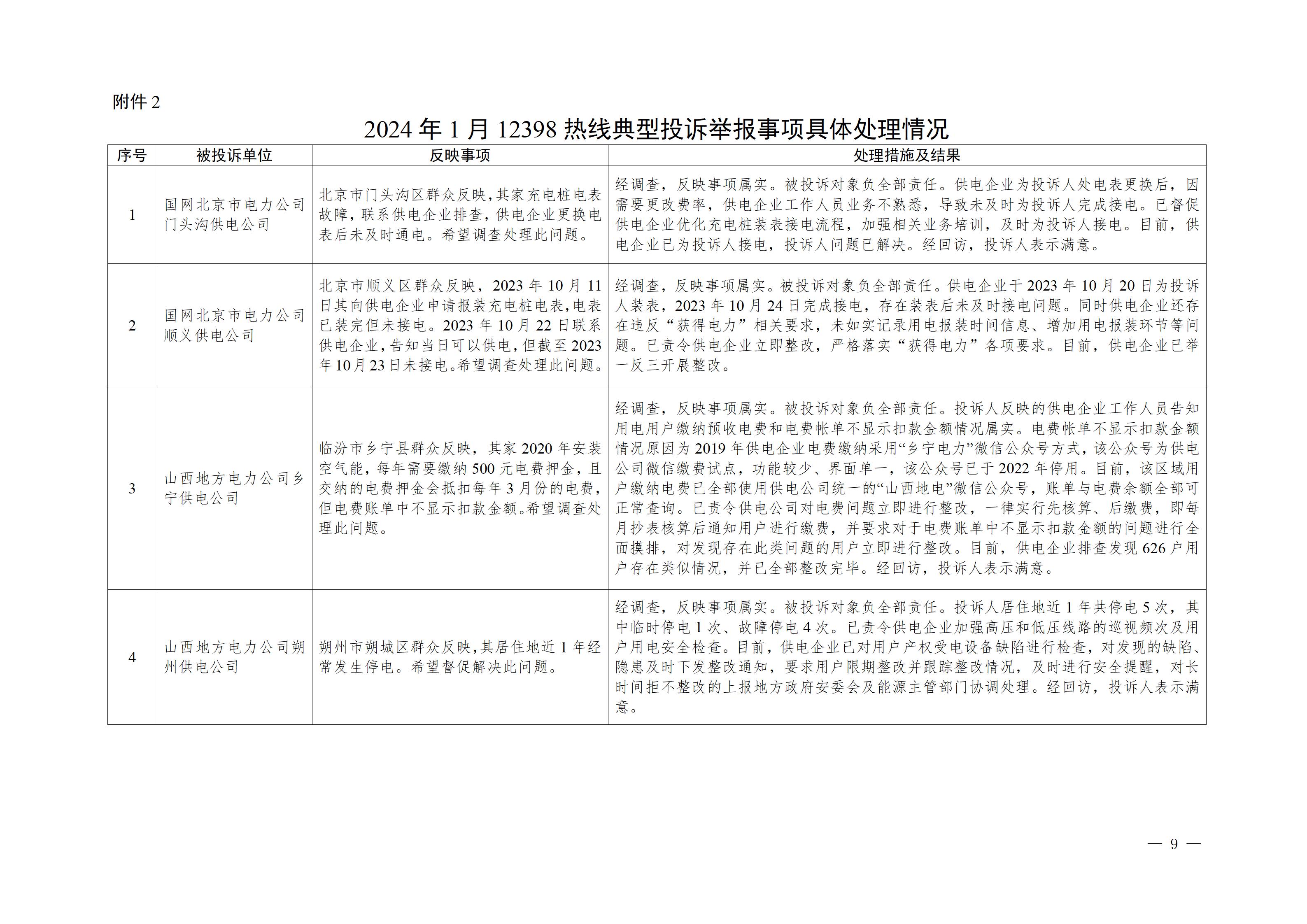 (三)問題處置情況 針對群眾反映的投訴舉報,國家能源局派出機構嚴格根據(jù)國家有關法規(guī)政策進行處理。一是督促供電企業(yè)加大電力設施建設、維護等資源投入,縮短供電半徑,提高電網(wǎng)轉供、互供能力,有效解決故障停電、低電壓等電能質量問題,進一步提升供電可靠性;二是要求供電企業(yè)加強設備隱患排查整治和停電搶修管理,加強線路巡視頻次,及時消除隱患缺陷,增加搶修資源投入,提升設備管控和停電搶修能力,切實提高供電質量;三是通過行政處罰、監(jiān)管約談、責令整改等方式,糾正有關企業(yè)違法違規(guī)行為,維護公平公正的市場秩序和群眾合法權益;四是通過解釋說明、澄清事實,使群眾消除誤解。(2024年1月12398熱線典型投訴舉報事項具體處理情況,見附件2)