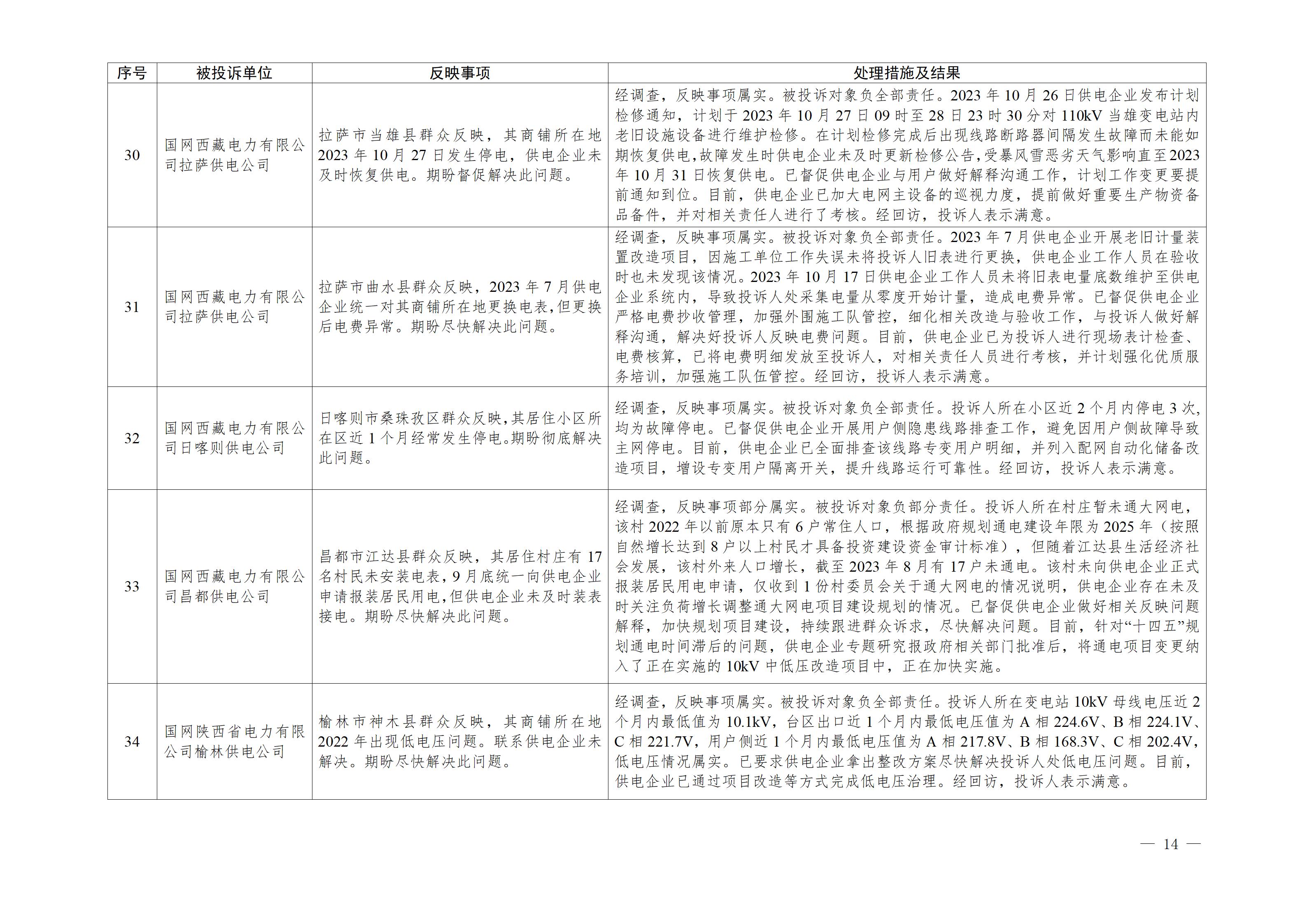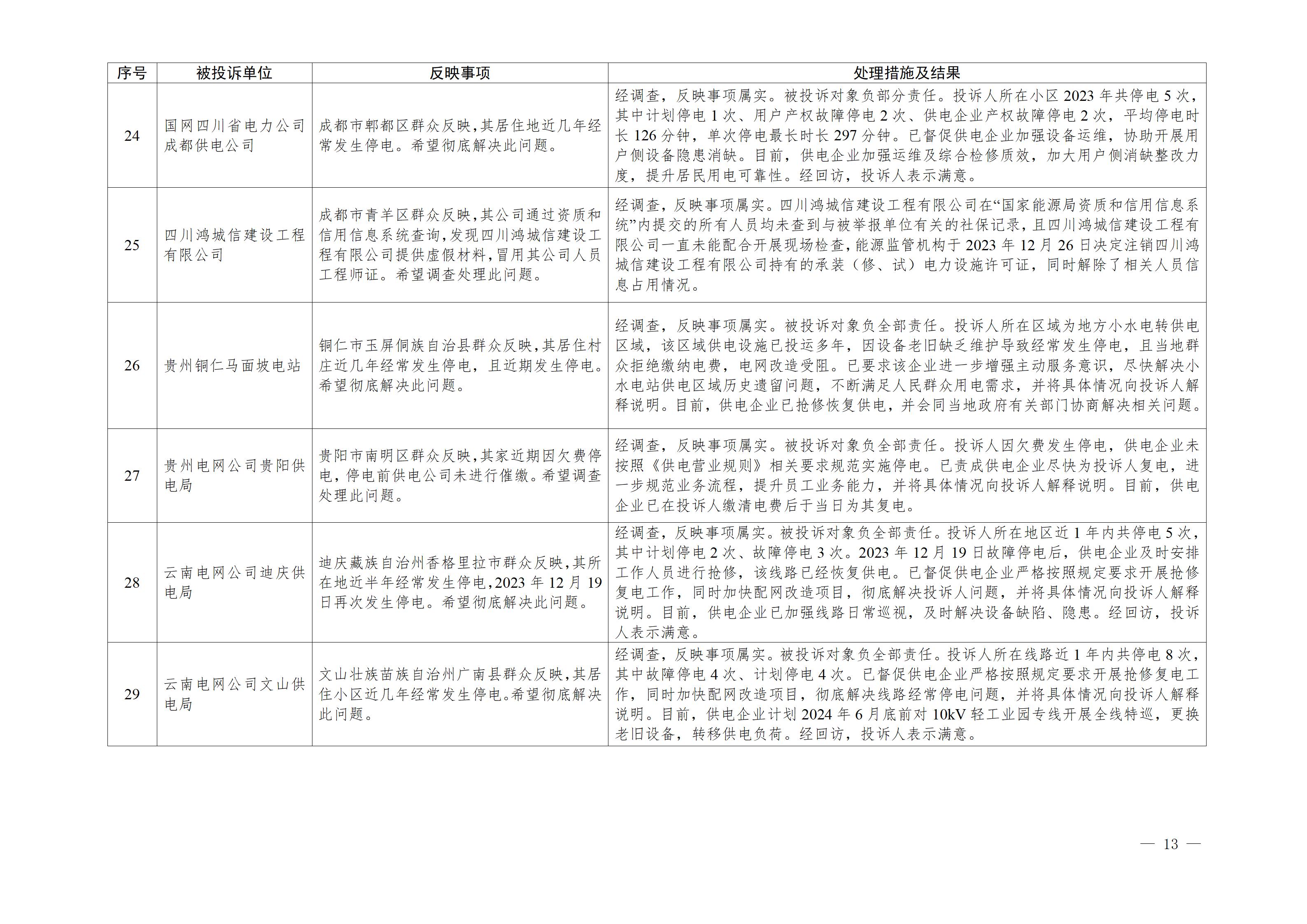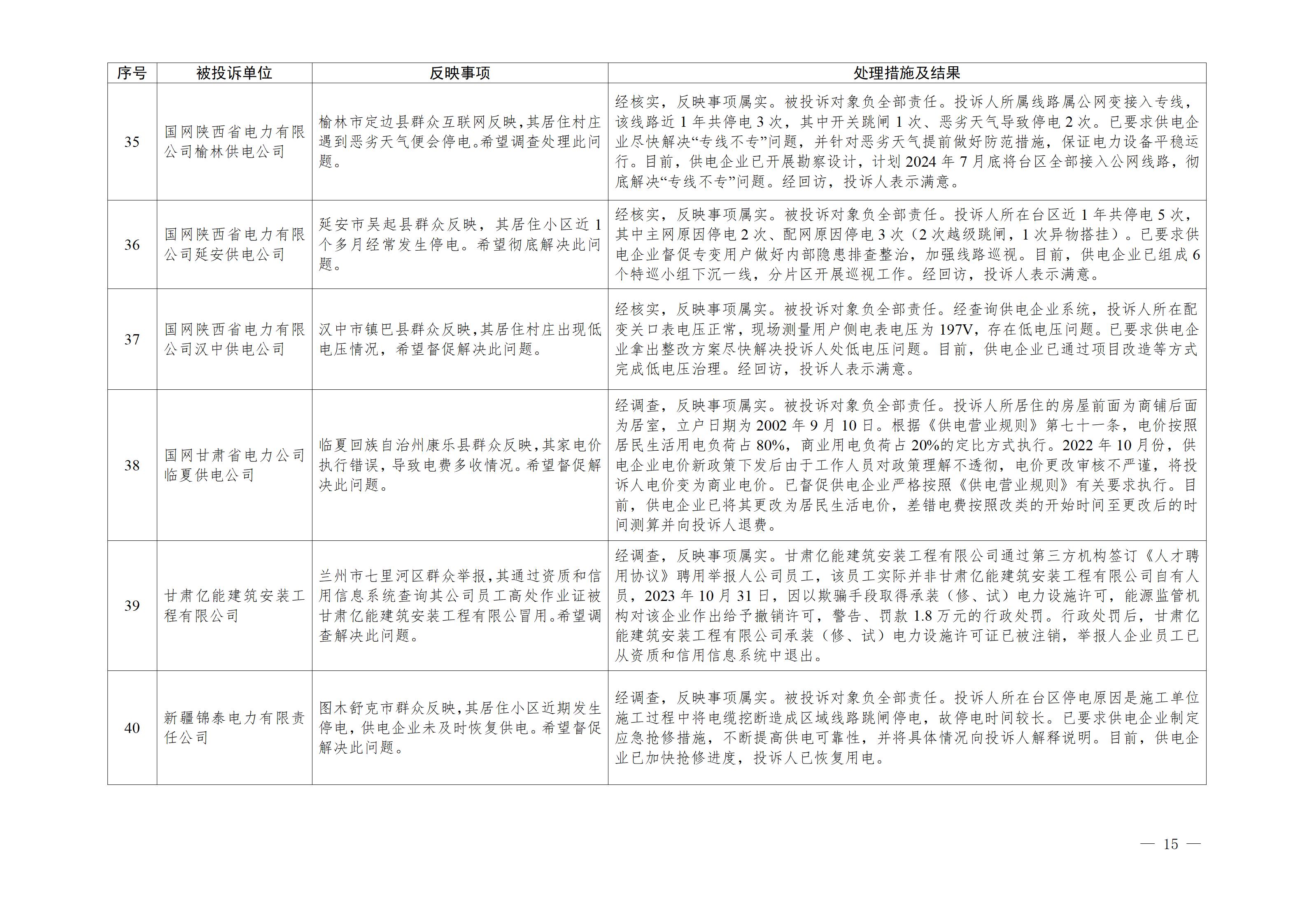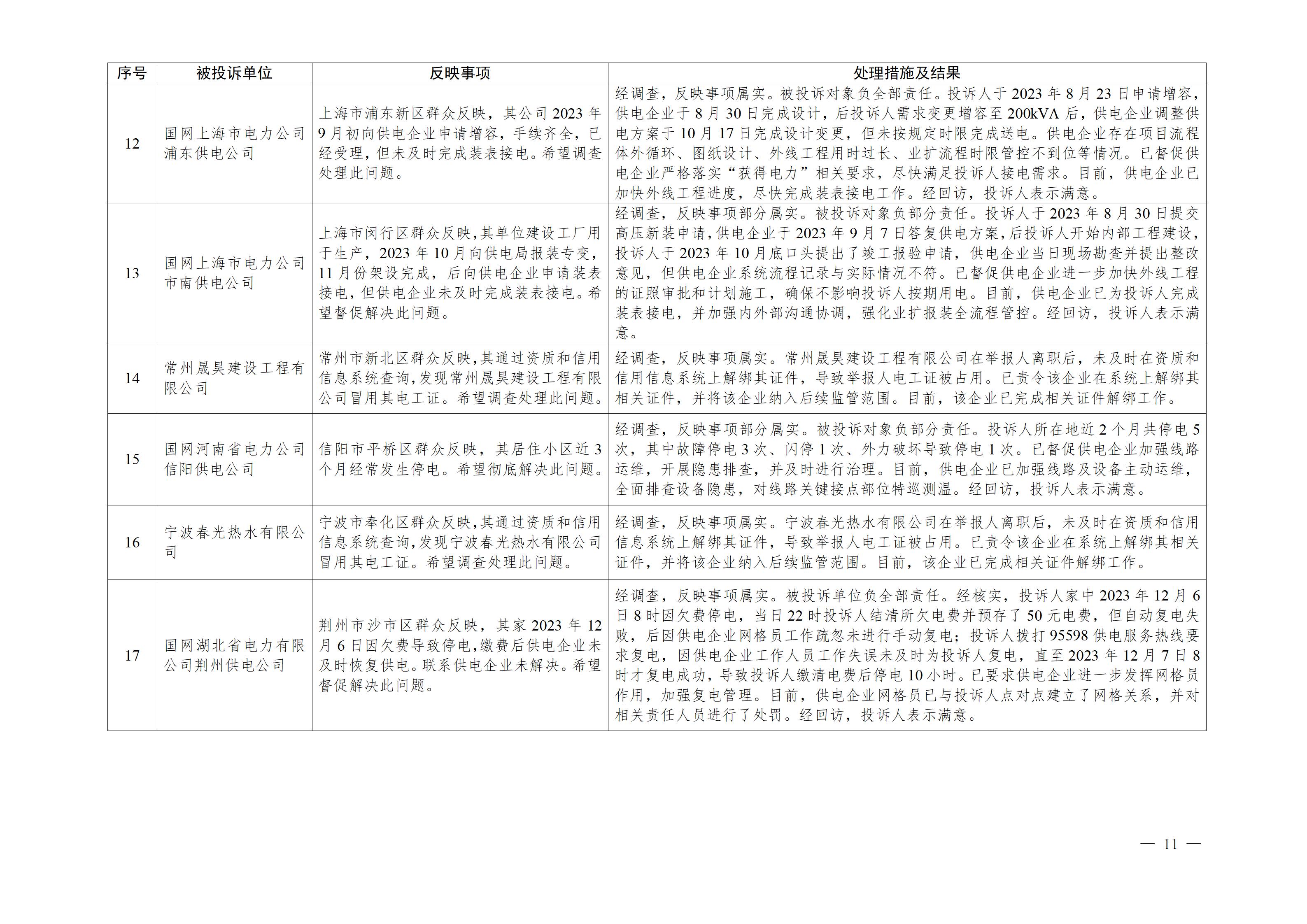 (三)問題處置情況 針對群眾反映的投訴舉報,國家能源局派出機構嚴格根據(jù)國家有關法規(guī)政策進行處理。一是督促供電企業(yè)加大電力設施建設、維護等資源投入,縮短供電半徑,提高電網(wǎng)轉供、互供能力,有效解決故障停電、低電壓等電能質量問題,進一步提升供電可靠性;二是要求供電企業(yè)加強設備隱患排查整治和停電搶修管理,加強線路巡視頻次,及時消除隱患缺陷,增加搶修資源投入,提升設備管控和停電搶修能力,切實提高供電質量;三是通過行政處罰、監(jiān)管約談、責令整改等方式,糾正有關企業(yè)違法違規(guī)行為,維護公平公正的市場秩序和群眾合法權益;四是通過解釋說明、澄清事實,使群眾消除誤解。(2024年1月12398熱線典型投訴舉報事項具體處理情況,見附件2)