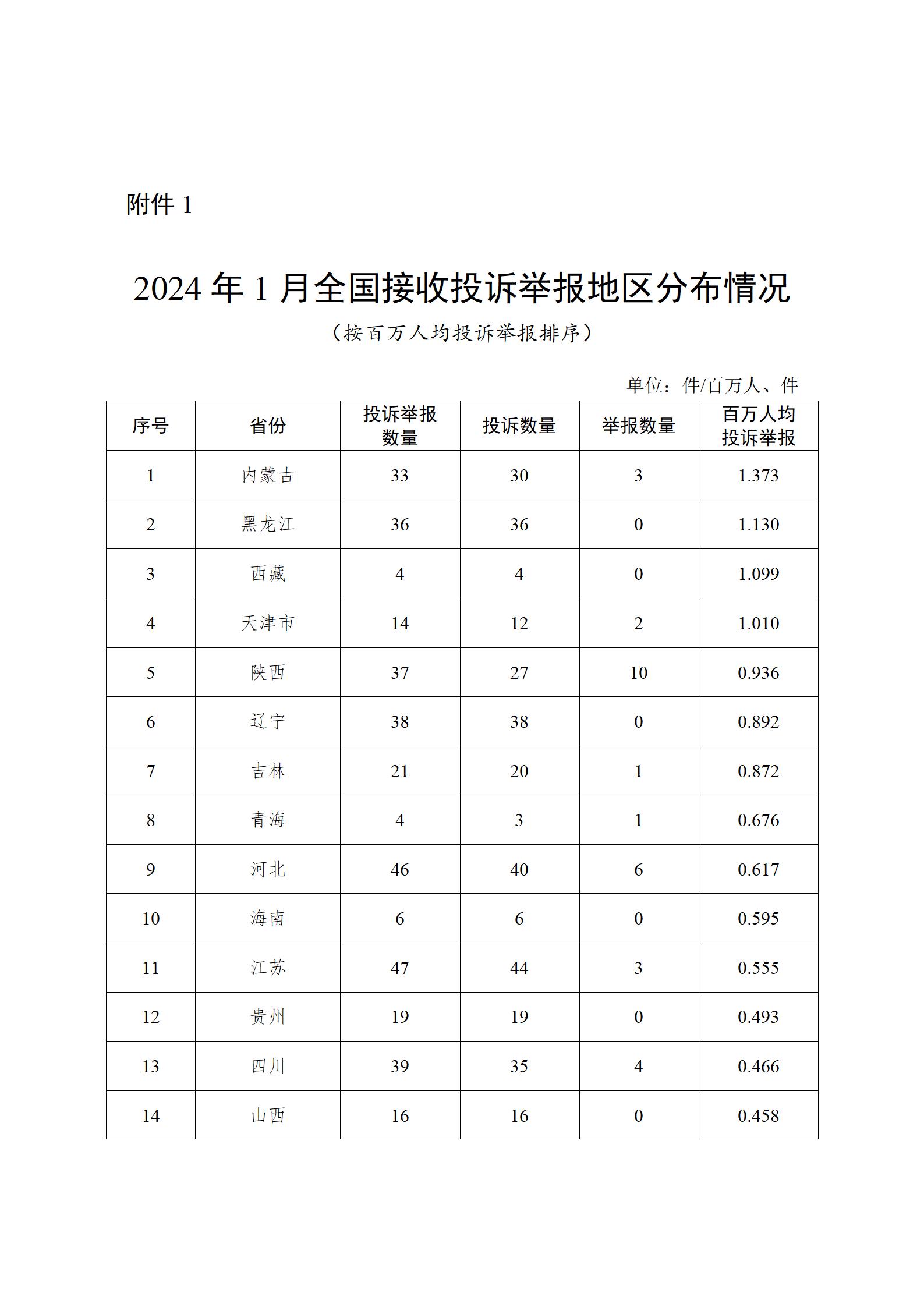 (二)地區(qū)分布情況 各?。ㄗ灾螀^(qū)、直轄市)按照接收投訴舉報數(shù)量排序,江蘇、河北、河南、四川、遼寧排在全國前5位。其中:按投訴數(shù)量排序,江蘇、河北、河南、遼寧、黑龍江排在全國前5位;按舉報數(shù)量排序,陜西、廣東、河北、四川、福建(湖北、江蘇、內蒙古并列)排在全國前5位;按百萬人均投訴舉報數(shù)量排序,內蒙古、黑龍江、西藏、天津、陜西排在全國前5位。(2024年1月全國接收投訴舉報地區(qū)分布情況,見附件1) (三)主要問題 2024年1月,接收的投訴舉報主要反映了4個方面的問題。 1.電能質量問題。受線路設備故障、臺區(qū)末端供電能力不足等因素影響,導致故障停電、低電壓等問題。 投訴舉報量靠前的2個省份為貴州(10件)、山西(9件)。 2.停電搶修問題。個別供電企業(yè)在發(fā)生故障停電、外力破壞停電后未及時恢復供電,影響群眾正常用電。 投訴舉報量靠前的2個省份為湖南(10件)、遼寧(9件)。 3.用電報裝問題。部分供電企業(yè)在收到群眾充電樁、三相電等用電報裝申請后,未按規(guī)定完成裝表接電。 投訴舉報量靠前的2個省份為山東(10件)、江蘇(10件)。 4.新能源和可再生能源行業(yè)相關問題。部分地區(qū)分布式光伏發(fā)電項目因當?shù)嘏_區(qū)容量不足導致并網(wǎng)困難,或因當?shù)毓┬璨黄胶庀拗破浒l(fā)電。 投訴舉報量靠前的2個省份為河南(4件)、江蘇(3件)。 二、當月處理情況 (一)受理情況 2024年1月,根據(jù)國家有關法規(guī)政策規(guī)定,國家能源局派出機構對屬于監(jiān)管職責范圍的622件投訴舉報進行了受理,占接收數(shù)量的94.97%;其他不予受理的,已按照國家有關法規(guī)政策及時轉辦。 (二)辦結情況 2024年1月,國家能源局派出機構辦結投訴舉報778件(含往期結轉),環(huán)比下降14.69%、同比增長7.16%,累計辦結率98.62%。其中:投訴725件,環(huán)比下降10.16%、同比增長13.46%;舉報53件,環(huán)比下降49.52%、同比下降39.08%。 從被投訴舉報對象看,供電企業(yè)812件、占投訴舉報總數(shù)的89.03%,其中國家電網(wǎng)公司588件,占比75.58%;南方電網(wǎng)公司47件,占比6.04%;內蒙古電力公司25件,占比3.21%;其他地方電力企業(yè)61件,占比7.84%;承裝(修、試)電力設施企業(yè)57件,占比7.33%。