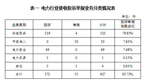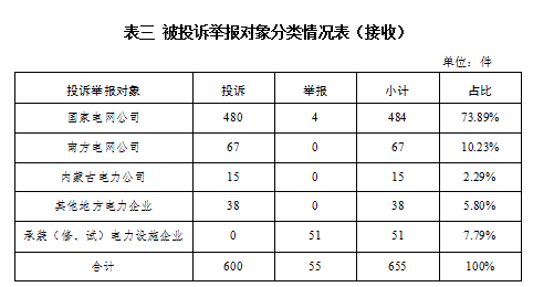 2.按被投訴舉報對象分類 供電企業(yè)604件、占投訴舉報總數(shù)的92.23%,其中國家電網(wǎng)公司484件、占投訴舉報總數(shù)的73.89%,南方電網(wǎng)公司67件、占投訴舉報總數(shù)的10.23%,內蒙古電力公司15件、占投訴舉報總數(shù)的2.29%,其他地方電力企業(yè)38件、占投訴舉報總數(shù)的5.80%;承裝(修、試)電力設施企業(yè)51件、占投訴舉報總數(shù)的7.79%。