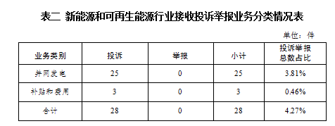 新能源和可再生能源行業(yè)排在第二位,數(shù)量為28件、占投訴舉報總數(shù)的4.27%,主要集中在并網(wǎng)發(fā)電、補貼和費用等方面。