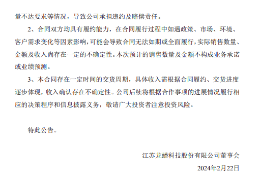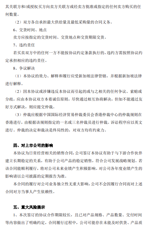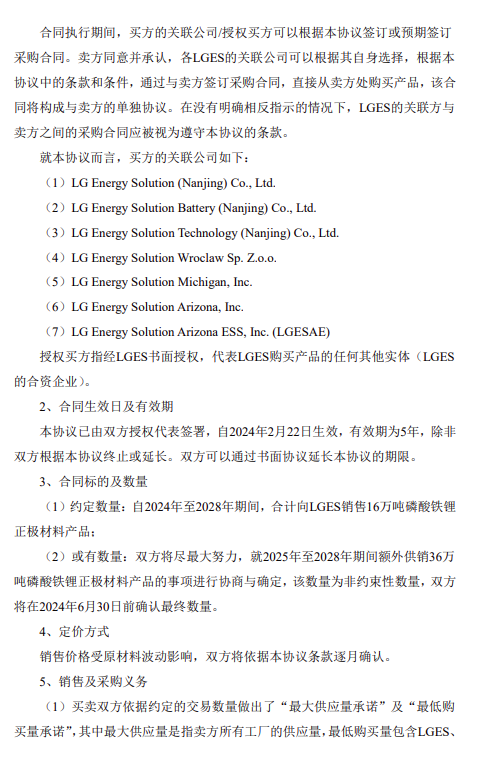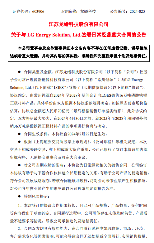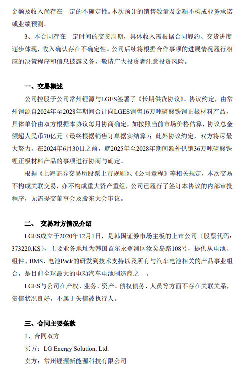 近日,龍蟠科技發(fā)布《關(guān)于與 LG Energy Solution, Ltd.簽署日常經(jīng)營重大合同的公告》。 根據(jù)公告顯示,龍蟠科技控股子公司常州鋰源新能源科技有限公司與LG Energy Solution, Ltd.簽署了《長期供貨協(xié)議》。 協(xié)議約定,由常州鋰源自2024年至2028年期間合計向LGES銷售16萬噸磷酸鐵鋰正極材料產(chǎn)品,具體單價由雙方根據(jù)本協(xié)議條款逐月確定,如按照當(dāng)前市場價格估算,協(xié)議總金額超人民幣70億元(最終根據(jù)銷售訂單據(jù)實結(jié)算);此外協(xié)議約定,雙方將盡最大努力,在2024年6月30日之前,就2025年至2028年期間額外供銷36萬噸磷酸鐵鋰正極材料產(chǎn)品的事項進行協(xié)商與確定。