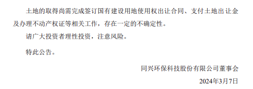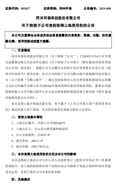 近日,同興環(huán)保發(fā)布《關(guān)于控股子公司競拍取得土地使用權(quán)的公告》。 根據(jù)公告顯示,近日公司控股子公司馬鞍山皓升新能源科技有限公司通過競拍取得含山縣自然資源和規(guī)劃局以掛牌方式出讓的編號含國土出字[2024]4號地塊的國有建設(shè)用地使用權(quán),該土地的取得將有利于加快啟動(dòng)同興環(huán)保鈉離子電池正極材料項(xiàng)目的建設(shè)及運(yùn)營,