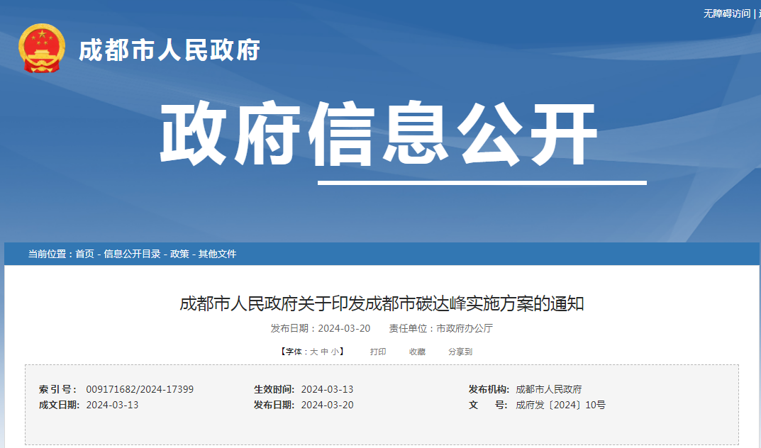 全文如下: 成都市人民政府關(guān)于印發(fā)成都市碳達(dá)峰實(shí)施方案的通知 各區(qū)(市)縣政府(管委會(huì)),市級(jí)有關(guān)部門,有關(guān)單位: 現(xiàn)將《成都市碳達(dá)峰實(shí)施方案》印發(fā)你們,請(qǐng)結(jié)合實(shí)際認(rèn)真貫徹執(zhí)行。 成都市人民政府 2024年3月13日 (本文有刪減) 成都市碳達(dá)峰實(shí)施方案 為深入貫徹黨中央、國(guó)務(wù)院關(guān)于碳達(dá)峰、碳中和工作的重大戰(zhàn)略決策部署及省委、省政府工作部署,全面落實(shí)《中共中央、國(guó)務(wù)院關(guān)于完整準(zhǔn)確全面貫徹新發(fā)展理念做好碳達(dá)峰碳中和工作的意見》《中共中央、國(guó)務(wù)院關(guān)于全面推進(jìn)美麗中國(guó)建設(shè)的意見》《國(guó)務(wù)院關(guān)于印發(fā)2030年前碳達(dá)峰行動(dòng)方案的通知》《中共四川省委、四川省人民政府關(guān)于完整準(zhǔn)確全面貫徹新發(fā)展理念做好碳達(dá)峰碳中和工作的實(shí)施意見》《四川省人民政府關(guān)于印發(fā)四川省碳達(dá)峰實(shí)施方案的通知》,有力有序有效做好碳達(dá)峰工作,結(jié)合成都實(shí)際,制定本實(shí)施方案。 一、總體要求 (一)指導(dǎo)思想。以習(xí)近平新時(shí)代中國(guó)特色社會(huì)主義思想為指導(dǎo),全面貫徹黨的二十大精神,全面貫徹習(xí)近平生態(tài)文明思想和習(xí)近平總書記對(duì)四川工作系列重要指示精神,全面貫徹黨中央、國(guó)務(wù)院和省委、省政府決策部署,立足新發(fā)展階段,完整、準(zhǔn)確、全面貫徹新發(fā)展理念,服務(wù)和融入新發(fā)展格局,把碳達(dá)峰、碳中和納入經(jīng)濟(jì)社會(huì)發(fā)展全局和生態(tài)文明建設(shè)整體布局,堅(jiān)持中央確立的“全國(guó)統(tǒng)籌、節(jié)約優(yōu)先、雙輪驅(qū)動(dòng)、內(nèi)外通暢、防范風(fēng)險(xiǎn)”原則,以建設(shè)踐行新發(fā)展理念的公園城市示范區(qū)為統(tǒng)領(lǐng),全方位優(yōu)化空間、產(chǎn)業(yè)、交通和能源結(jié)構(gòu),加快推動(dòng)生產(chǎn)生活方式綠色變革,堅(jiān)定不移走生態(tài)優(yōu)先、綠色低碳的高質(zhì)量發(fā)展道路,協(xié)同推進(jìn)降碳、減污、擴(kuò)綠、增長(zhǎng),推動(dòng)經(jīng)濟(jì)社會(huì)發(fā)展建立在資源高效利用和綠色低碳發(fā)展的基礎(chǔ)之上,加快建設(shè)人與自然和諧共生的美麗成都,確保如期實(shí)現(xiàn)2030年前碳達(dá)峰目標(biāo)。 (二)基本原則 堅(jiān)持發(fā)展導(dǎo)向、綠色轉(zhuǎn)型。正確處理好發(fā)展與減排的關(guān)系,深刻認(rèn)識(shí)實(shí)現(xiàn)碳達(dá)峰、碳中和是貫徹新發(fā)展理念、構(gòu)建新發(fā)展格局、推動(dòng)高質(zhì)量發(fā)展的內(nèi)在要求,突出公園城市特點(diǎn),加強(qiáng)資源節(jié)約工作,持續(xù)降低單位產(chǎn)出能源資源消耗和碳排放,探索推進(jìn)降碳減排與城市發(fā)展、經(jīng)濟(jì)增長(zhǎng)良性互動(dòng),加快走出一條綠色成為普遍形態(tài)的更高質(zhì)量、更有效率、更加公平、更可持續(xù)的超大城市發(fā)展新路徑。 堅(jiān)持系統(tǒng)推進(jìn)、重點(diǎn)突破。以碳達(dá)峰、碳中和為抓手推動(dòng)經(jīng)濟(jì)社會(huì)系統(tǒng)性變革,加強(qiáng)全局統(tǒng)籌、戰(zhàn)略謀劃、整體推進(jìn),堅(jiān)持先立后破,加強(qiáng)政策系統(tǒng)性、協(xié)同性。抓住主要矛盾和矛盾的主要方面,深入推進(jìn)空間、產(chǎn)業(yè)、交通、能源結(jié)構(gòu)優(yōu)化調(diào)整,以重要領(lǐng)域和關(guān)鍵環(huán)節(jié)突破帶動(dòng)碳達(dá)峰、碳中和工作整體推進(jìn)。 堅(jiān)持雙輪驅(qū)動(dòng)、兩手發(fā)力。更好發(fā)揮政府作用,在經(jīng)濟(jì)社會(huì)發(fā)展各個(gè)領(lǐng)域強(qiáng)化綠色低碳發(fā)展的政策導(dǎo)向,充分發(fā)揮市場(chǎng)機(jī)制作用,大力推進(jìn)綠色低碳科技創(chuàng)新,加快形成促進(jìn)碳達(dá)峰、碳中和的有效激勵(lì)約束機(jī)制。 堅(jiān)持穩(wěn)妥有序、安全降碳。處理好減污降碳與能源安全、產(chǎn)業(yè)鏈供應(yīng)鏈安全、糧食安全和群眾正常生產(chǎn)生活的關(guān)系,著力化解各類風(fēng)險(xiǎn)隱患,防止運(yùn)動(dòng)式“減碳”,穩(wěn)妥有序、循序漸進(jìn)推進(jìn)碳達(dá)峰行動(dòng),確保安全降碳。 二、主要目標(biāo) “十四五”期間,全市經(jīng)濟(jì)綠色化低碳化循環(huán)化發(fā)展水平有效提升,能源消費(fèi)結(jié)構(gòu)優(yōu)化取得重要突破,煤炭消費(fèi)比重持續(xù)下降,以綠色能源為主體的新型電力系統(tǒng)加快構(gòu)建,綠色低碳技術(shù)研發(fā)和推廣應(yīng)用取得新進(jìn)展,重點(diǎn)行業(yè)能源利用效率大幅提升,綠色生活方式有效推行,有利于綠色低碳循環(huán)發(fā)展的政策體系進(jìn)一步完善。到2025年,非化石能源消費(fèi)比重提升至42%左右,單位地區(qū)生產(chǎn)總值能耗較2020年下降14%,單位地區(qū)生產(chǎn)總值二氧化碳排放較2020年下降20%,綠色低碳成為城市標(biāo)志性品牌,為實(shí)現(xiàn)碳達(dá)峰奠定堅(jiān)實(shí)基礎(chǔ)。 “十五五”期間,產(chǎn)業(yè)結(jié)構(gòu)優(yōu)化升級(jí)取得重大進(jìn)展,綠色低碳產(chǎn)業(yè)競(jìng)爭(zhēng)