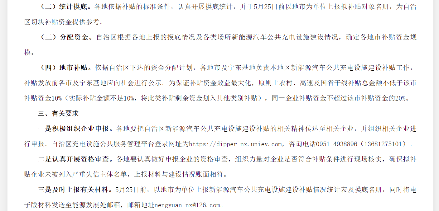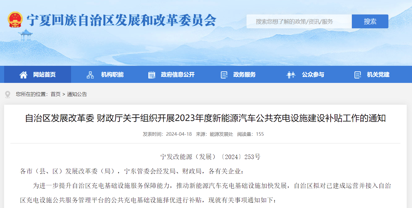 4月18日,寧夏回族自治區(qū)發(fā)改委發(fā)布《關(guān)于組織開展2023年度新能源汽車公共充電設(shè)施建設(shè)補(bǔ)貼工作的通知》。 根據(jù)《國(guó)家發(fā)展改革委等部門關(guān)于進(jìn)一步提升電動(dòng)汽車充電基礎(chǔ)設(shè)施服務(wù)保障能力的實(shí)施意見》(發(fā)改能源規(guī)劃〔2022〕53號(hào))、自治區(qū)《關(guān)于進(jìn)一步提升自治區(qū)充電基礎(chǔ)設(shè)施服務(wù)保障能力的實(shí)施方案》(寧發(fā)改規(guī)發(fā)〔2023〕8號(hào))等相關(guān)規(guī)定,擬對(duì)2023年1月1日至2023年12月31日期間投運(yùn)并正常運(yùn)營(yíng)的公共充電基礎(chǔ)設(shè)施投資主體進(jìn)行建設(shè)補(bǔ)貼,標(biāo)準(zhǔn)為交流75元/千瓦,直流150元/千瓦。申請(qǐng)補(bǔ)貼的企業(yè)應(yīng)具備以下條件: 1.接入公共服務(wù)平臺(tái)。申請(qǐng)補(bǔ)貼的企業(yè)應(yīng)接入自治區(qū)充電設(shè)施公共服務(wù)管理平臺(tái),接入時(shí)間不晚于2024年5月15日。 2.提供公共充電服務(wù)。公共充電基礎(chǔ)設(shè)施應(yīng)對(duì)社會(huì)開放,包括社會(huì)公共停車場(chǎng)、住宅小區(qū)公共停車場(chǎng)、商業(yè)建筑物配建停車場(chǎng)、加油(氣)站、高速公路和普通國(guó)省干道服務(wù)區(qū)、交通樞紐等公共充電設(shè)施。 3.項(xiàng)目證照手續(xù)齊全。項(xiàng)目須在屬地縣(區(qū))備案,投運(yùn)時(shí)間在2023年度(以簽訂供電合同時(shí)間為準(zhǔn)),目前處于正常運(yùn)行狀態(tài)。符合補(bǔ)貼條件逾期未申報(bào)的,視為放棄補(bǔ)貼資格。 4.從未享受政府補(bǔ)貼。已獲得過政府各類補(bǔ)貼(包括但不限于中央預(yù)算內(nèi)資金、財(cái)政專項(xiàng)資金、貸款貼息、債券資金)的公共充電設(shè)施不再重復(fù)享受本補(bǔ)貼。