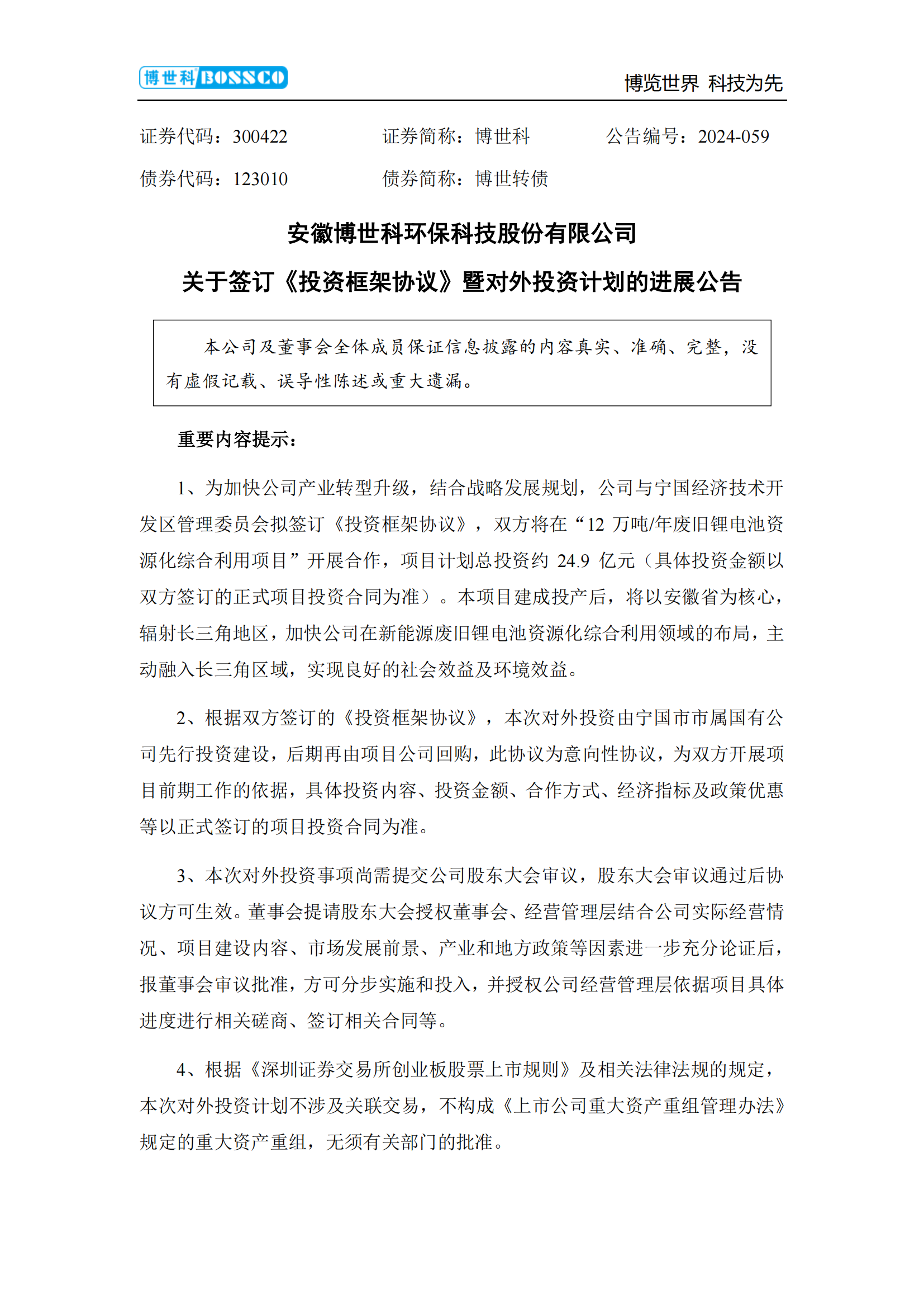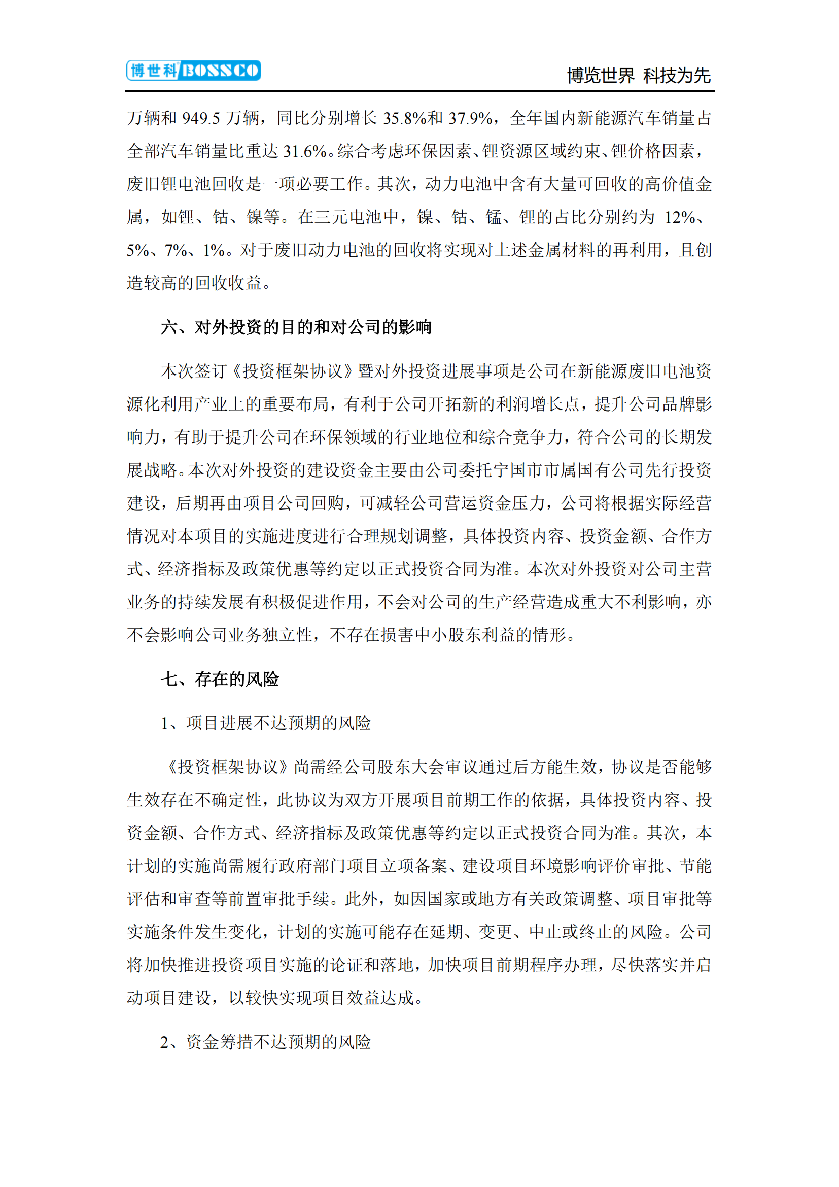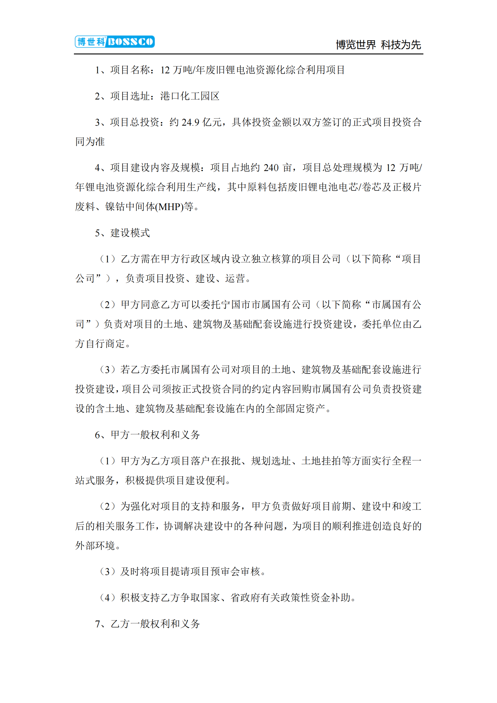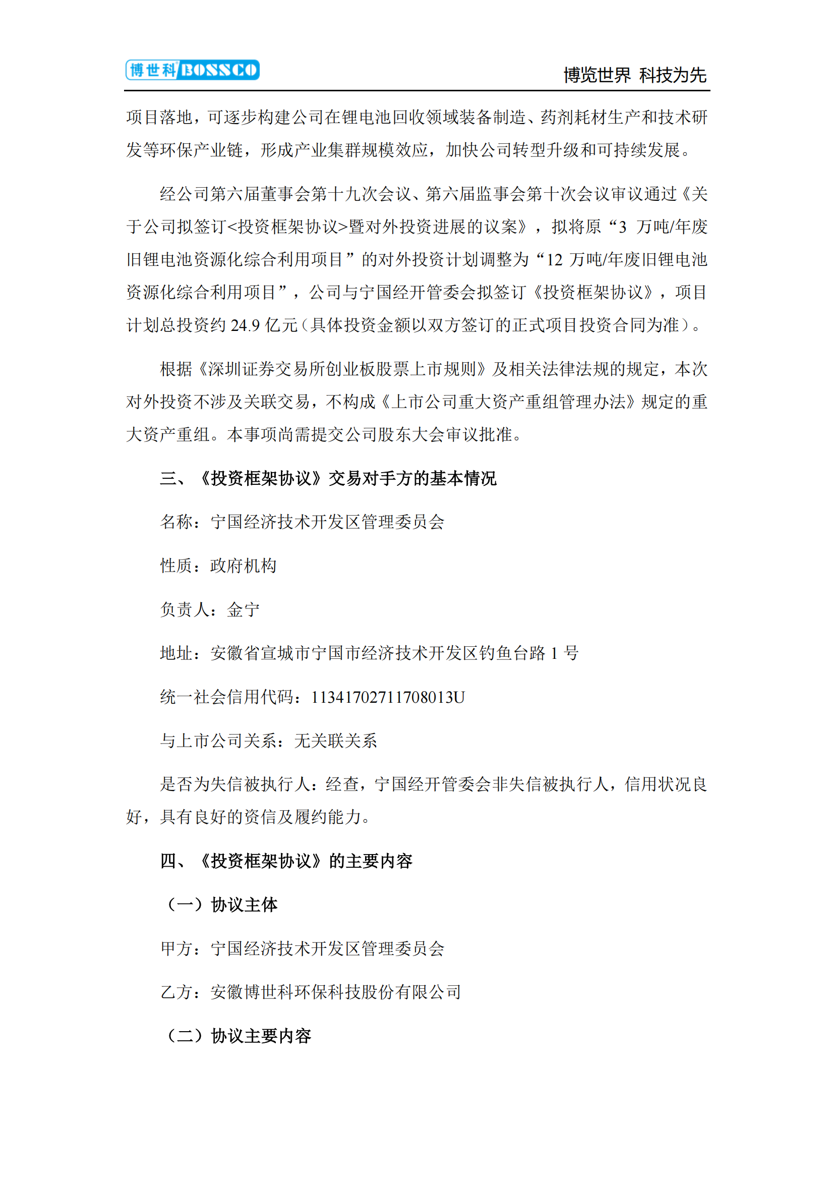 博世科5月31日發(fā)布公告稱,為加快公司產業(yè)轉型升級,結合戰(zhàn)略發(fā)展規(guī)劃,公司與寧國經濟技術開發(fā)區(qū)管理委員會擬簽訂《投資框架協(xié)議》,雙方將在“12萬噸/年廢舊鋰電池資源化綜合利用項目”開展合作,項目計劃總投資約 24.9 億元(具體投資金額以雙方簽訂的正式項目投資合同為準)。本項目建成投產后,將以安徽省為核心,輻射長三角地區(qū),加快公司在新能源廢舊鋰電池資源化綜合利用領域的布局,主動融入長三角區(qū)域,實現良好的社會效益及環(huán)境效益。 該項目占地約 240 畝,項目總處理規(guī)模為 12 萬噸/年鋰電池資源化綜合利用生產線,其中原料包括廢舊鋰電池電芯/卷芯及正極片廢料、鎳鈷中間體(MHP)等。 根據雙方簽訂的《投資框架協(xié)議》,本次對外投資由寧國市市屬國有公司先行投資建設,后期再由項目公司回購,此協(xié)議為意向性協(xié)議,為雙方開展項目前期工作的依據,具體投資內容、投資金額、合作方式、經濟指標及政策優(yōu)惠等以正式簽訂的項目投資合同為準。 原公告內容如下: