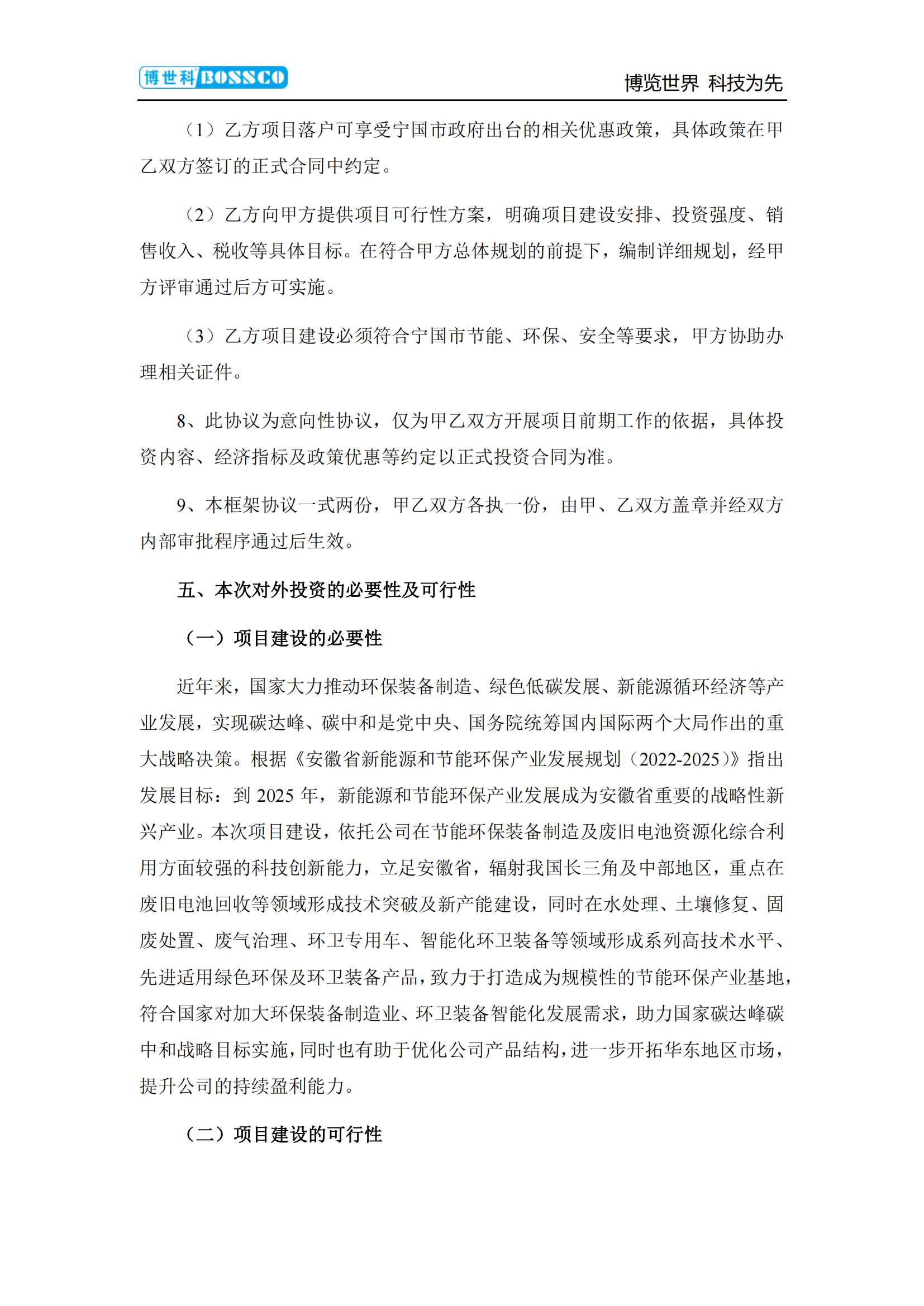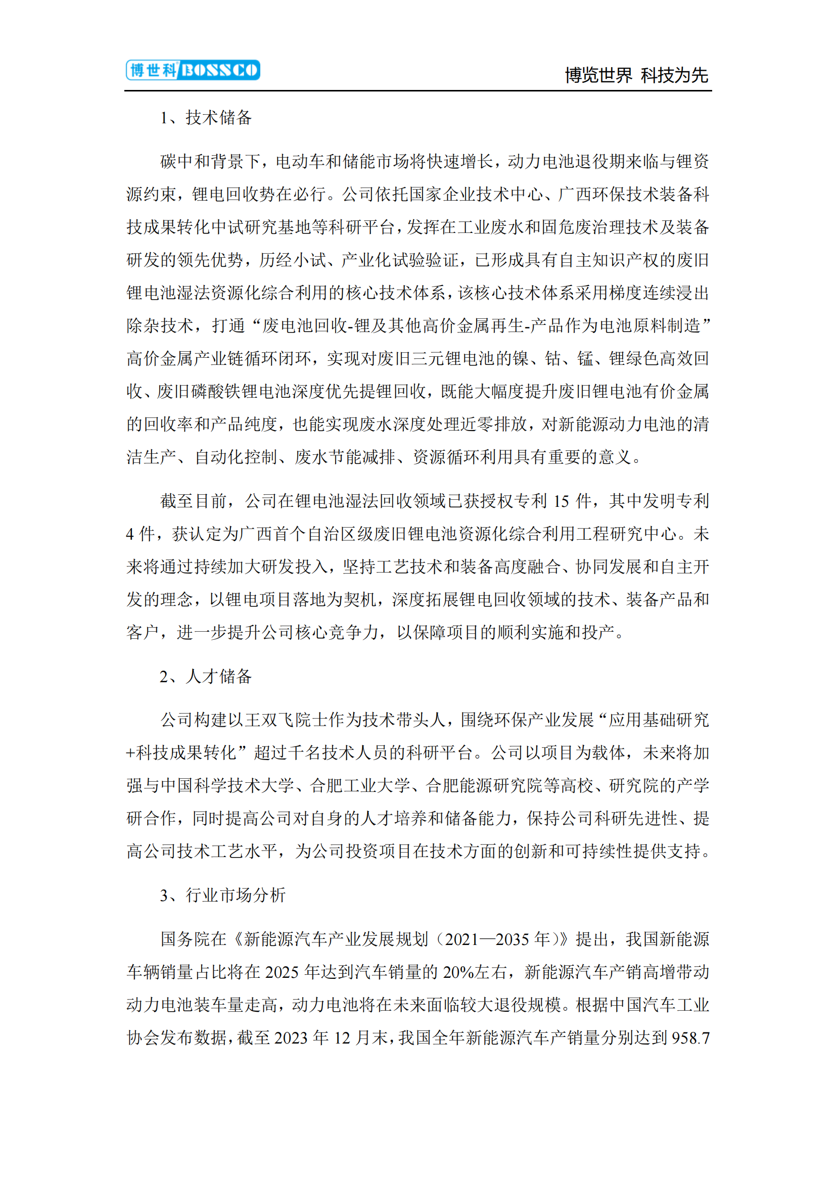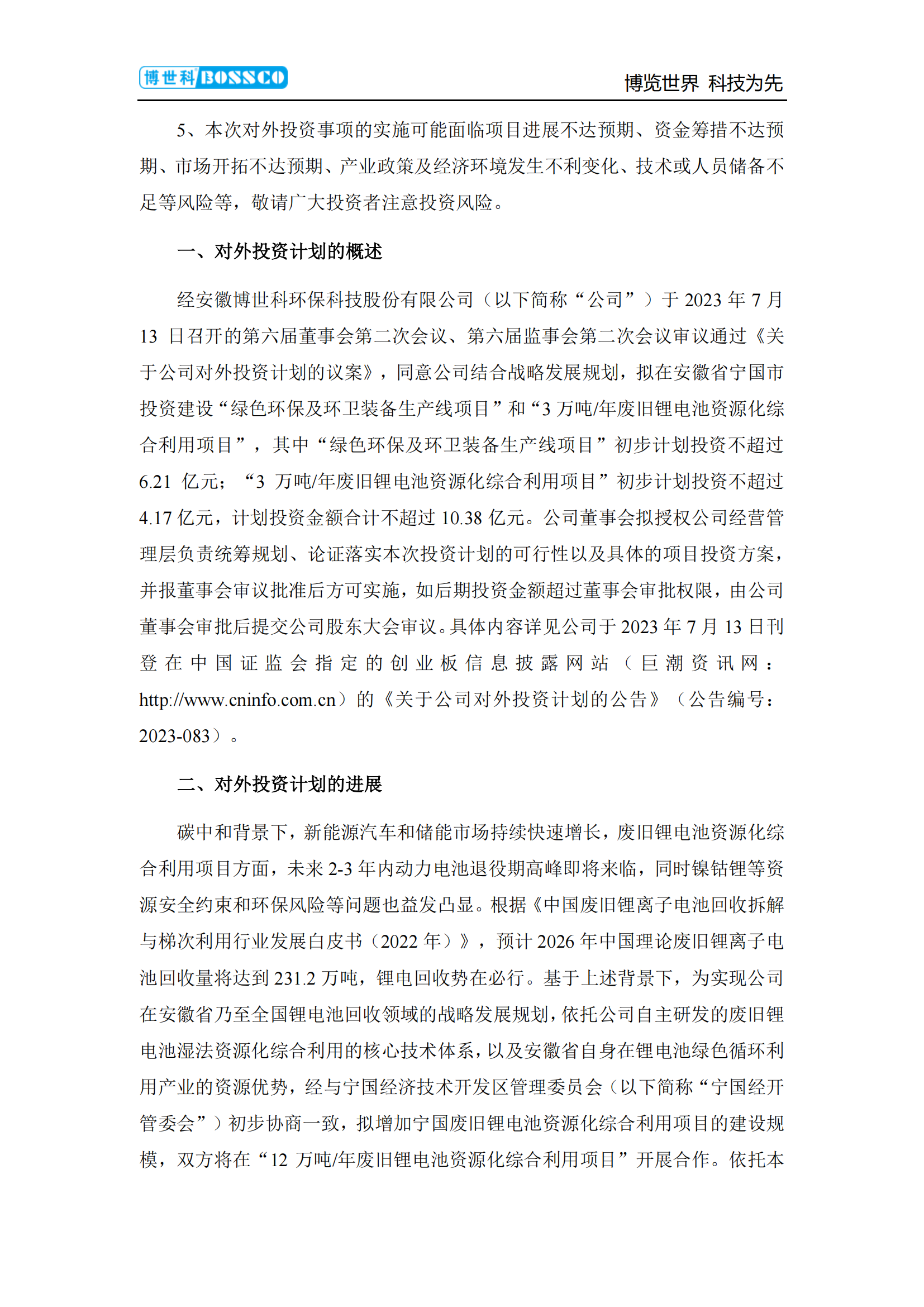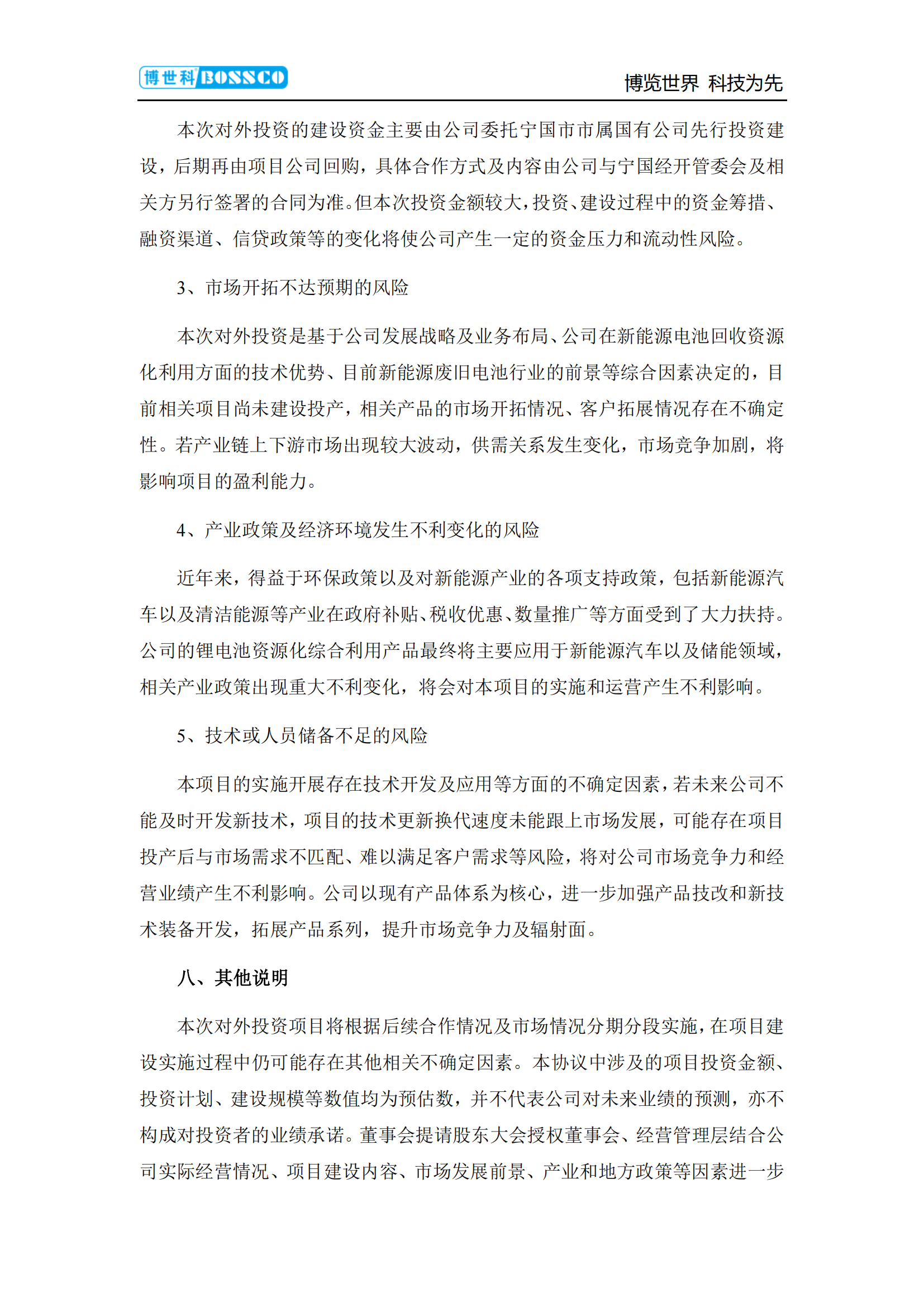 博世科5月31日發(fā)布公告稱,為加快公司產業(yè)轉型升級,結合戰(zhàn)略發(fā)展規(guī)劃,公司與寧國經濟技術開發(fā)區(qū)管理委員會擬簽訂《投資框架協(xié)議》,雙方將在“12萬噸/年廢舊鋰電池資源化綜合利用項目”開展合作,項目計劃總投資約 24.9 億元(具體投資金額以雙方簽訂的正式項目投資合同為準)。本項目建成投產后,將以安徽省為核心,輻射長三角地區(qū),加快公司在新能源廢舊鋰電池資源化綜合利用領域的布局,主動融入長三角區(qū)域,實現良好的社會效益及環(huán)境效益。 該項目占地約 240 畝,項目總處理規(guī)模為 12 萬噸/年鋰電池資源化綜合利用生產線,其中原料包括廢舊鋰電池電芯/卷芯及正極片廢料、鎳鈷中間體(MHP)等。 根據雙方簽訂的《投資框架協(xié)議》,本次對外投資由寧國市市屬國有公司先行投資建設,后期再由項目公司回購,此協(xié)議為意向性協(xié)議,為雙方開展項目前期工作的依據,具體投資內容、投資金額、合作方式、經濟指標及政策優(yōu)惠等以正式簽訂的項目投資合同為準。 原公告內容如下: