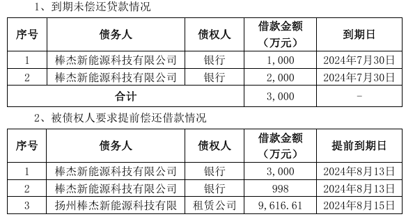 8月21日,棒杰股份發(fā)布公告稱,公司光伏板塊子公司受光伏行業(yè)競爭加劇、產(chǎn)業(yè)鏈各環(huán)節(jié)產(chǎn)品價格大幅下跌等多種因素的影響,導(dǎo)致經(jīng)營未達預(yù)期,持續(xù)虧損。2024年8月14日,公司控股二級子公司揚州棒杰新能源科技有限公司(以下簡稱“揚州棒杰)被債權(quán)人江蘇普惠健康體檢有限公司申請破產(chǎn)重整。 根據(jù)公告,目前受外部經(jīng)營環(huán)境承壓的影響,棒杰股份光伏板塊子公司部分借款被要求提前償還從而造成暫時流動性資金的緊張,致使光伏板塊部分子公司出現(xiàn)未能按時履行部分債務(wù)償還義務(wù)的情況。 經(jīng)公司相關(guān)工作人員統(tǒng)計核實收到的書面通知材料,截至2024年8月19日,公司下屬子公司在銀行、融資租賃公司等金融機構(gòu)累計逾期的借款金額合計約16,614.61萬元,占上市公司最近一期經(jīng)審計凈資產(chǎn)的15.16%。具體情況如下: