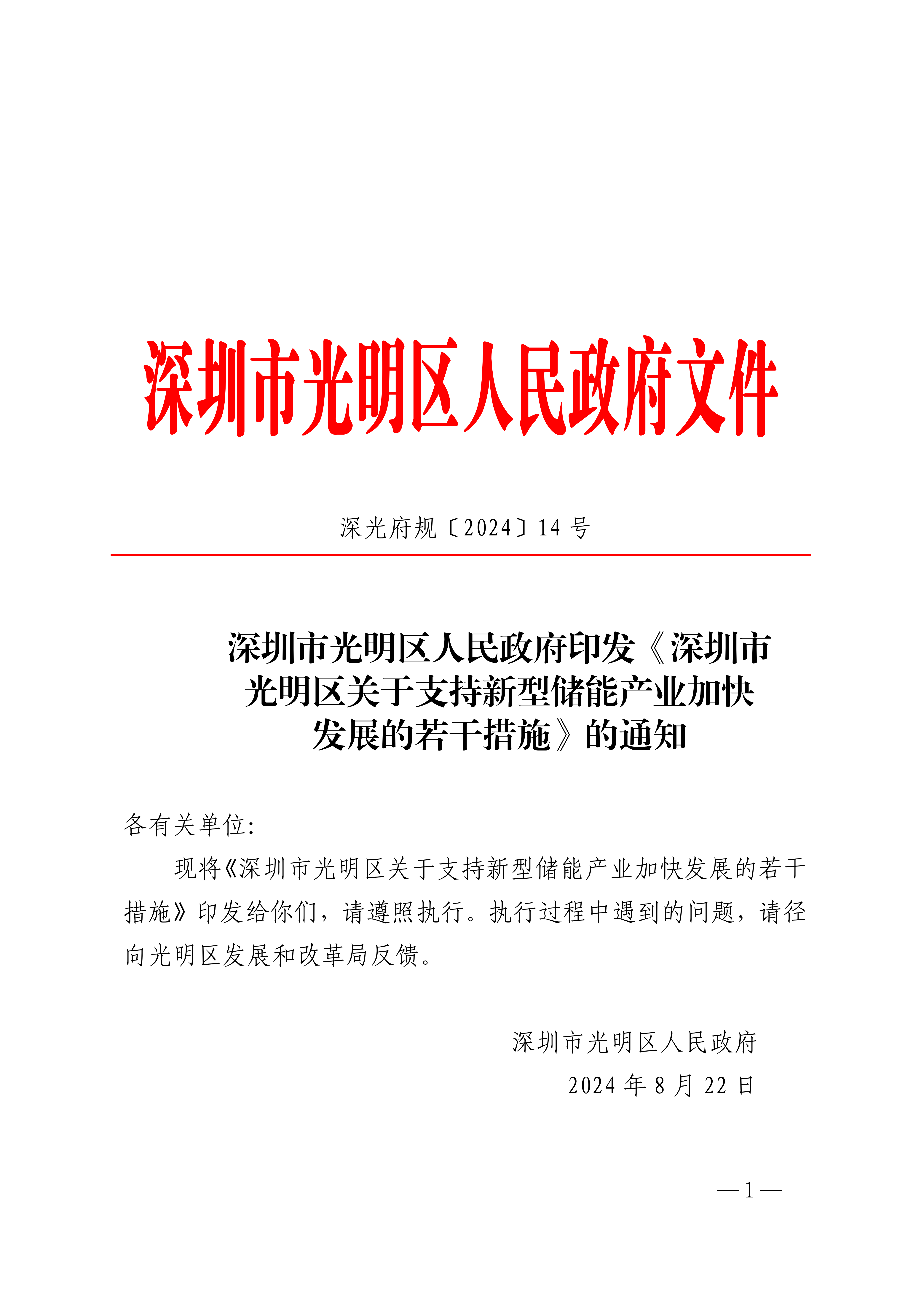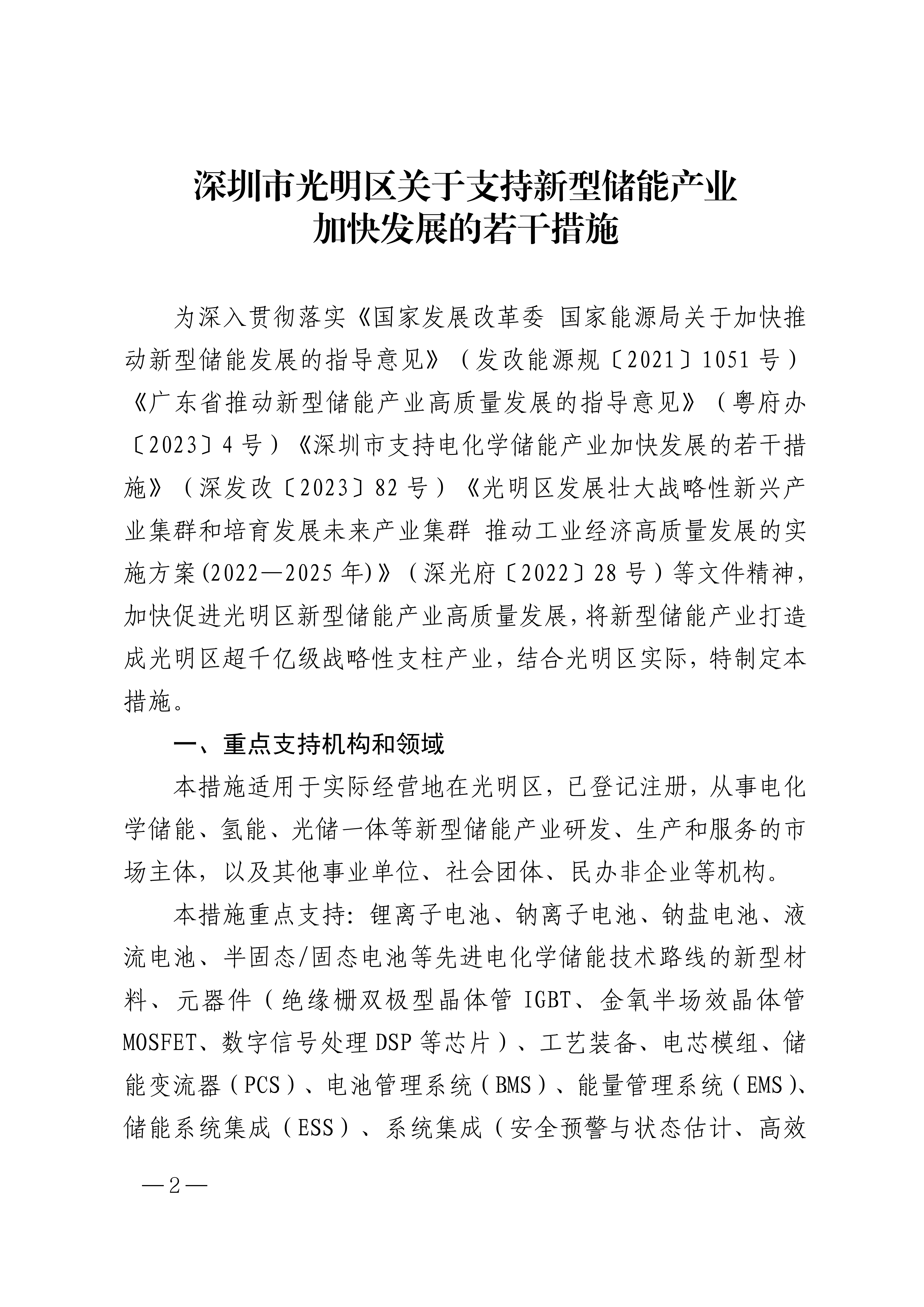 8月26日,深圳市光明區(qū)人民政府印發(fā)《深圳市光明區(qū)關于支持新型儲能產(chǎn)業(yè)加快發(fā)展的若干措施》,該措施重點支持:鋰離子電池、鈉離子電池、鈉鹽電池、液流電池、半固態(tài)/固態(tài)電池等先進電化學儲能技術路線的新型材料、元器件(絕緣柵雙極型晶體管 IGBT、金氧半場效晶體管MOSFET、數(shù)字信號處理 DSP 等芯片)、工藝裝備、電芯模組、儲能變流器(PCS)、電池管理系統(tǒng)(BMS)、能量管理系統(tǒng)(EMS)、儲能系統(tǒng)集成(ESS)、系統(tǒng)集成(安全預警與狀態(tài)估計、高效滅火及防復燃等)、建設運營(微電網(wǎng)儲能、數(shù)據(jù)中心備用電源、5G 基站備用電源、戶用儲能等)、市場服務(虛擬電廠、共享儲能、儲能大數(shù)據(jù)等)、電池回收與綜合利用(梯次利用、再生利用)等重點領域鏈條;氫制取、氫儲運、燃料電池等關鍵技術研發(fā);轄區(qū)內(nèi)光儲一體、電化學儲能、氫能等多元場景示范應用項目。 《措施》明確,鼓勵有條件的倉儲物流園區(qū)、工商業(yè)園區(qū)布局光伏建筑一體化(BIPV)、光儲充一體化、光儲直柔等示范項目,支持因地制宜、靈活多樣配建新型儲能電站、建設智能微電網(wǎng),對符合條件的示范項目按實際投資的 20%,給予最高500萬元資助。 全文如下: 深圳市光明區(qū)人民政府印發(fā)《深圳市光明區(qū)關于支持新型儲能產(chǎn)業(yè)加快發(fā)展的若干措施》的通知 各有關單位: 現(xiàn)將《深圳市光明區(qū)關于支持新型儲能產(chǎn)業(yè)加快發(fā)展的若干措施》印發(fā)給你們,請遵照執(zhí)行。執(zhí)行過程中遇到的問題,請徑向光明區(qū)發(fā)展和改革局反饋。 深圳市光明區(qū)人民政府 2024年8月22日