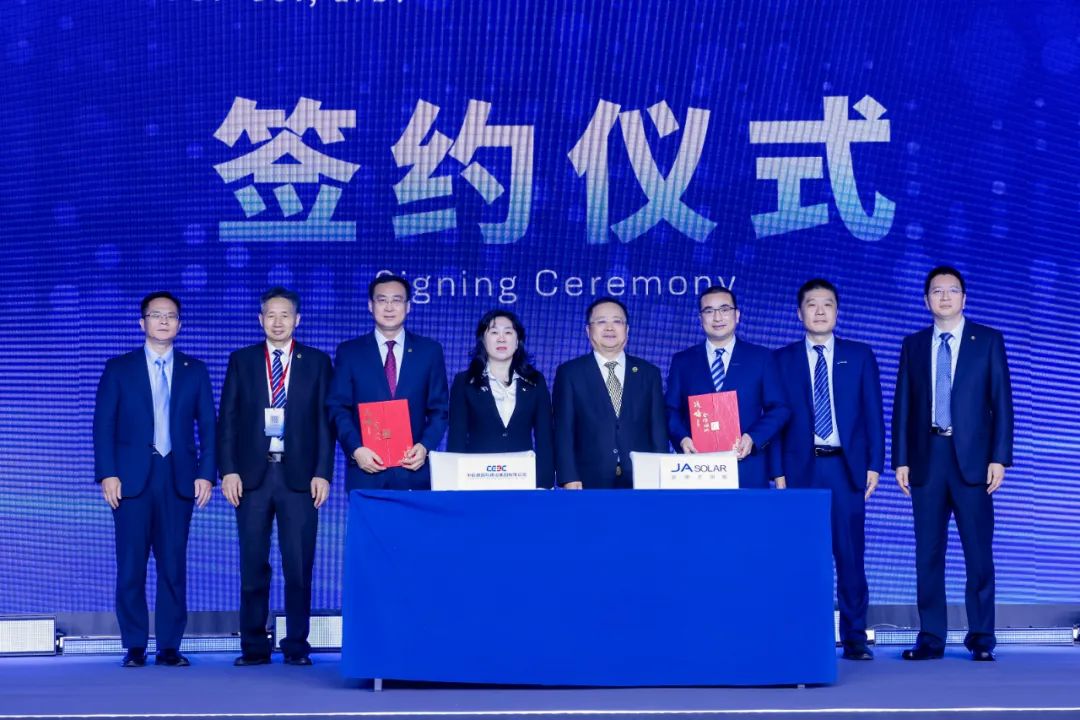 期間,聯(lián)盟內(nèi)部協(xié)同的項(xiàng)目規(guī)模和質(zhì)量不斷提升,協(xié)作的廣度和深度不斷加大,運(yùn)轉(zhuǎn)的體制和機(jī)制不斷升級(jí),使諸多聯(lián)盟成員企業(yè)持續(xù)受益,有力促進(jìn)了技術(shù)創(chuàng)新成果的轉(zhuǎn)化,為推動(dòng)全球能源革命向縱深發(fā)展做出了積極貢獻(xiàn)。晶澳科技愿與中國(guó)能建及新能源國(guó)際投資聯(lián)盟的成員企業(yè)一起,深度參與到聯(lián)盟產(chǎn)業(yè)鏈、經(jīng)濟(jì)鏈、創(chuàng)新鏈的緊密結(jié)合當(dāng)中,共同為全球社會(huì)奉獻(xiàn)綠色低碳能源,為各國(guó)繁榮發(fā)展貢獻(xiàn)智慧與力量。 順應(yīng)致辭中對(duì)深化合作、開(kāi)放共贏的美好期待,開(kāi)幕式結(jié)束后,在聯(lián)盟的促成下,大會(huì)隆重舉辦了晶澳科技與中國(guó)能建國(guó)際集團(tuán)的戰(zhàn)略簽約儀式。晶澳科技執(zhí)行總裁楊?lèi)?ài)青與中國(guó)能建國(guó)際集團(tuán)董事長(zhǎng)呂澤翔分別代表雙方簽約。中國(guó)能源建設(shè)集團(tuán)有限公司總會(huì)計(jì)師李麗娜,中國(guó)機(jī)電產(chǎn)品進(jìn)出口商會(huì)副會(huì)長(zhǎng)石永紅,中能建海外投資有限公司董事長(zhǎng)林曉丹,晶澳科技副總裁、全球市場(chǎng)營(yíng)銷(xiāo)中心總經(jīng)理祝道誠(chéng)等嘉賓出席儀式并見(jiàn)簽。