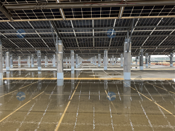 中廣核萊州土山600兆瓦“鹽光互補”項目220千伏升壓站 中廣核新能源山東分公司總經(jīng)理姜通海表示,該項目在鹽池區(qū)域上鋪設(shè)光伏板,涉及鹽田面積約9765.2畝,在確保曬鹽產(chǎn)量、質(zhì)量不變的前提下對光照資源綜合利用,實現(xiàn)了“水上光伏發(fā)電、水面蒸發(fā)制鹵、水下水產(chǎn)養(yǎng)殖”的“鹽光互補”新型復(fù)合產(chǎn)業(yè)模式,成功打造了“一地多用”的標(biāo)桿示范,實現(xiàn)了土地資源利用最大化。 據(jù)介紹,該項目光伏組件采用雙面雙玻技術(shù),鹵水在太陽光的照射下反射光線至組件背面,可為項目額外提高2%至3%以上的發(fā)電效益。光伏組件存在熱效應(yīng),能顯著提升鹽池溫度,對于鹵水濃縮十分有利,實現(xiàn)了制鹽與光伏發(fā)電的互補共贏。光伏組件的熱效應(yīng)為鹽田內(nèi)的鹵水池營造出鹵水蟲的天然生長環(huán)境,可為水產(chǎn)養(yǎng)殖提供高品質(zhì)的生物餌料。