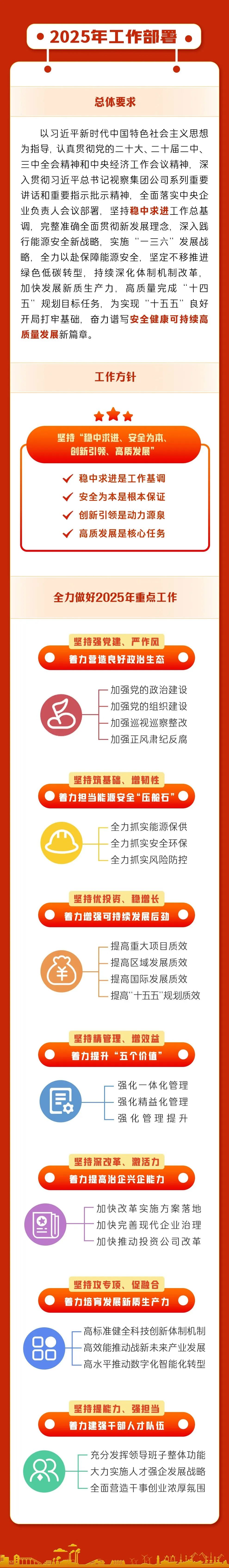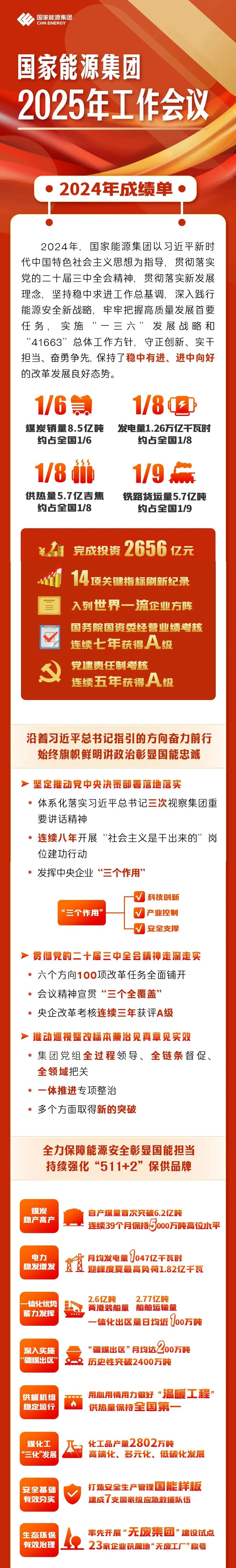 1月16日,國家能源集團召開2025年工作會議。會議總結(jié)了2024年集團工作成果,并對2025年多項工作展開部署。 2024年,國家能源集團發(fā)電量1.26萬億千瓦時,約占全國1/8;月均發(fā)電量1047億千瓦時,迎峰度夏最高負荷1.82億千瓦。 在綠色轉(zhuǎn)型工作中,可再生能源發(fā)展提速進位??稍偕茉撮_工、投產(chǎn)容量雙雙歷史性突破“3000萬+”,裝機占比超過40%、整體規(guī)模較“十三五”末翻一番、提前一年實現(xiàn)“十四五”目標;水電裝機突破2000萬千瓦,常規(guī)水電在建規(guī)模824萬千瓦、位居全國第一;新能源開工3118萬千瓦、投產(chǎn)2773萬千瓦,投產(chǎn)規(guī)模創(chuàng)歷史新高。重點項目囊括瑪爾擋水電站一年五投、300萬千瓦蒙西藍海光優(yōu)投產(chǎn)。 在2025年工作部署上,提出要以習(xí)近平新時代中國特色社會主義思想為指導(dǎo),認真貫徹黨的二十大、二十屆二中、三中全會精神和中央經(jīng)濟工作會議精神,深入貫徹習(xí)近平總書記視察集團公司系列重要講話和重要指示批示精神,全面落實中央企業(yè)負責(zé)人會議部署,堅持穩(wěn)中求進工作總基調(diào),完整準確全面貫徹新發(fā)展理念,深入踐行能源安全新戰(zhàn)略,實施“一三六”發(fā)展戰(zhàn)略,全力以赴保障能源安全,"堅定不移推進綠色低碳轉(zhuǎn)型,持續(xù)深化體制機制改革加快發(fā)展新質(zhì)生產(chǎn)力,高質(zhì)量完成“十四五”規(guī)劃目標任務(wù),為實現(xiàn)“十五五”良好開局打牢基礎(chǔ),奮力譜寫安全健康可持續(xù)高質(zhì)量發(fā)展新篇章。 并提出要著力擔(dān)當能源安全“壓艙石:全力抓實能源保供;全力抓實安全環(huán)保;全力抓實風(fēng)險防控。著力增強可持統(tǒng)發(fā)展后勁:提高重大項目質(zhì)效;提高區(qū)域發(fā)展質(zhì)效;提高國際發(fā)展質(zhì)效;提高“十五五”規(guī)劃質(zhì)效。 附國家能源集團“一圖讀懂2025年工作會議”