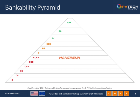 近日,PV Tech發(fā)布2024 Q4 ModuleTech可融資性評級報告,漢伏能源憑借其在700W+高效組件技術(shù)的領(lǐng)先地位、持續(xù)增長的市場份額、穩(wěn)定的財務(wù)狀況和卓越的智造能力首次上榜便斬獲CCC+評級。此次上榜是漢伏能源在全球化布局與綜合能力提升上的重要階段性成果,也是品牌價值新的里程碑。