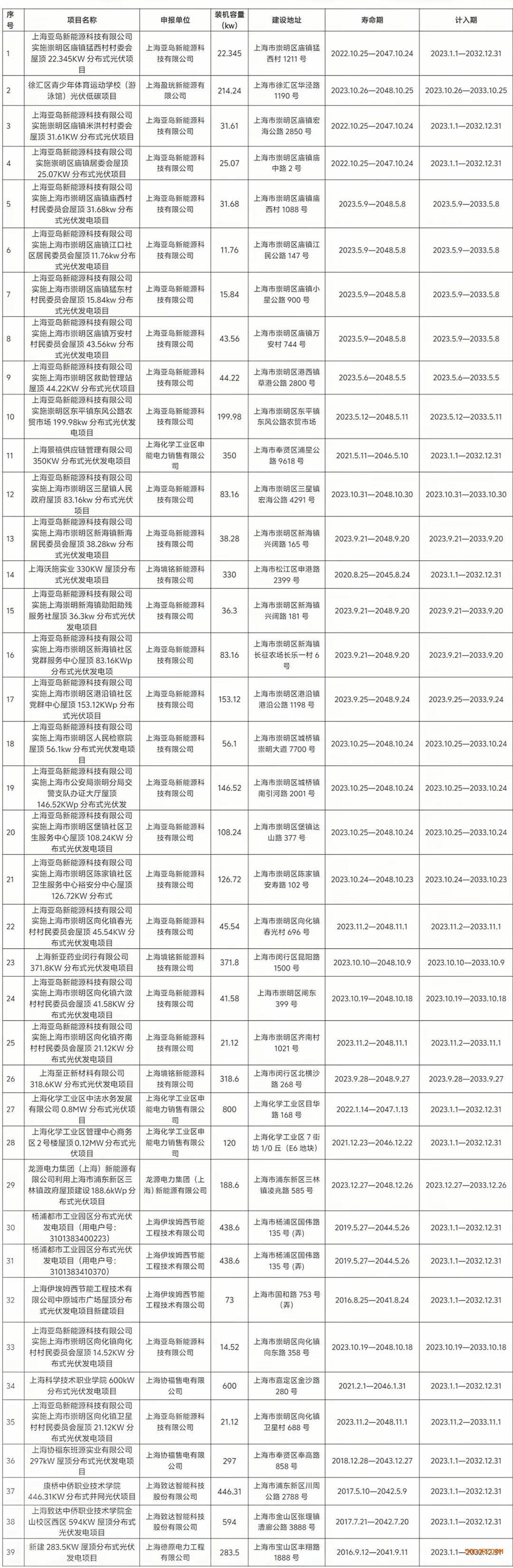 根據(jù)《上海市碳普惠管理辦法(試行)》《上海市碳普惠減排項目和減排場景開發(fā)與申請指南(試行)》等有關(guān)文件,現(xiàn)將上海亞島新能源科技有限公司、上海化學(xué)工業(yè)區(qū)申能電力銷售有限公司等分布式光伏發(fā)電減排項目予以公布。 附件:上海碳普惠分布式光伏發(fā)電第九批減排項目清單 上海市生態(tài)環(huán)境局 2025年3月10日 第九批分布式光伏發(fā)電碳普惠減排項目清單