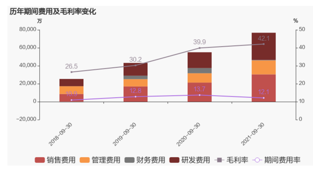 公司2021三季度營業(yè)成本36.7億,同比增長51.9%,低于營業(yè)收入57.8%的增速,導(dǎo)致毛利率上升2.2%。期間費(fèi)用率為12.1%,較去年下降1.6%,費(fèi)用控制合理。經(jīng)營性現(xiàn)金流由16.9億下降至-9億,同比下降153.3%。
